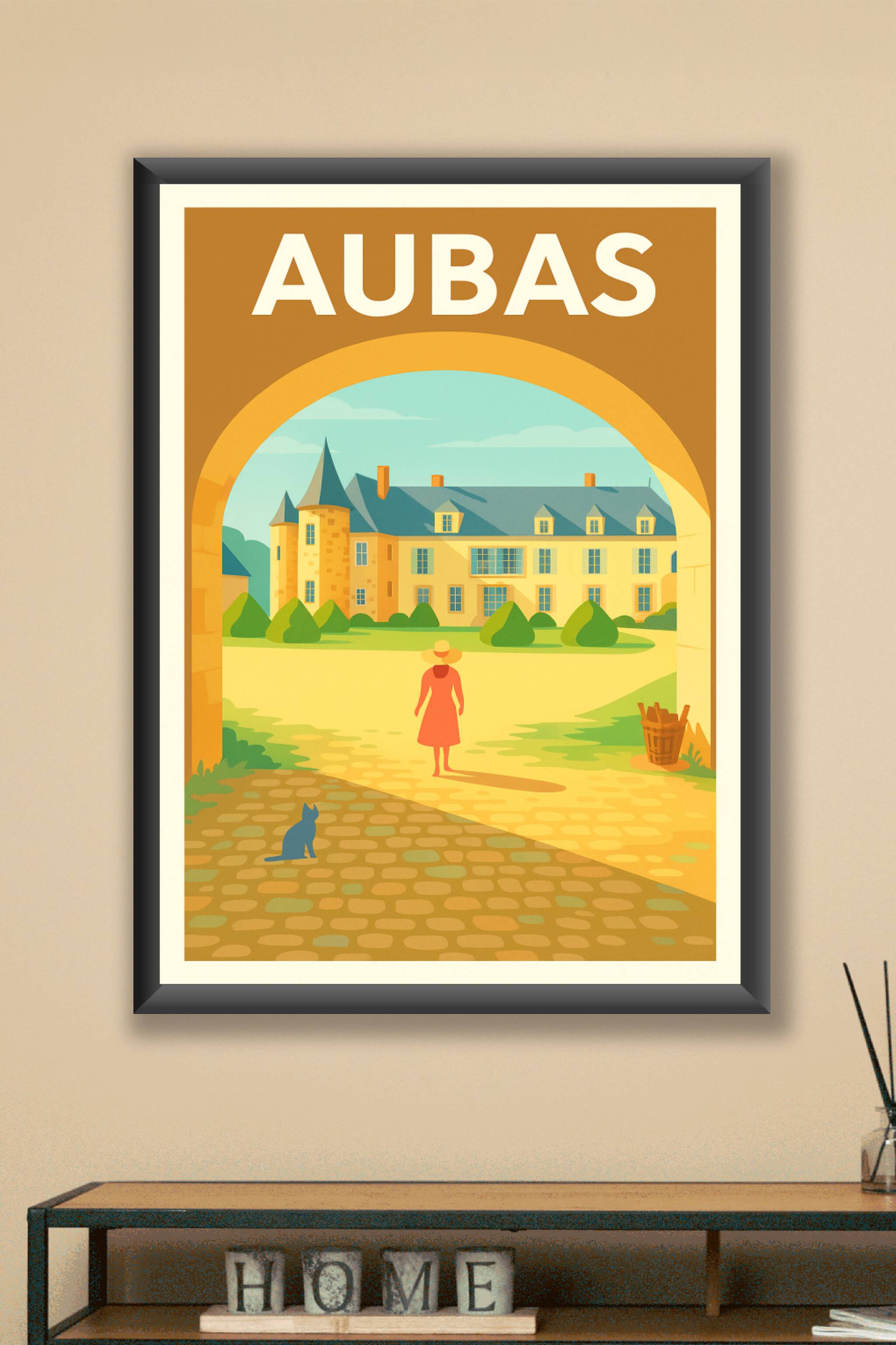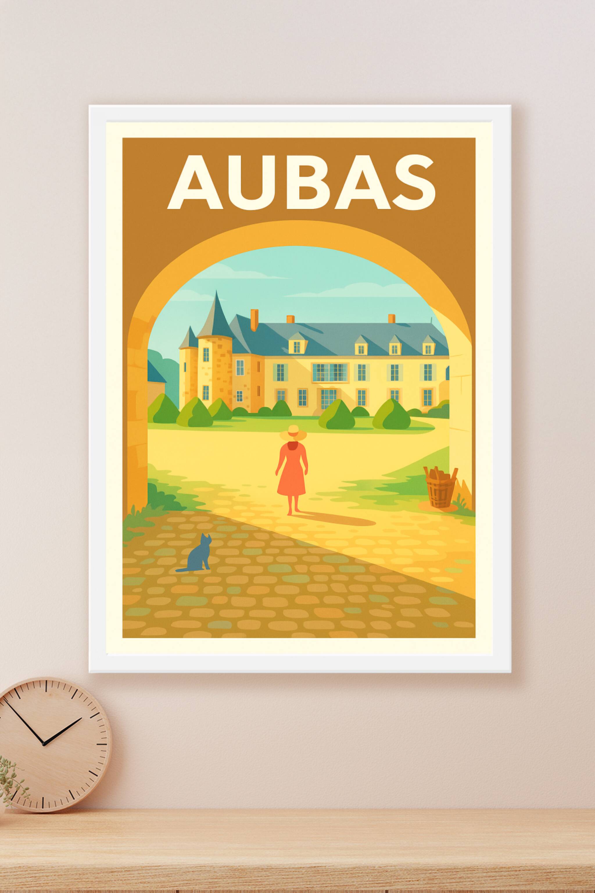 Découvrez la sérénité d'Aubas à travers cette affiche illustrée au style vintage, qui met en scène un château majestueux baigné de lumière dorée so...