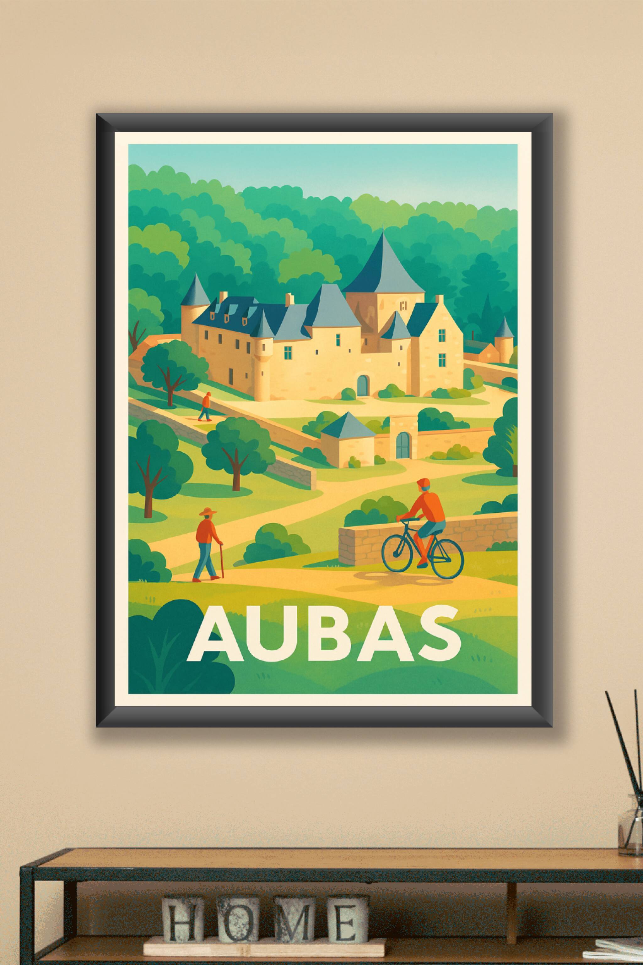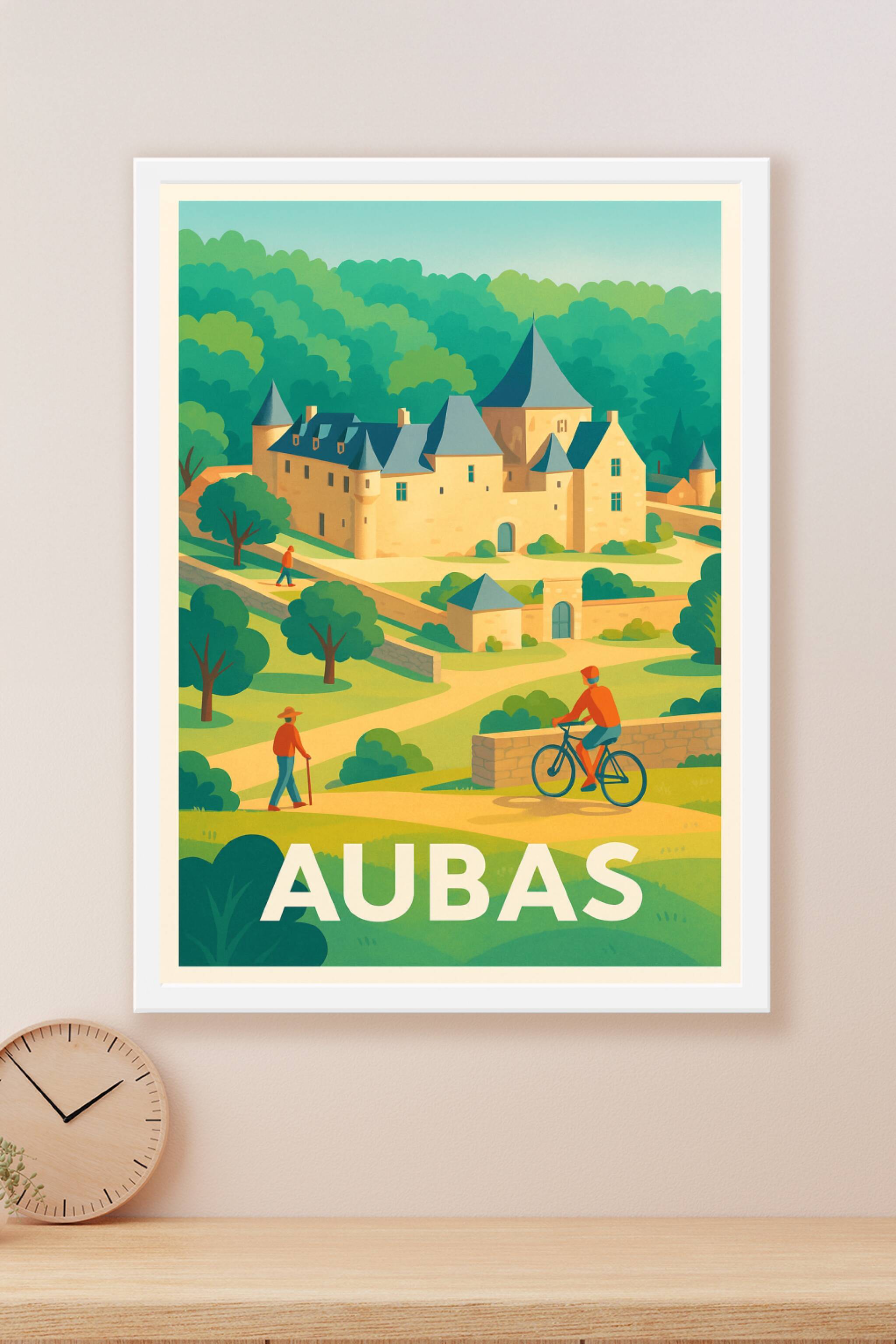 Découvrez l'atmosphère paisible et verdoyante d'Aubas avec cette affiche illustrée mettant en scène un château typique entouré de nature luxuriante...