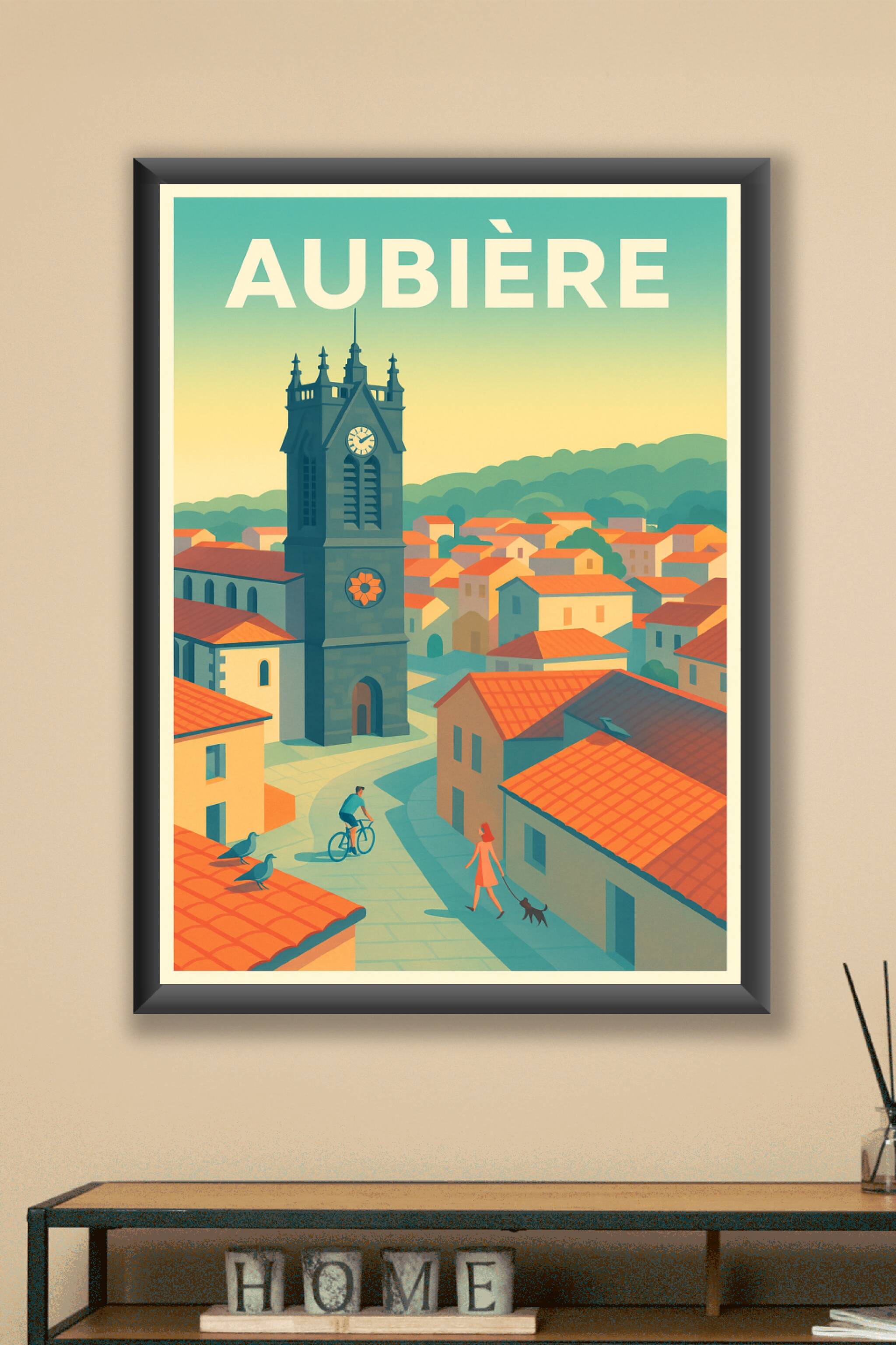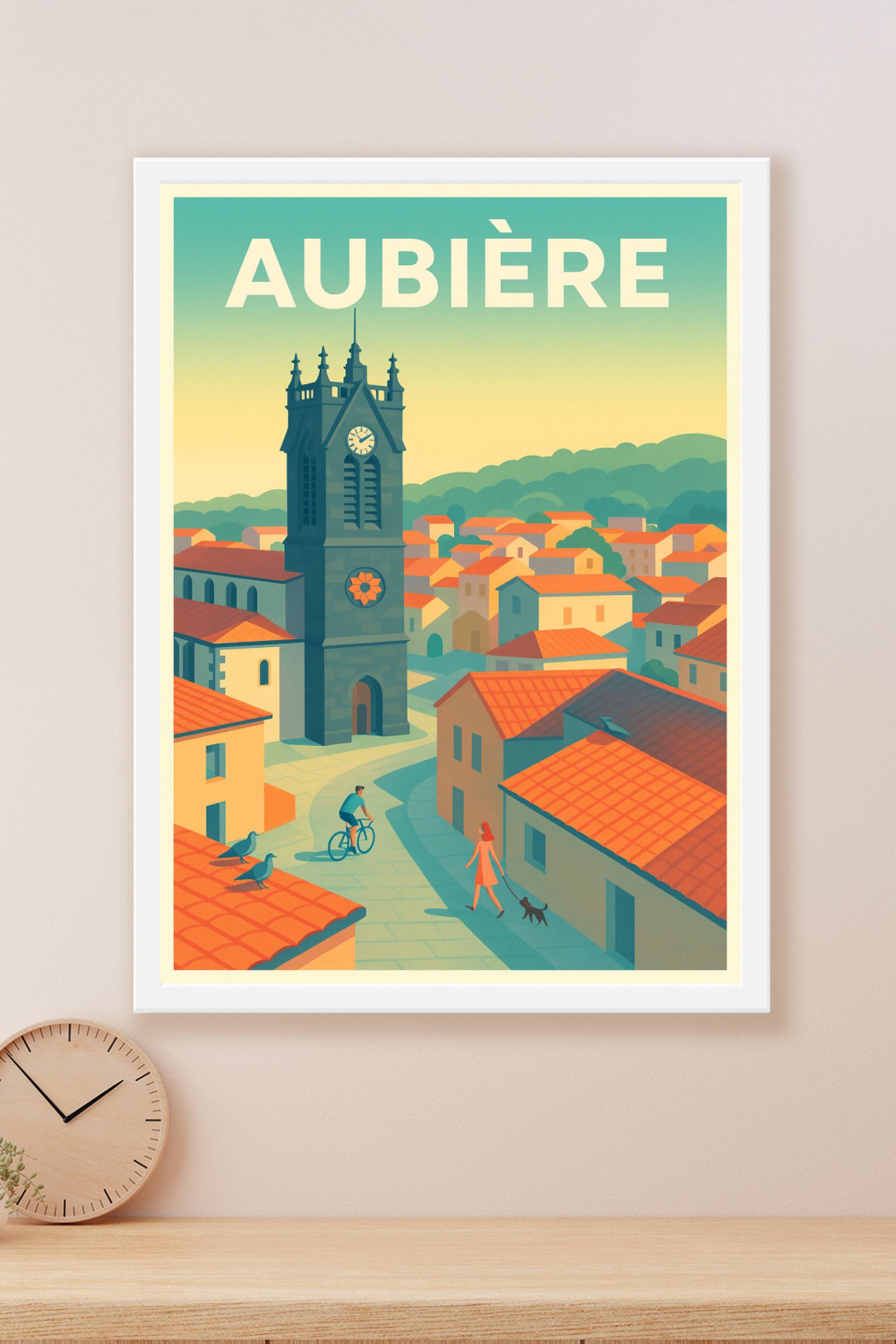 Découvrez Aubière à travers cette affiche illustrée pleine de sérénité, mettant en avant son clocher emblématique et ses toits rouges baignés de lu...