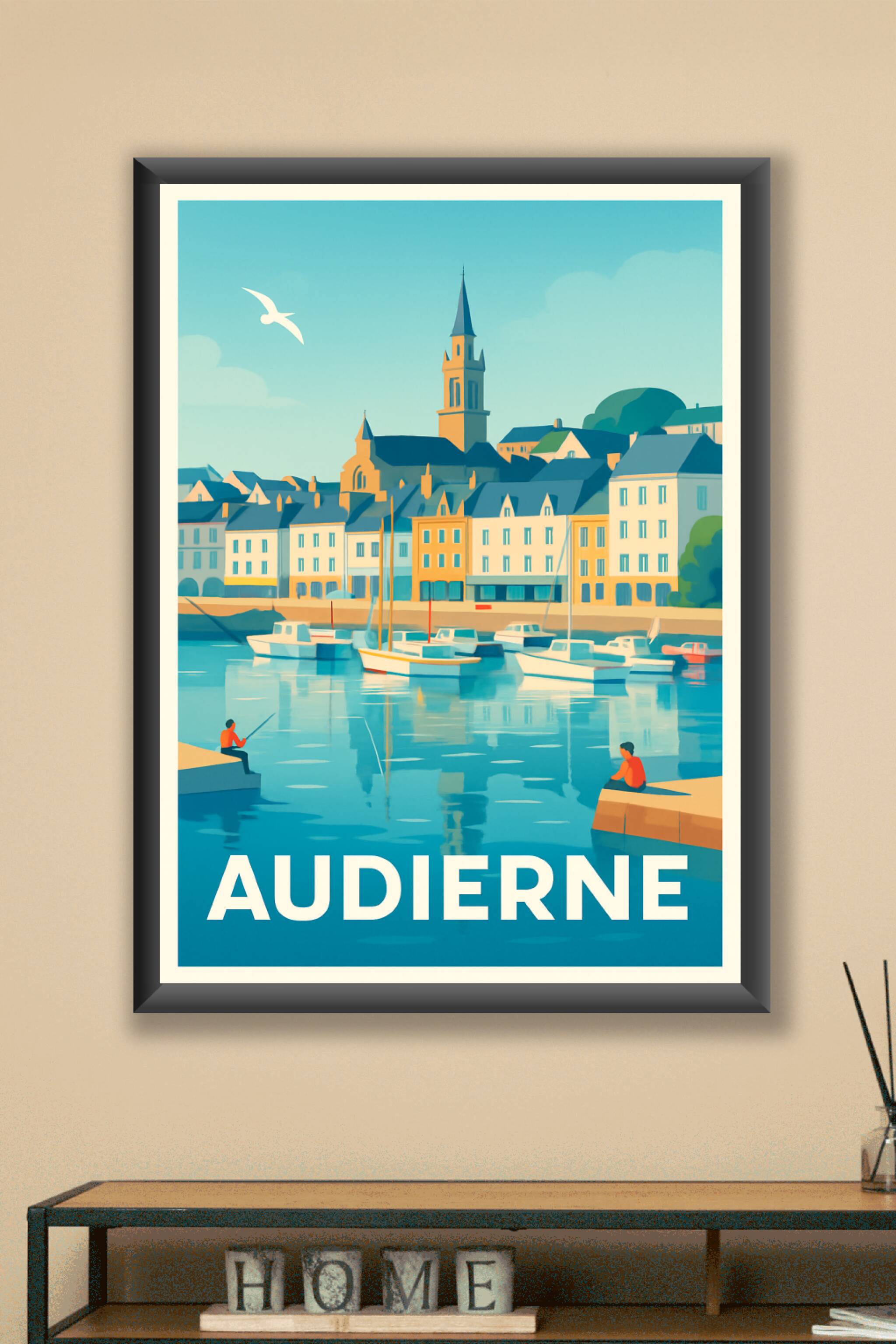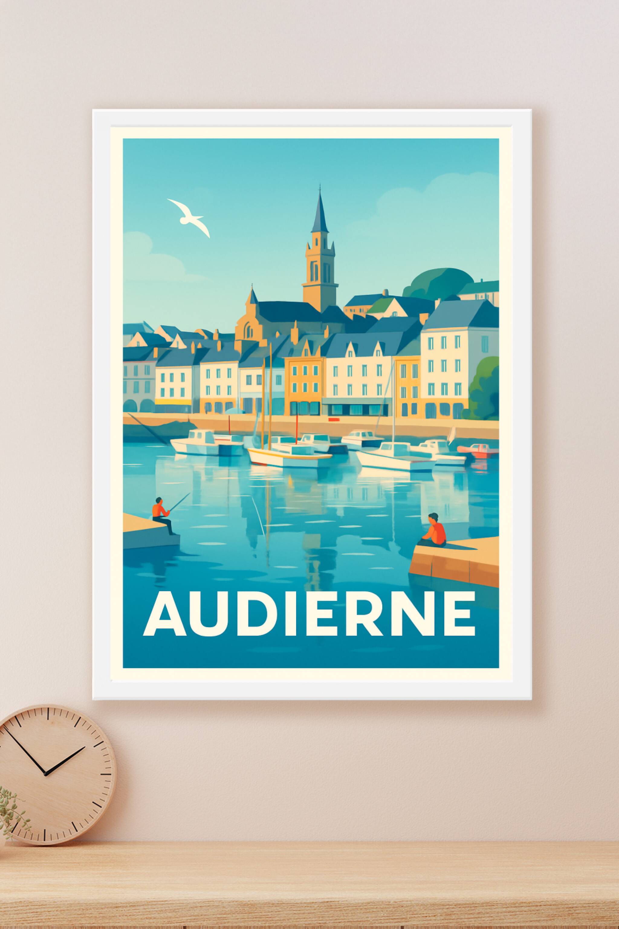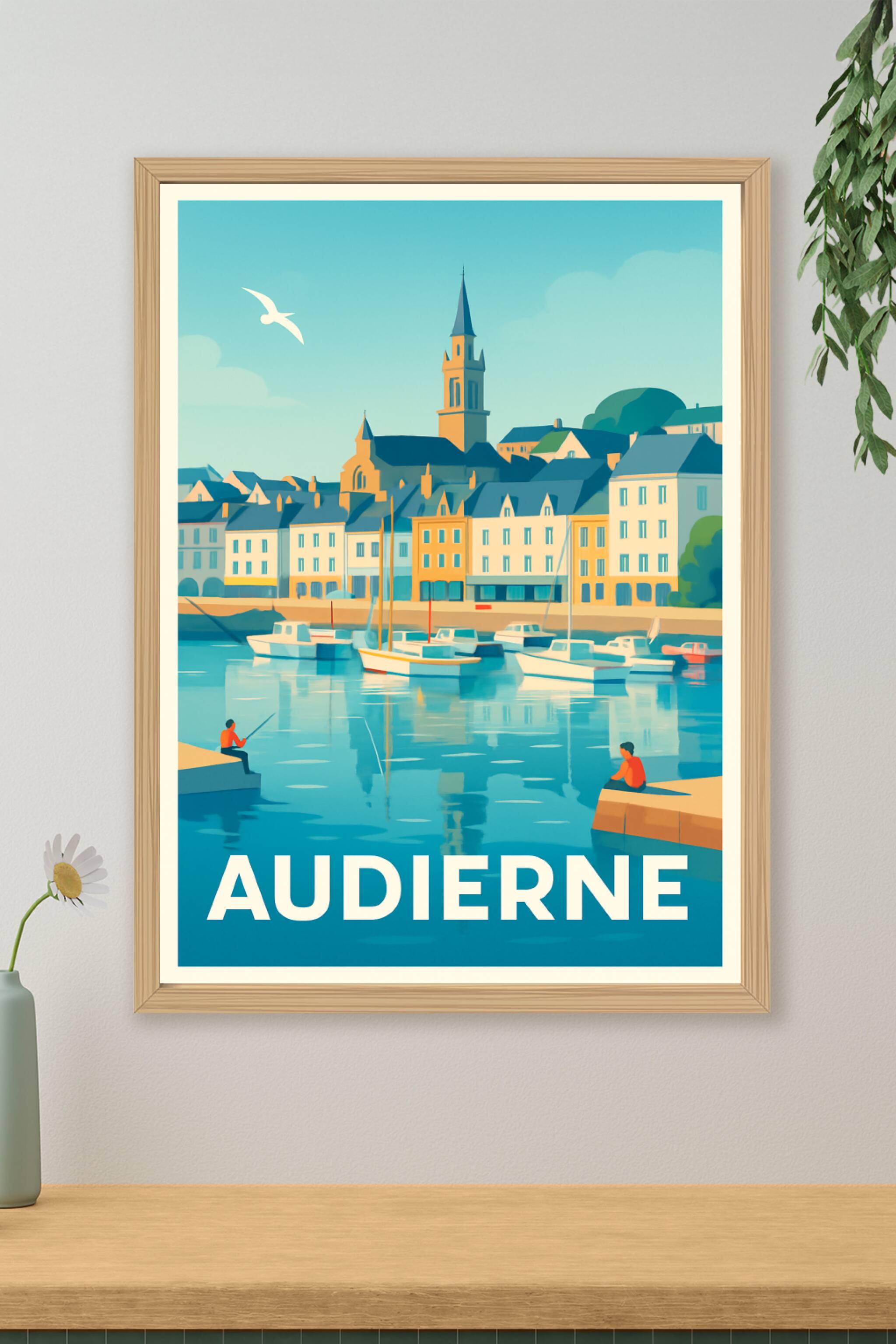 Découvrez le charme apaisant d'Audierne avec cette affiche illustrée représentant son port pittoresque et ses maisons typiques baignées de lumière ...
