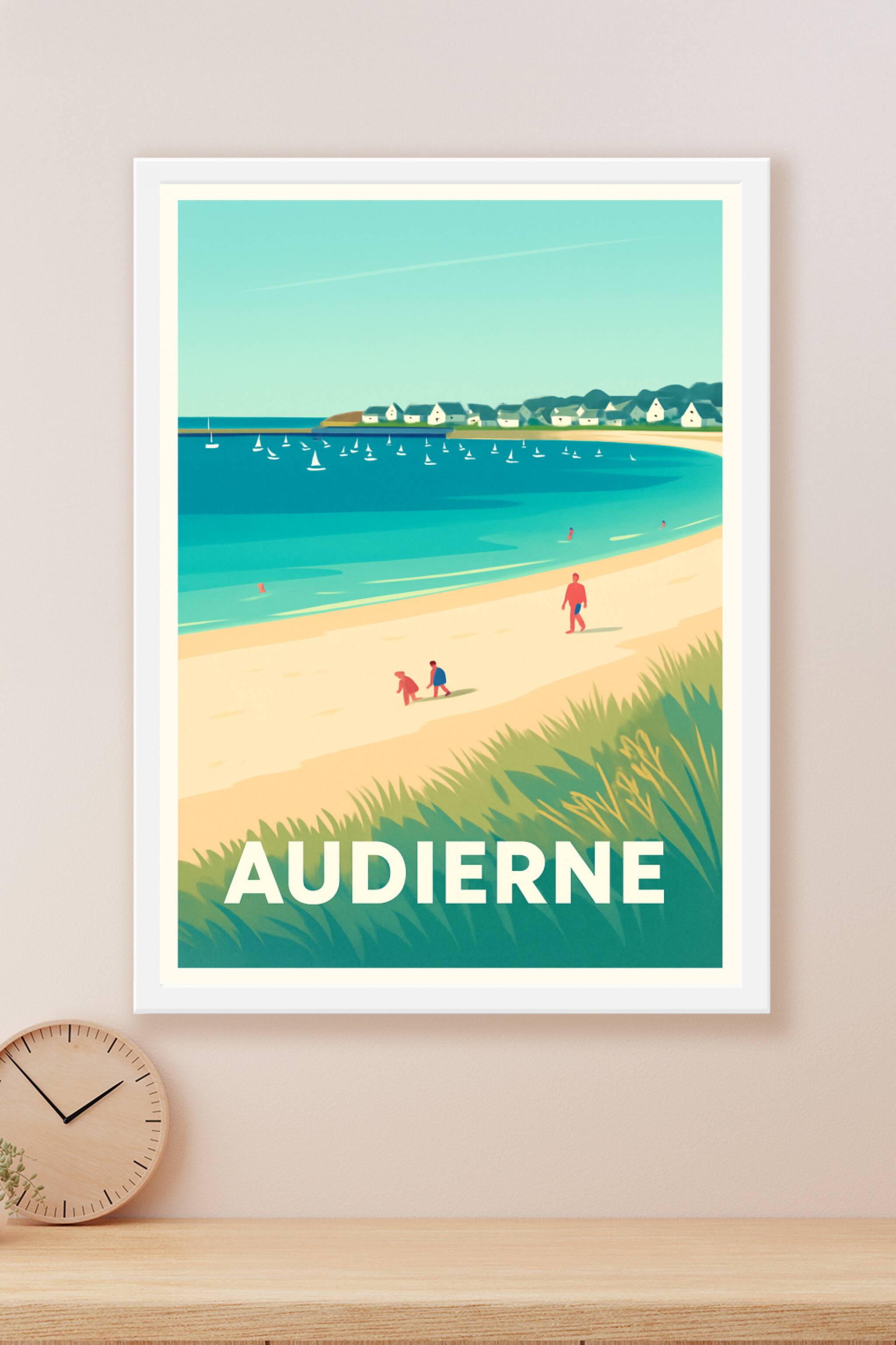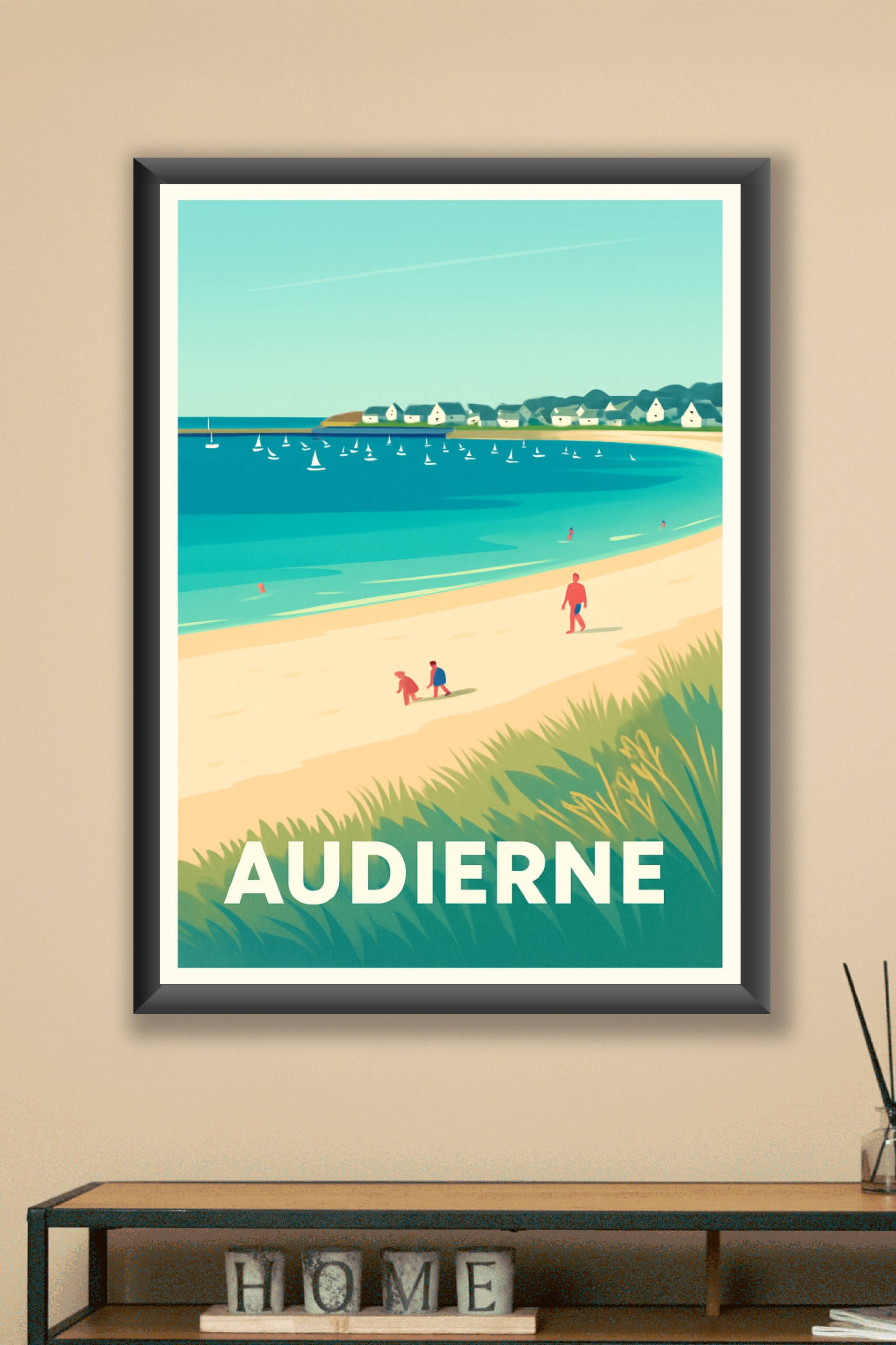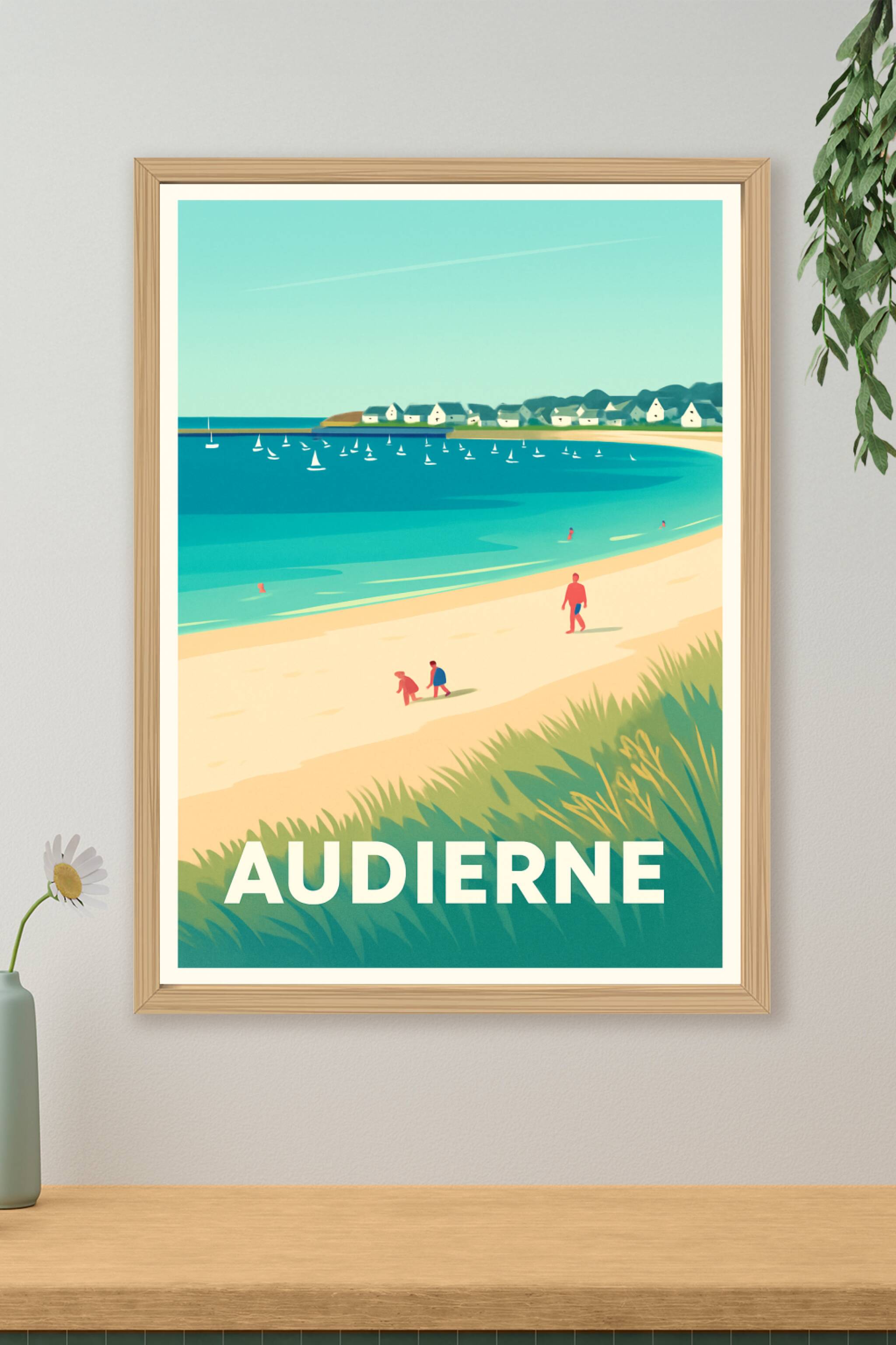 Découvrez la douceur de vivre d'Audierne avec cette affiche illustrée qui capture une plage paisible bordée de maisons typiques et de voiliers sur ...