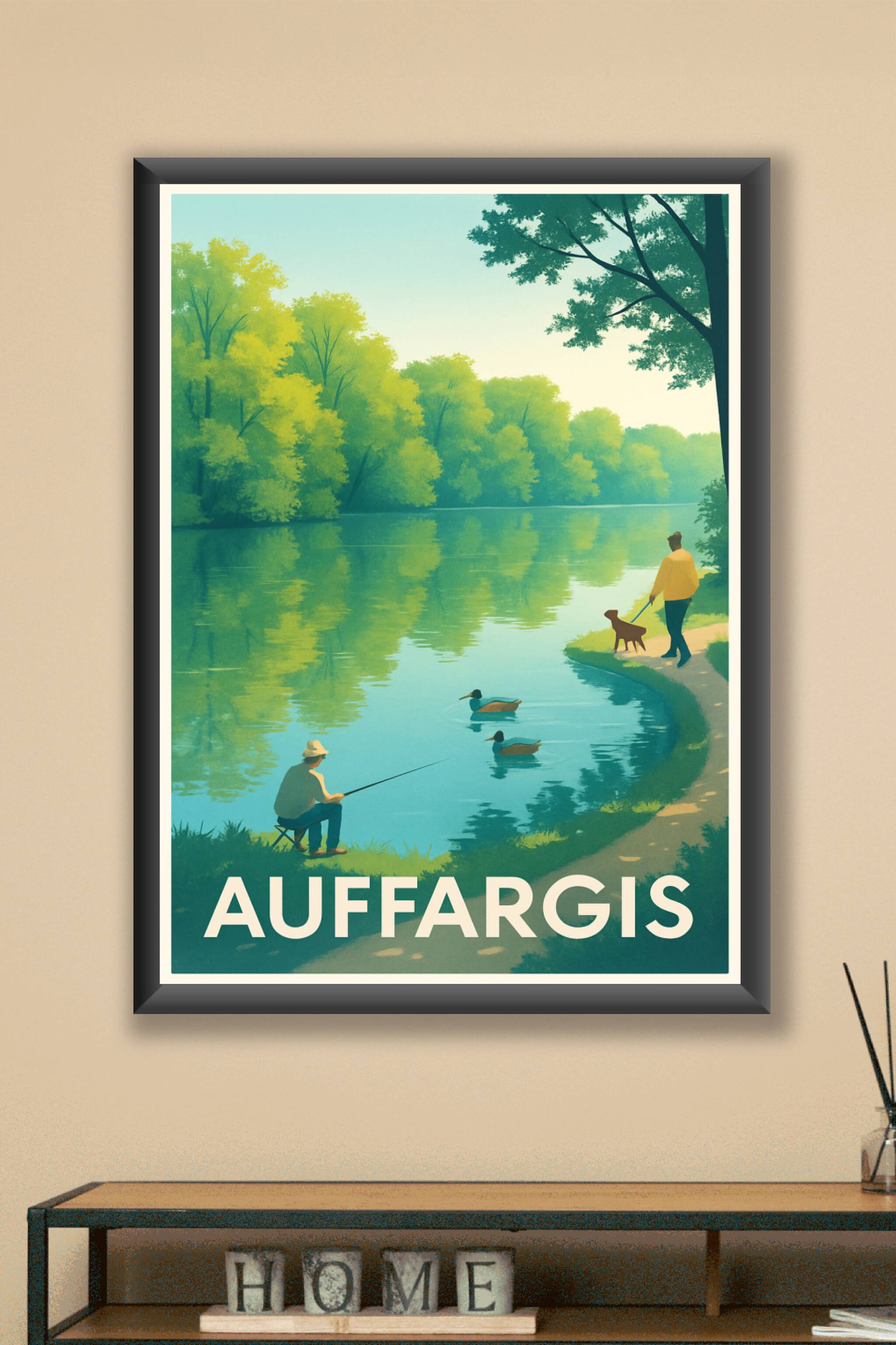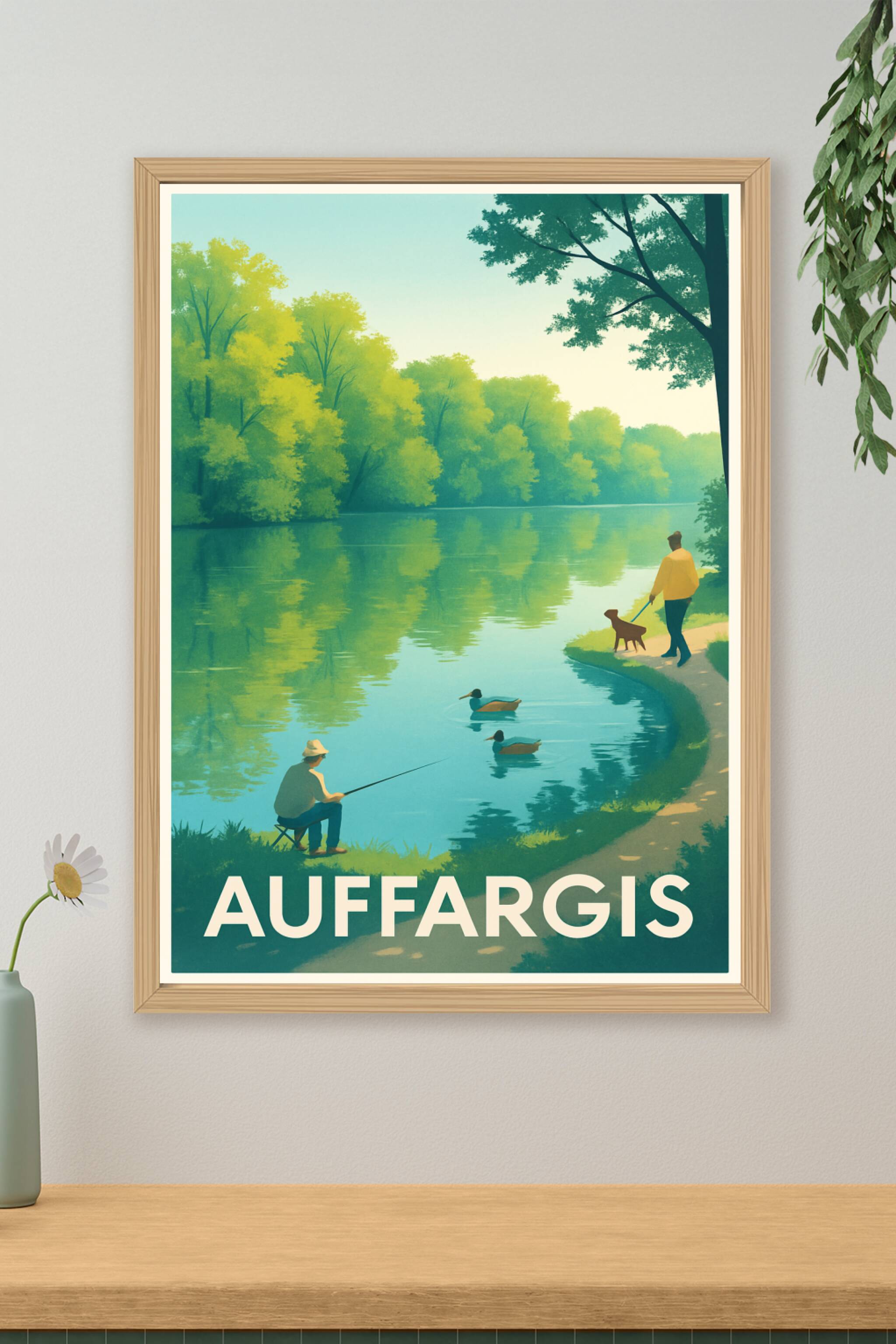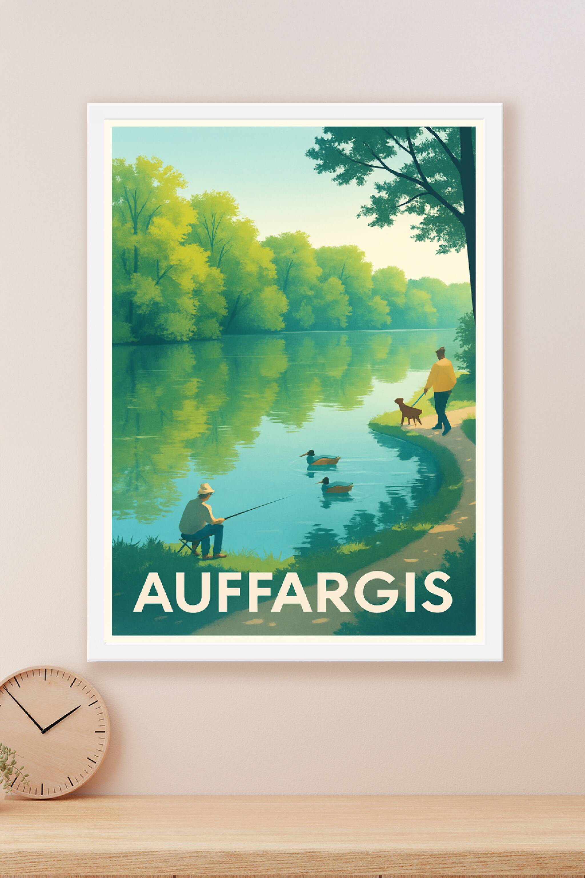 Découvrez la tranquillité et la beauté naturelle d'Auffargis avec cette affiche illustrée qui capture un instant paisible au bord d'un plan d'eau, ...
