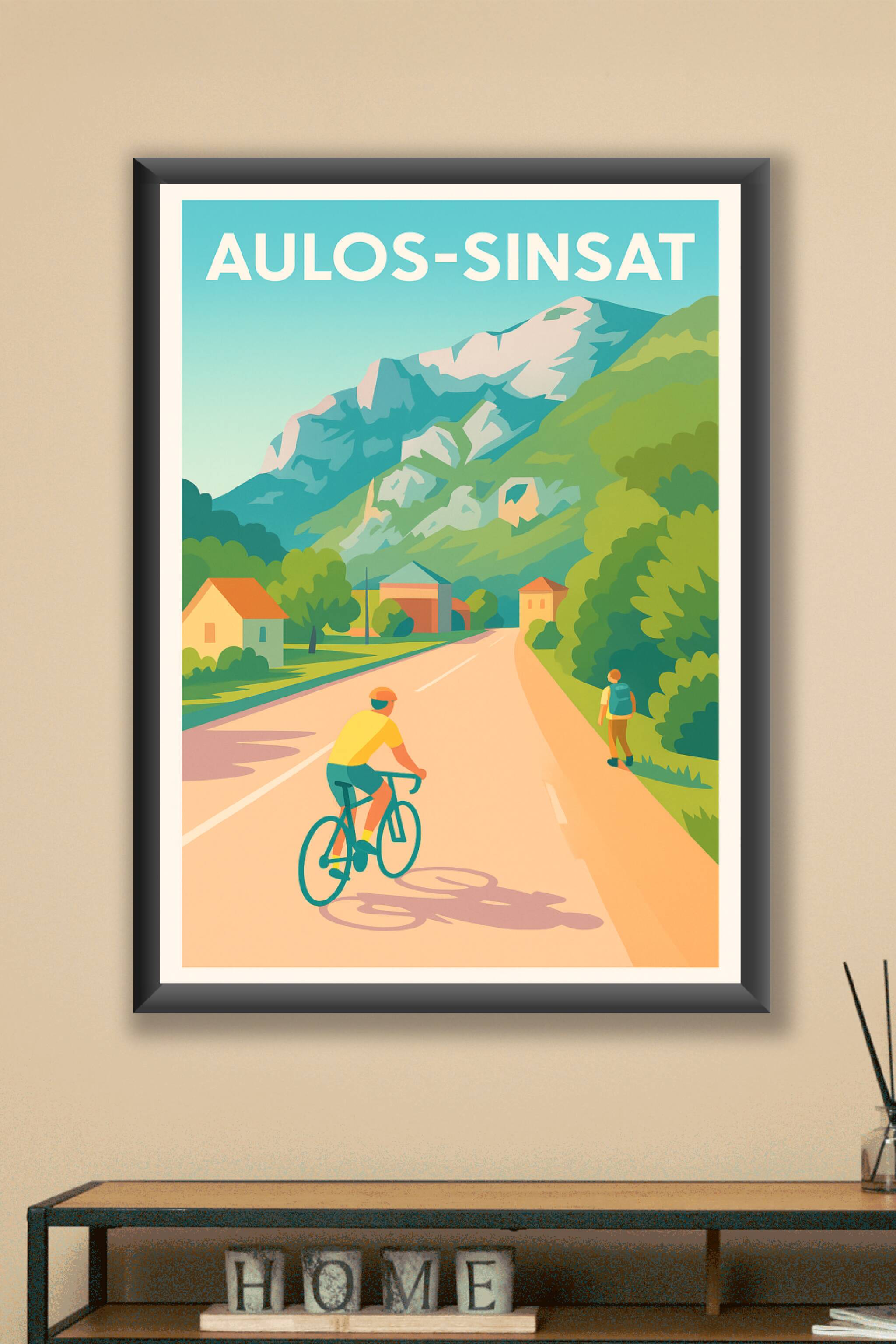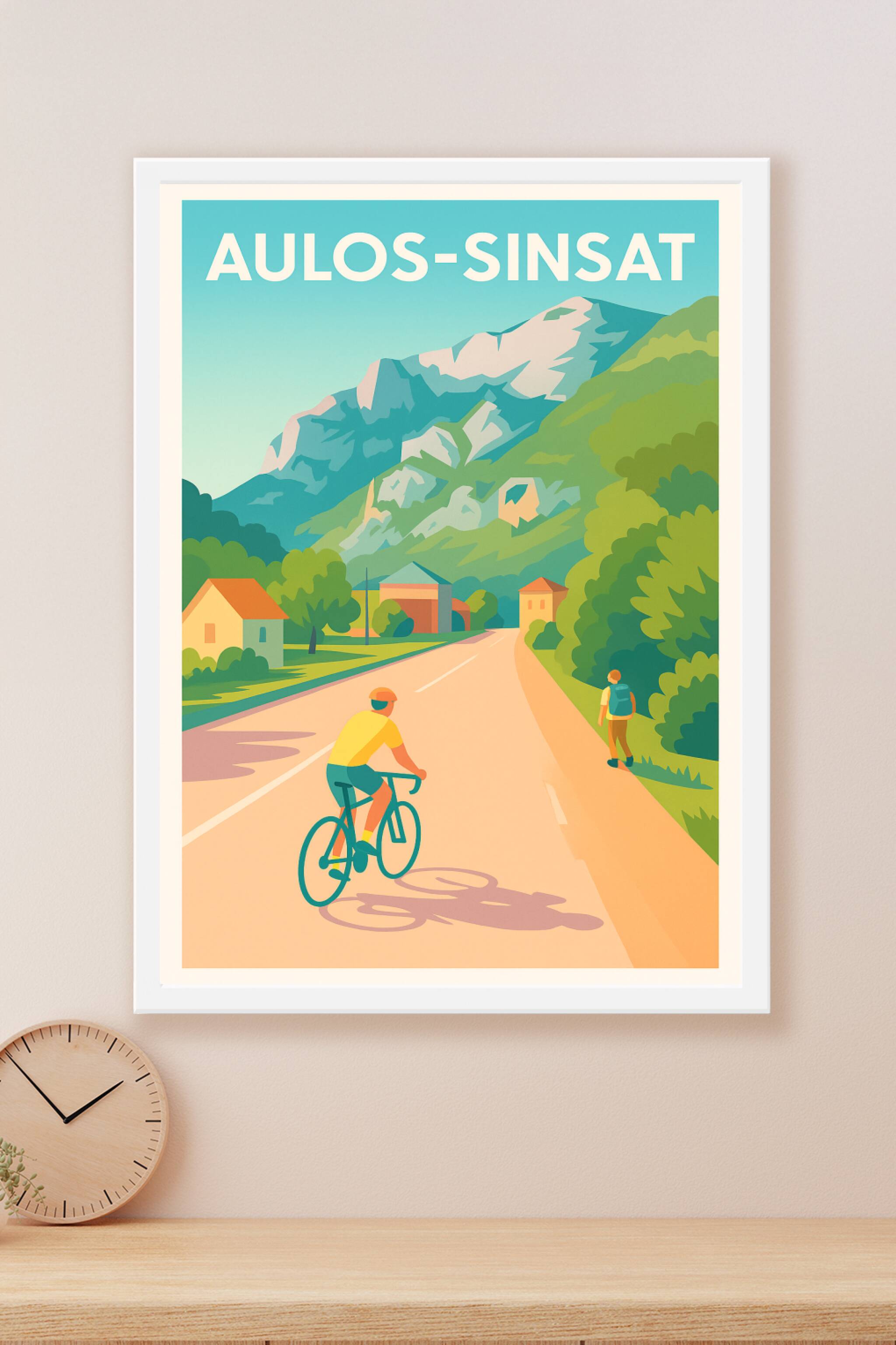 Découvrez la beauté tranquille d'Aulos-Sinsat avec cette affiche stylisée qui met en scène une promenade à vélo dans un paysage montagneux serein e...