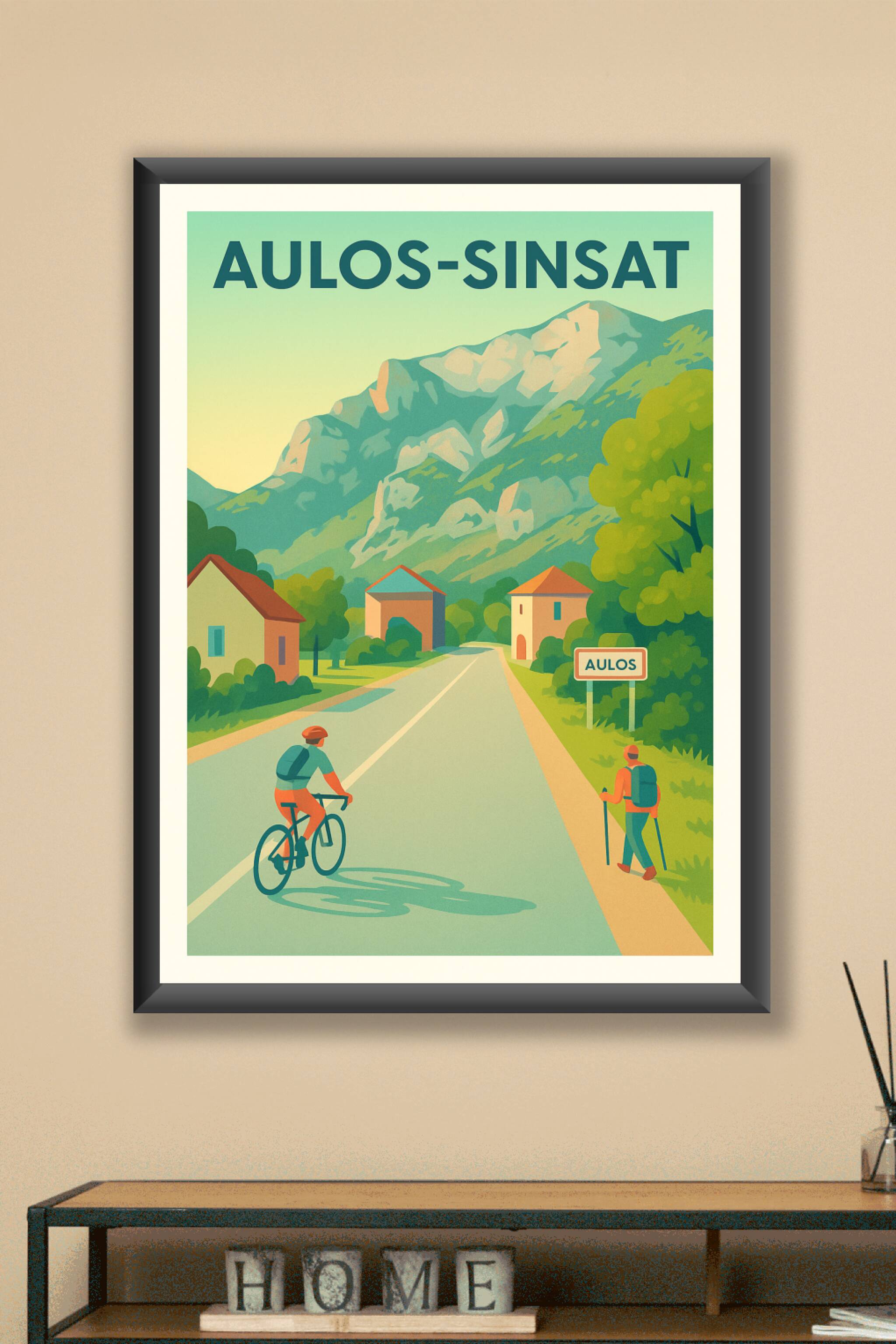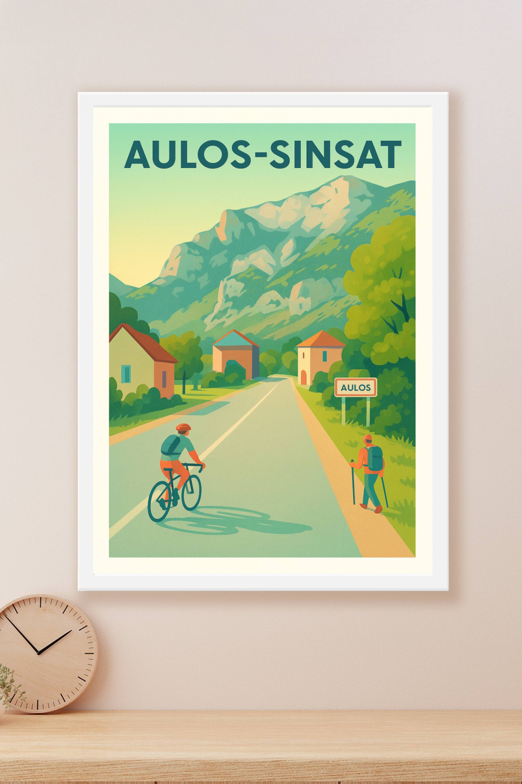 Découvrez la sérénité des Pyrénées avec cette affiche illustrée d'une route paisible à Aulos-Sinsat, où cyclistes et randonneurs partagent un paysa...