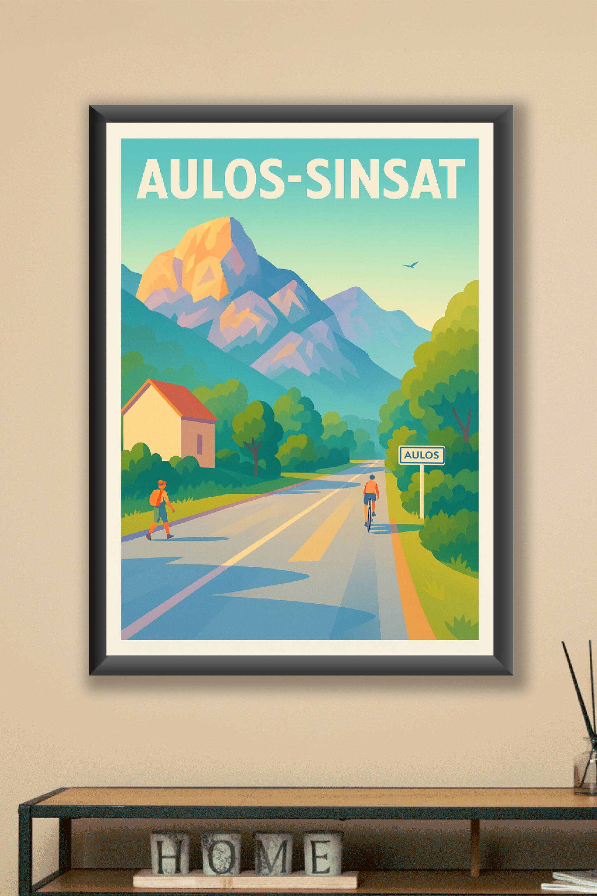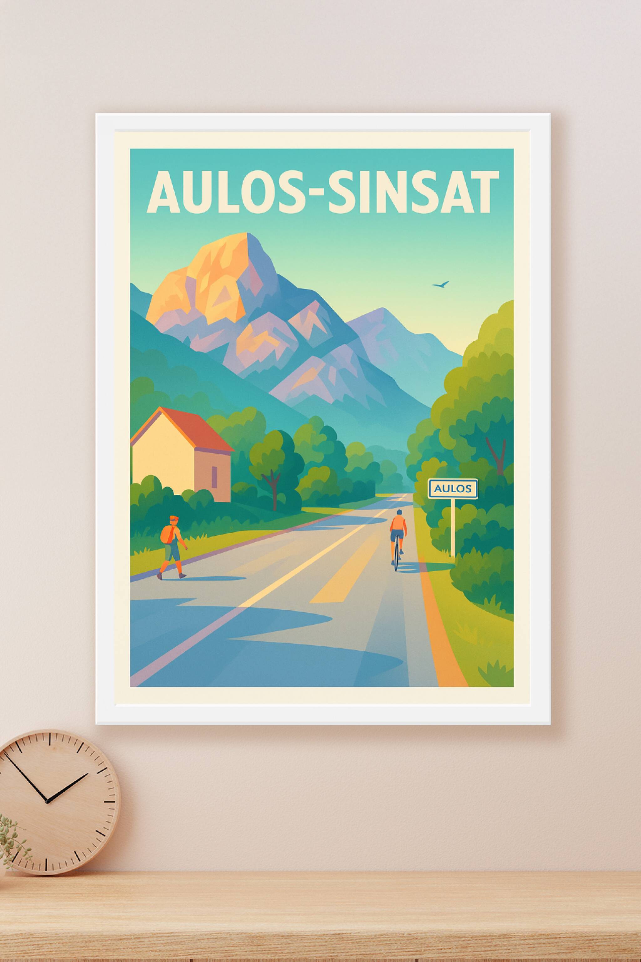 Découvrez l'affiche Aulos-Sinsat qui capture avec douceur et couleurs l'atmosphère paisible d'un village montagneux où nature et activité en plein air se mêlent harmonieusement. Ce poster, stylisé et lumineux, invite à l'évasion et à la contemplation des paysages alpins entre sentiers, collines et cimes baignées de soleil. Imprimée en tirage "Fine Art" sur un papier 305g coton d'exception, cette affiche propose une qualité d'impression irréprochable pour sublimer votre intérieur. Disponible en formats A1 à A4, avec ou sans cadre, elle constituent un choix idéal pour les amoureux des panoramas naturels et une décoration murale élégante et durable.