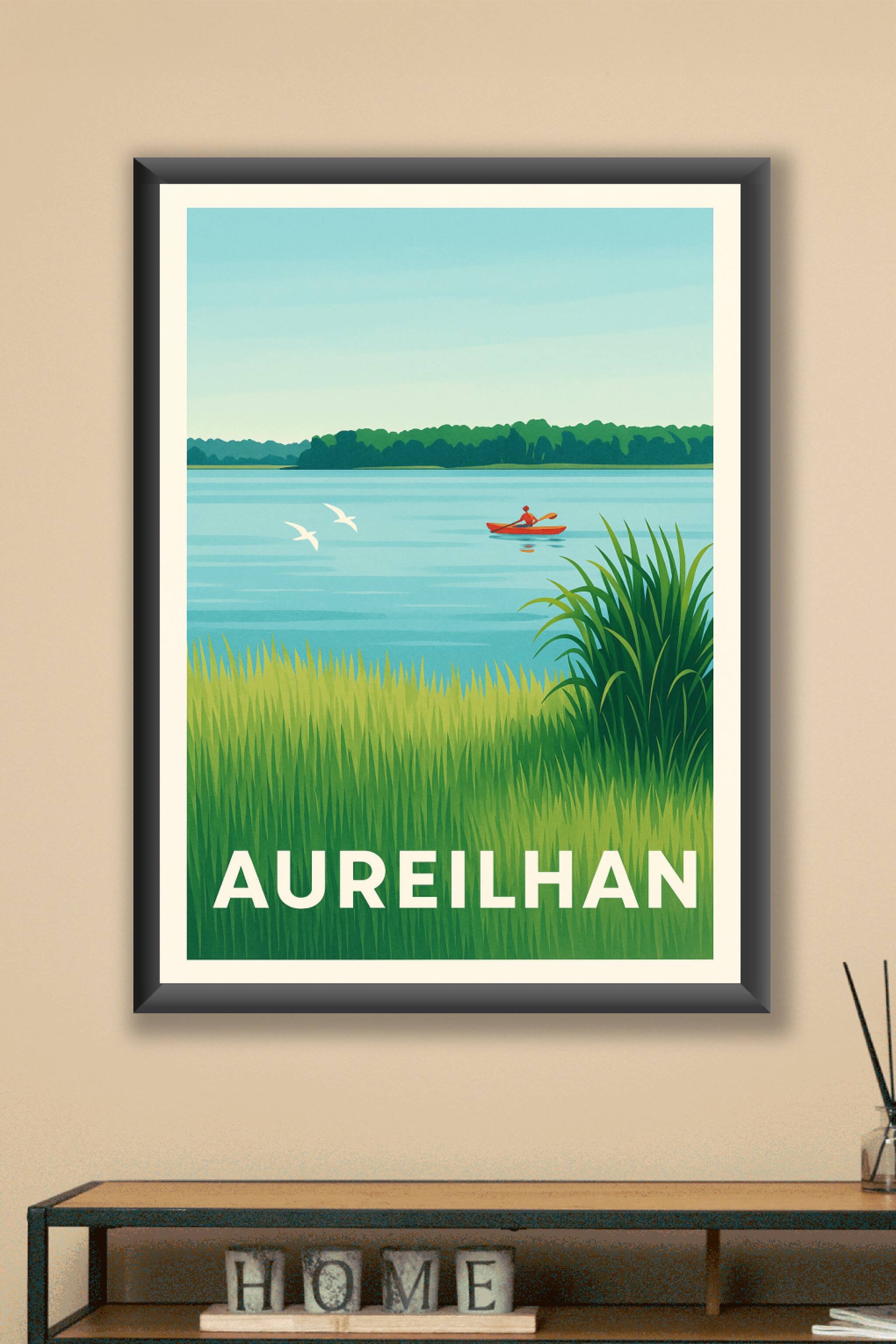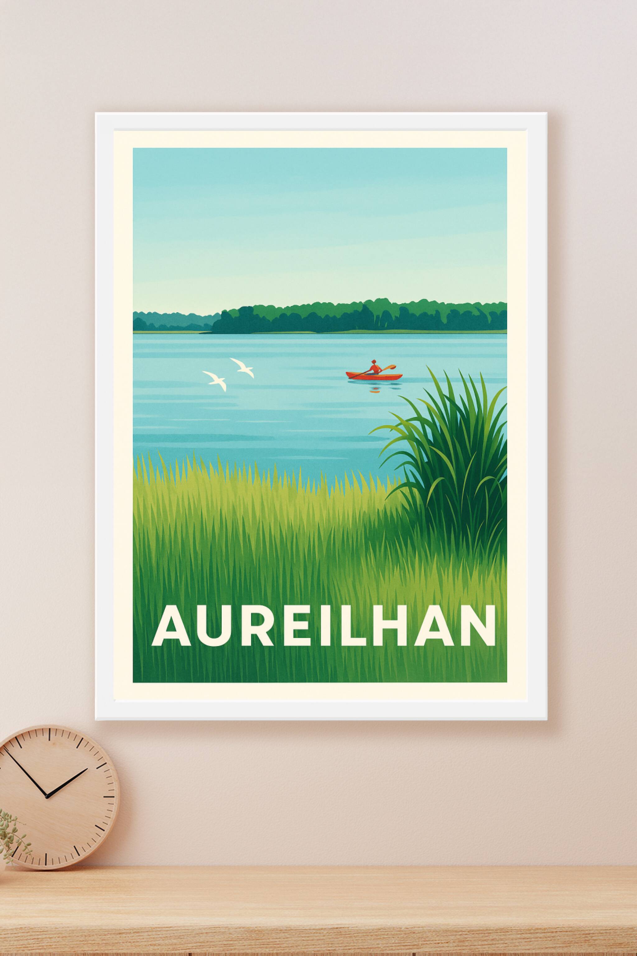 Découvrez la sérénité d'Aureilhan avec cette affiche au style vintage mettant en scène un kayakiste glissant sur les eaux calmes du lac, entouré d'...