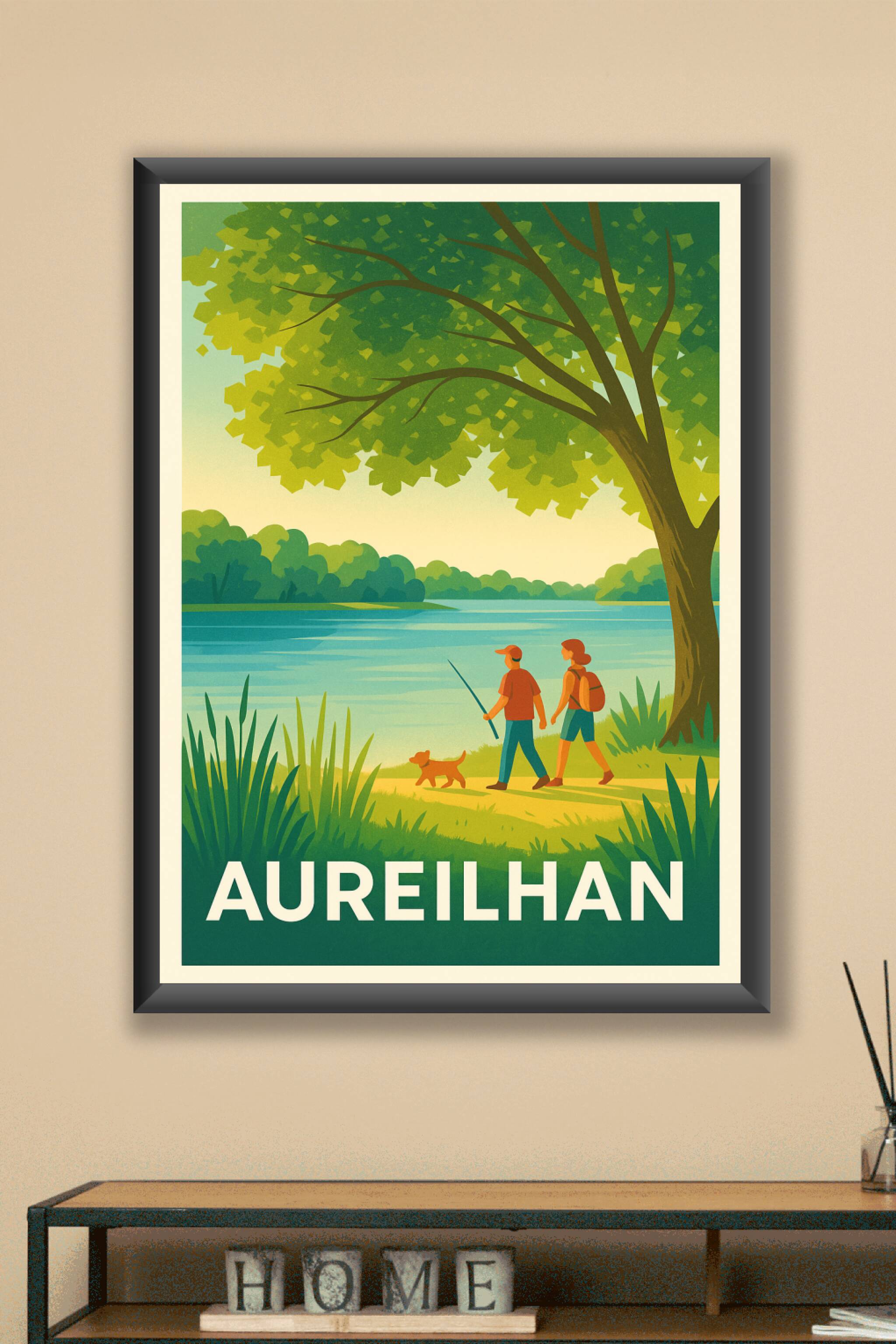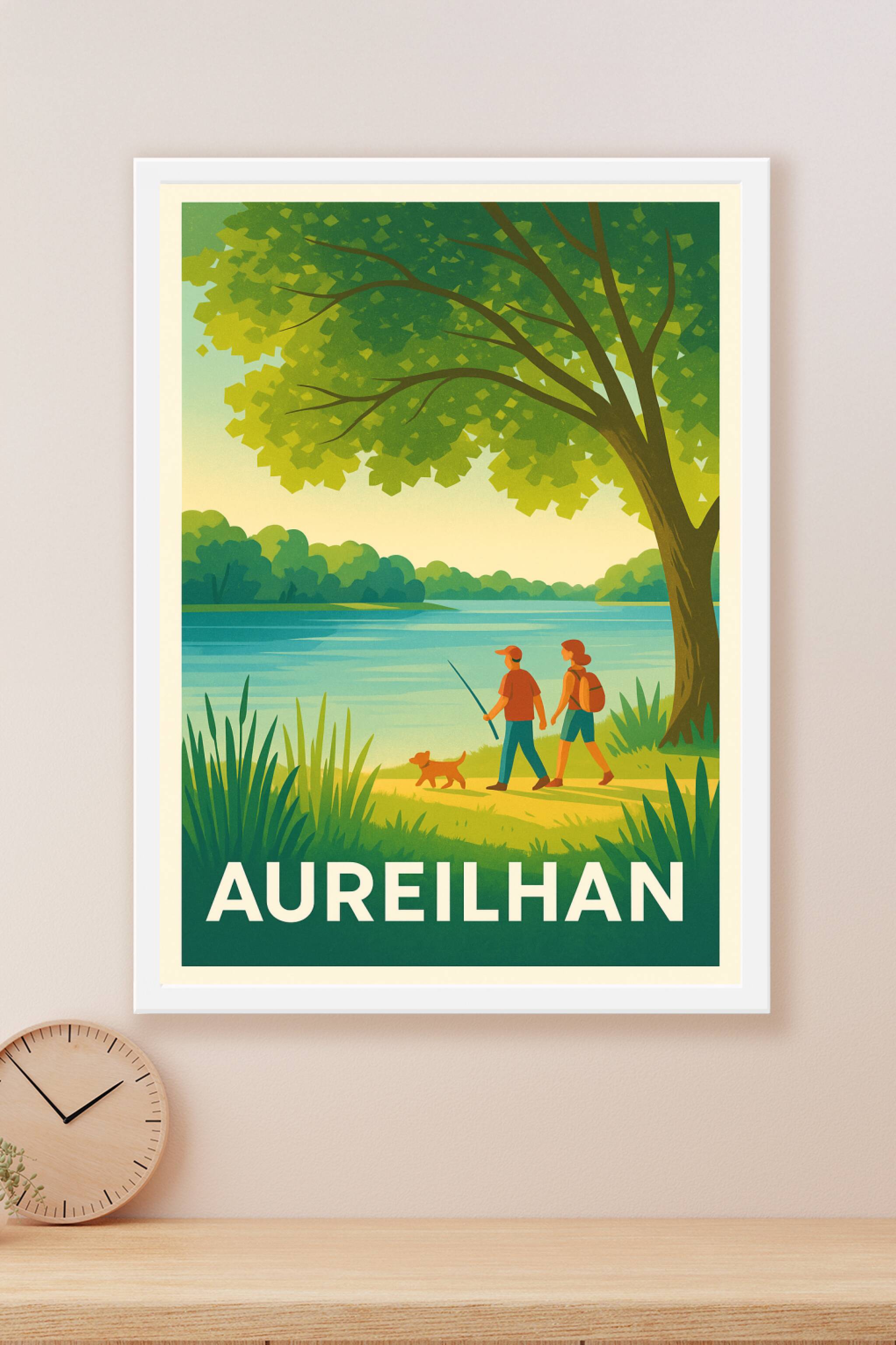 Découvrez la sérénité d'Aureilhan avec ce poster illustré qui capture un moment de détente au bord du lac, où se mêlent nature luxuriante et douceu...