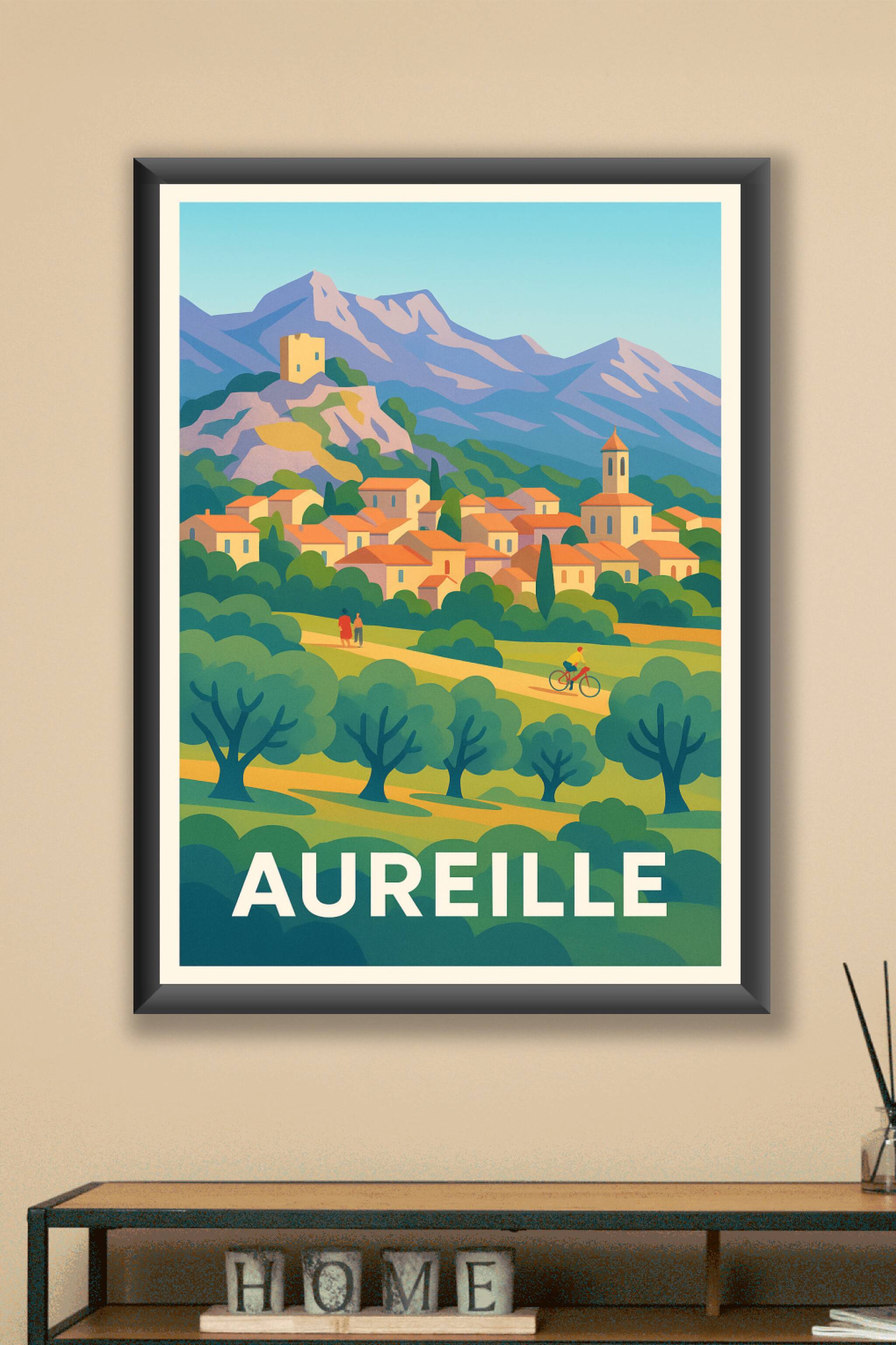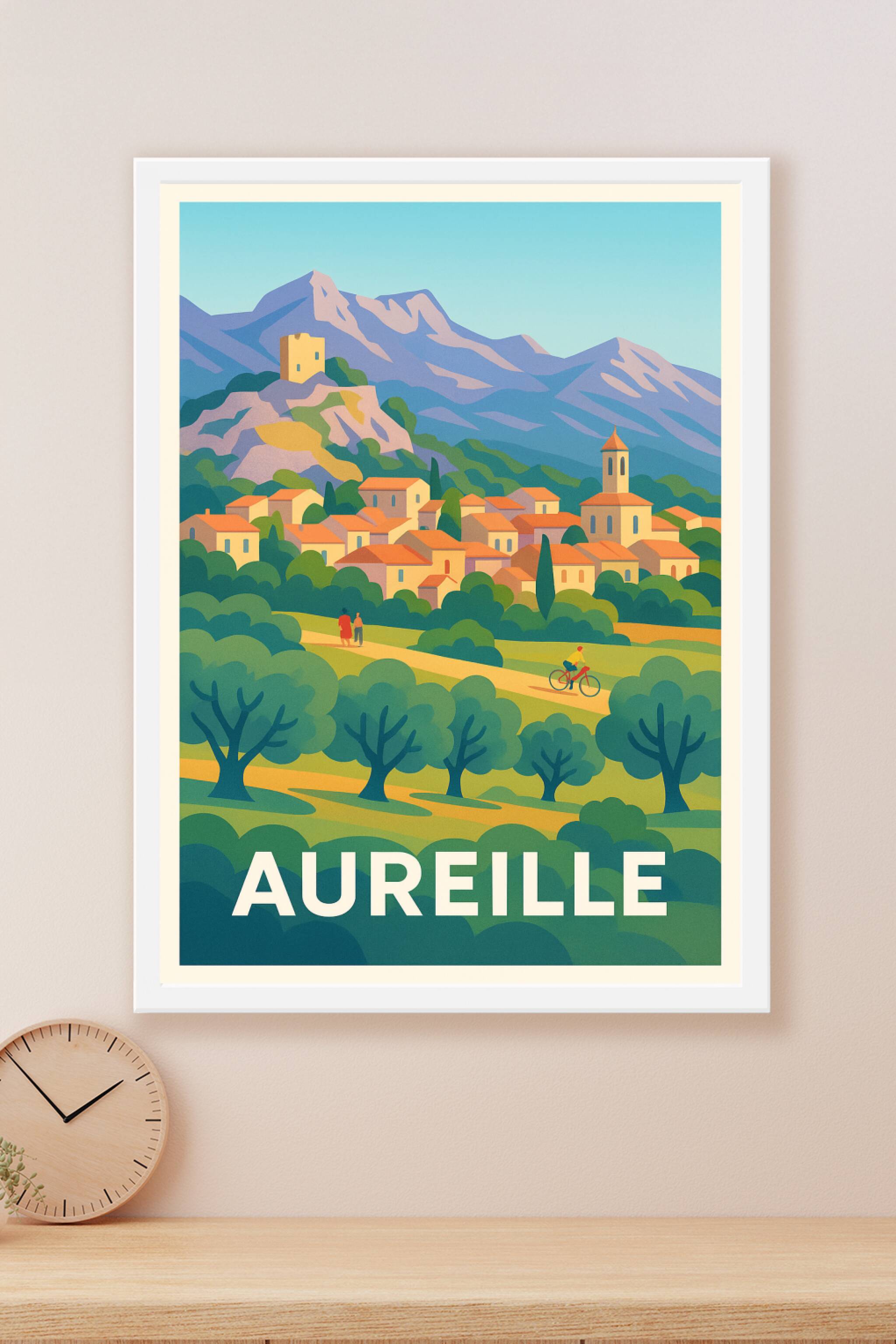Découvrez l'affiche illustrée d'Aureille, un village pittoresque niché entre collines verdoyantes et montagnes majestueuses. Cette scène idyllique ...