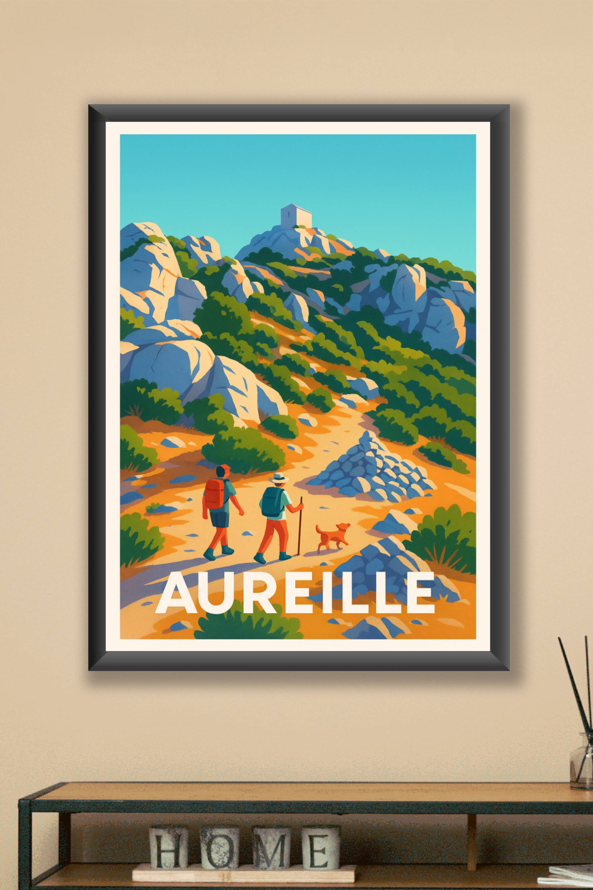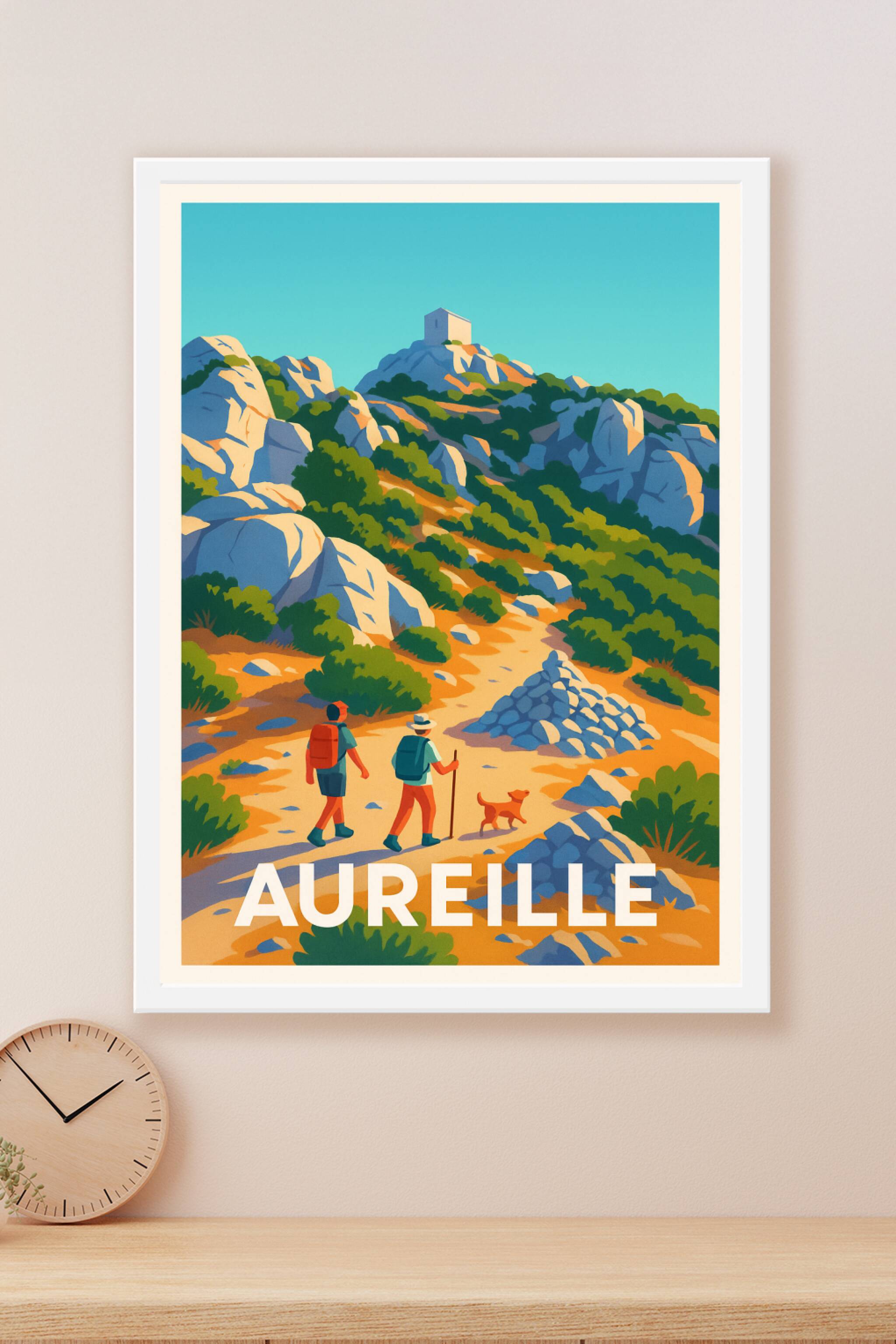 Découvrez la beauté sauvage et authentique d'Aureille avec cette affiche illustrée au style vintage. Ce poster met en scène une randonnée dans les ...