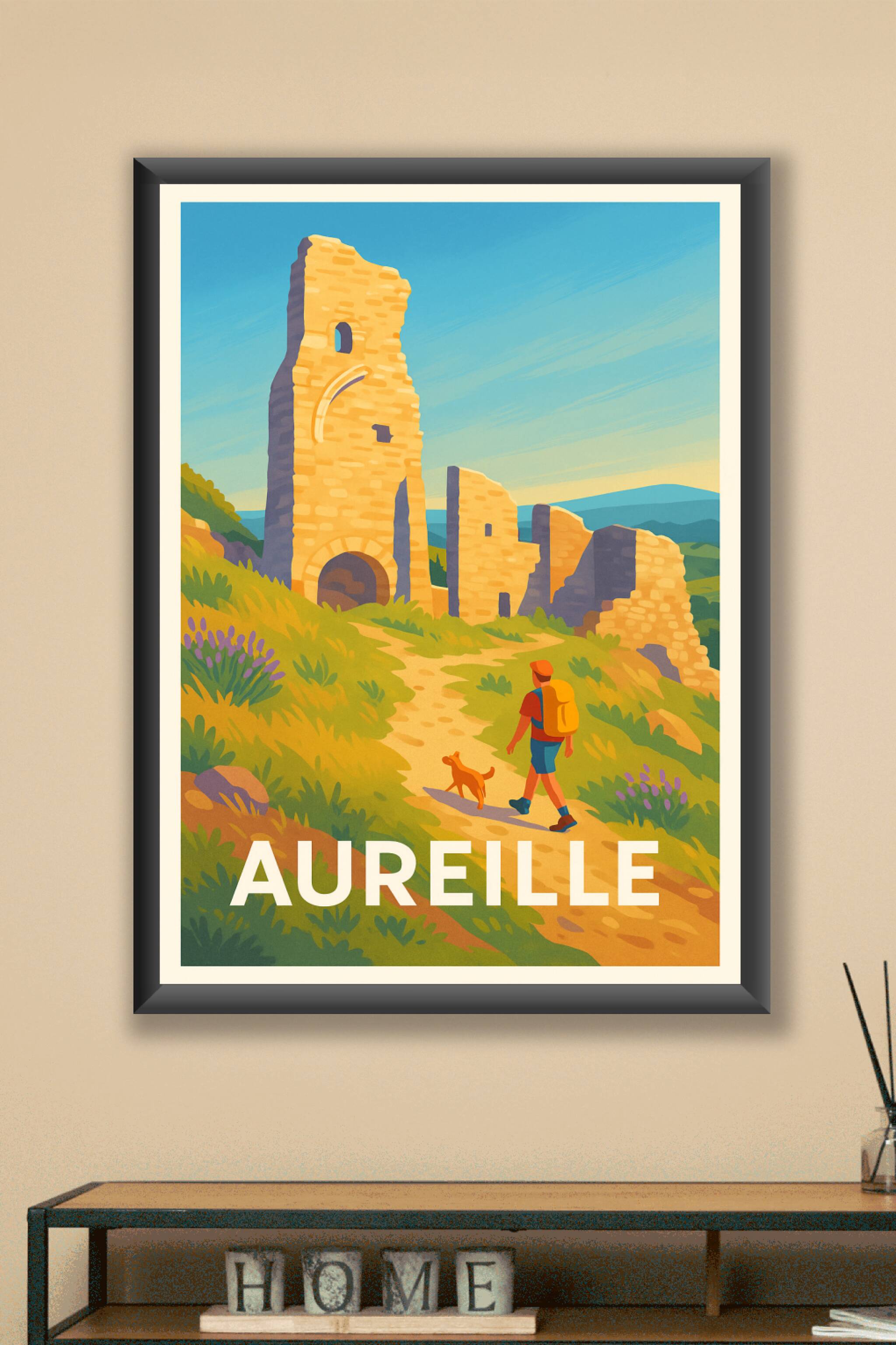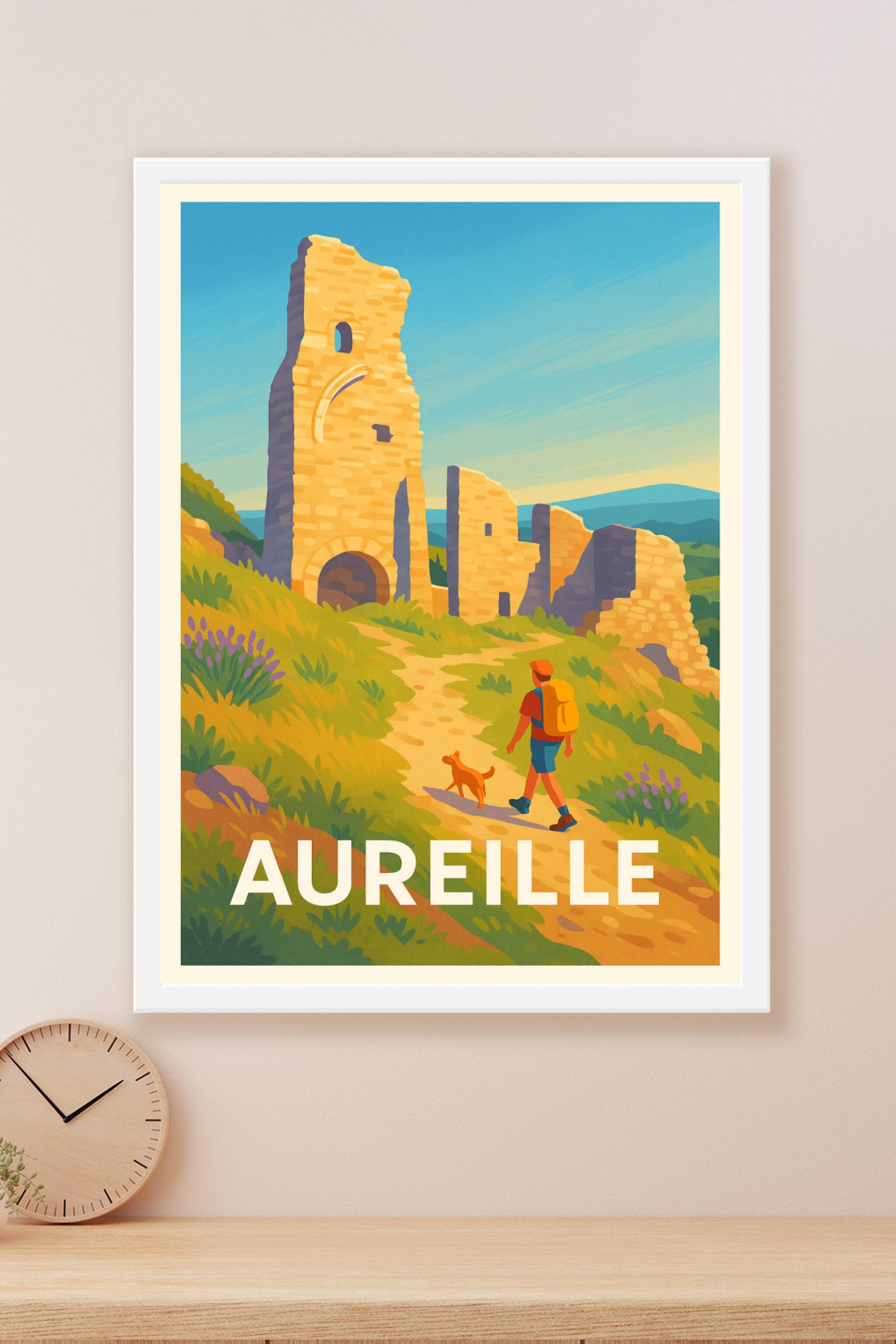 Découvrez l'atmosphère paisible et authentique d'Aureille à travers cette affiche illustrée qui met en lumière les vestiges historiques et les sent...