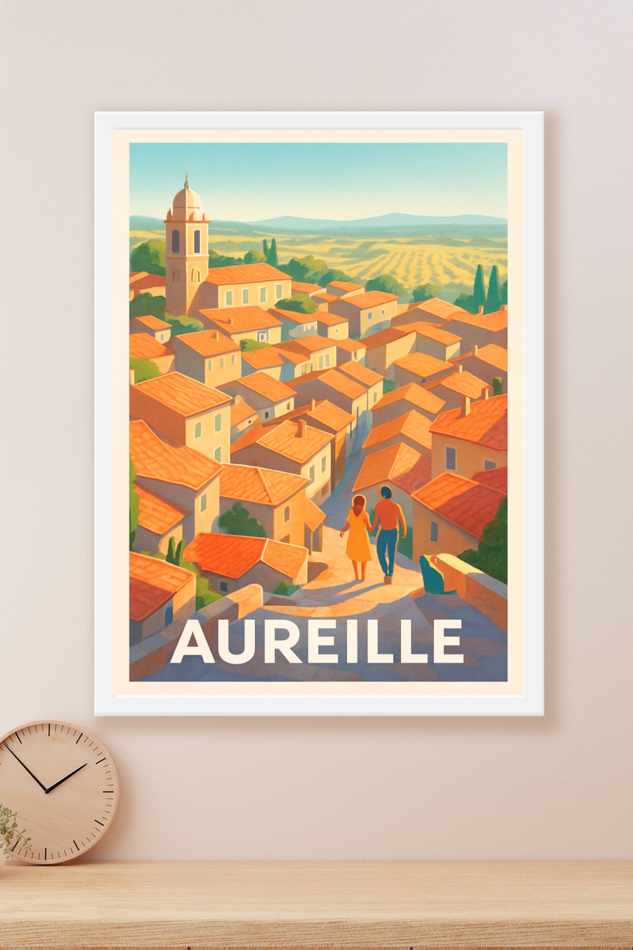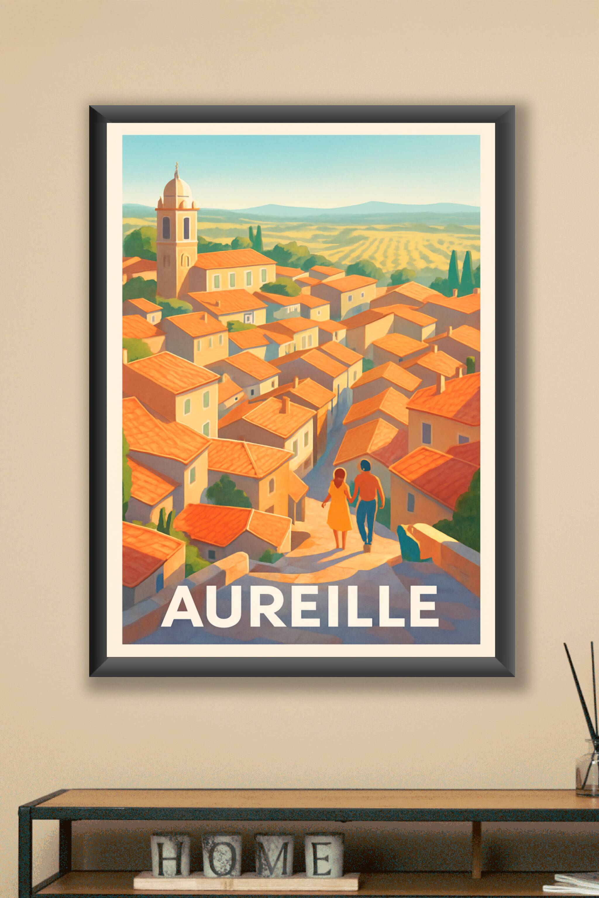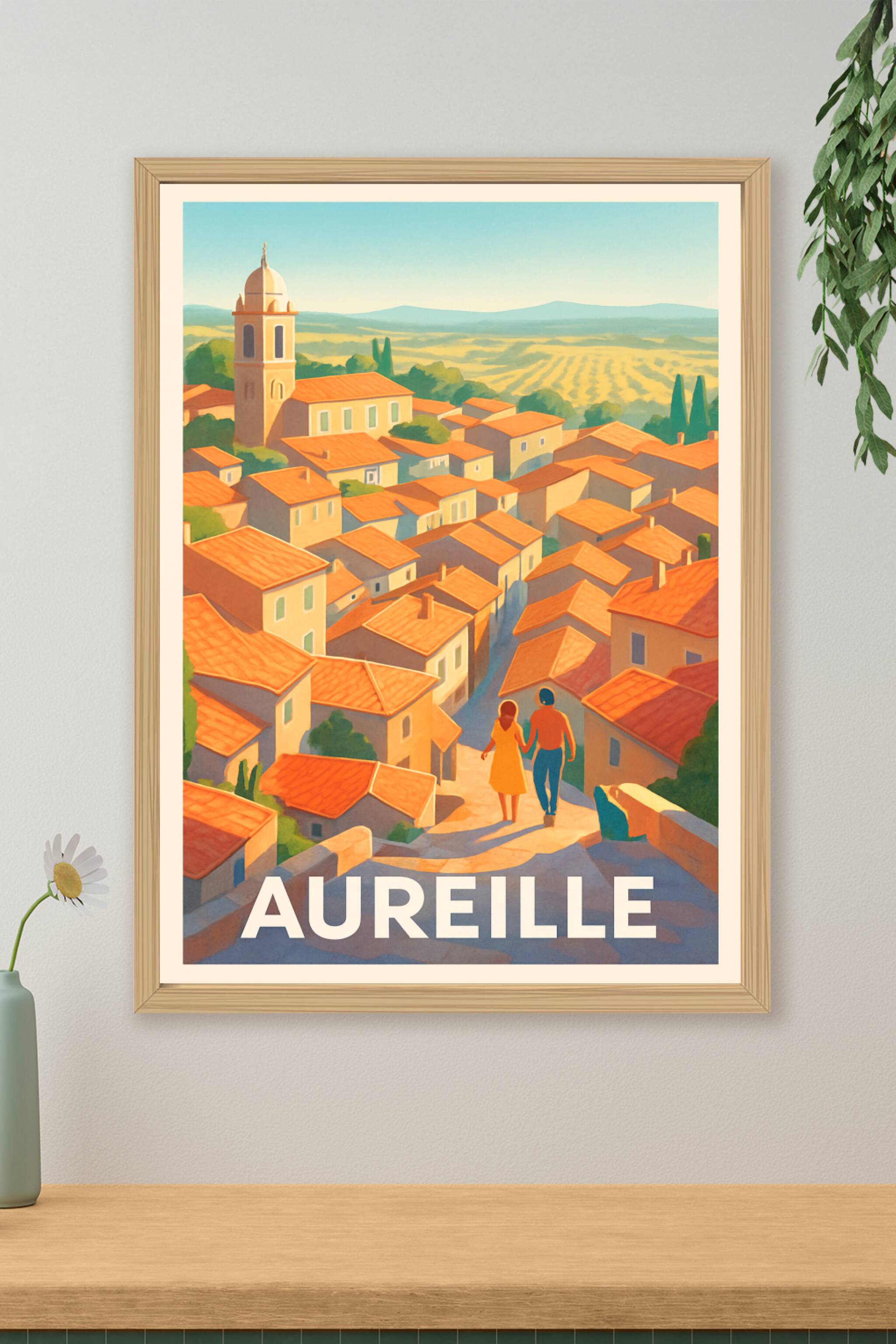 Découvrez l'atmosphère envoûtante d'Aureille à travers cette affiche illustrée pleine de chaleur et de douceur. Le village aux toits orangés se dév...