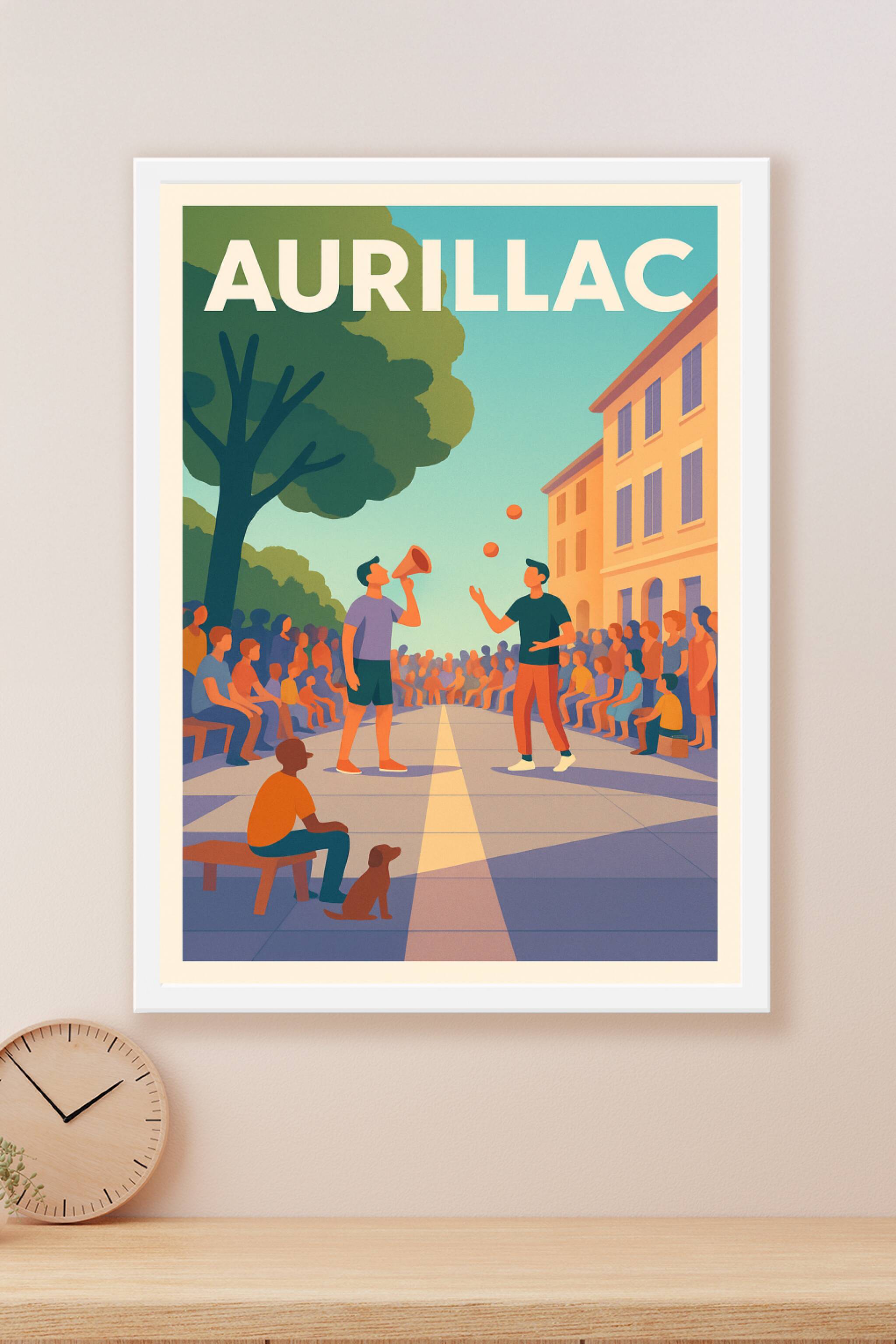 Découvrez l'atmosphère chaleureuse et animée d'Aurillac avec cette affiche illustrée représentant une scène de rue conviviale, où foule et artistes...