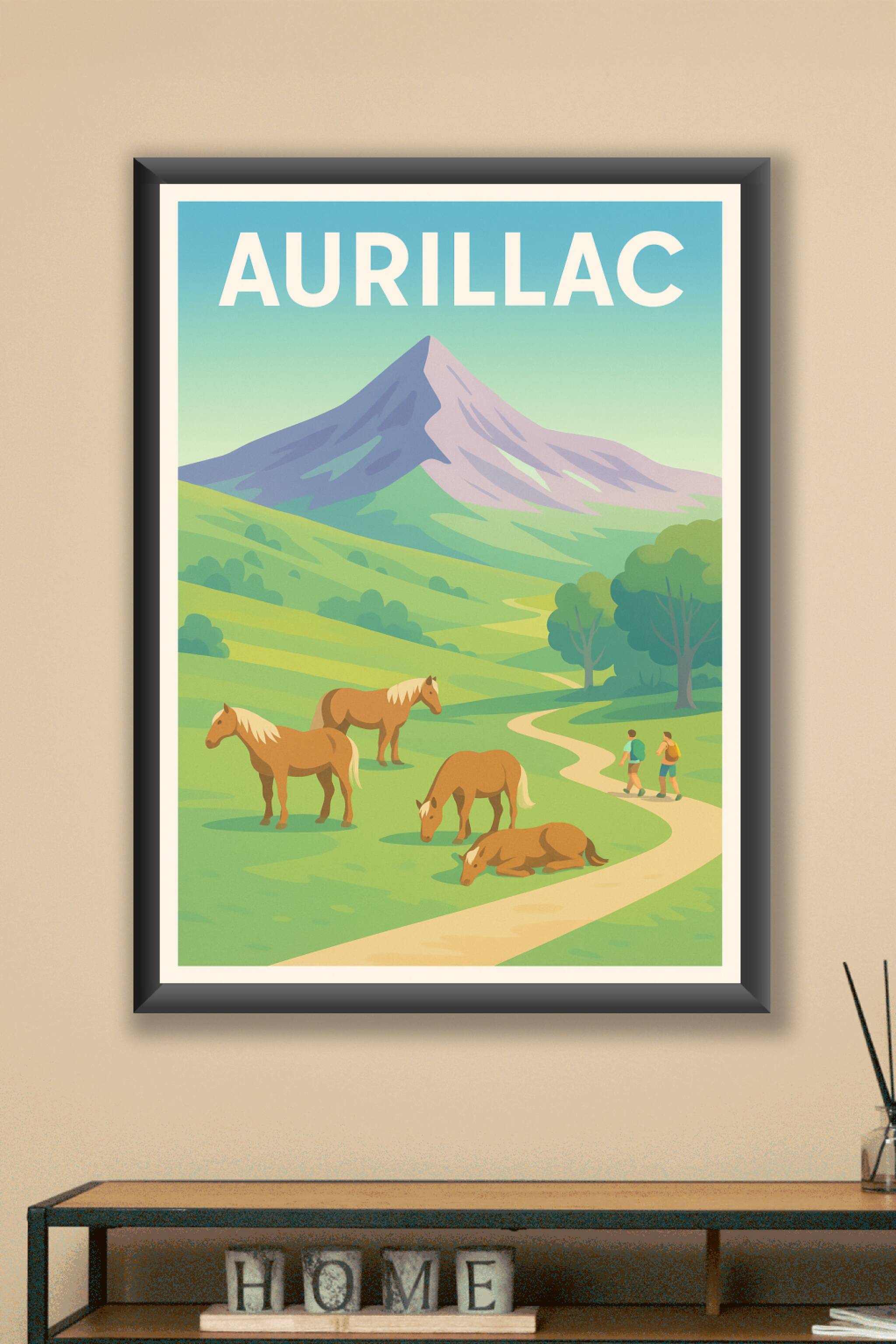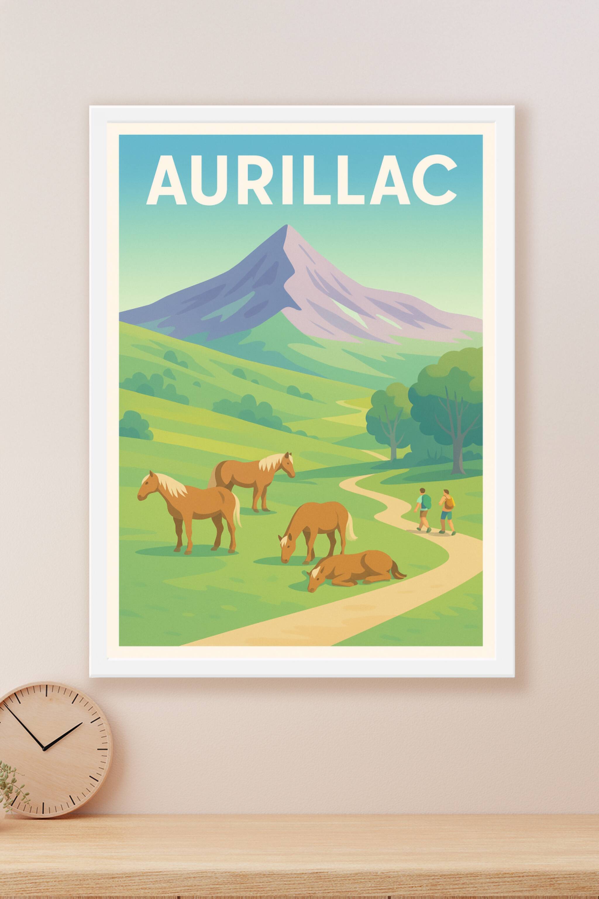 Découvrez l'atmosphère paisible et authentique d'Aurillac avec cette affiche illustrée mettant en scène les paysages verdoyants et les chevaux dans...