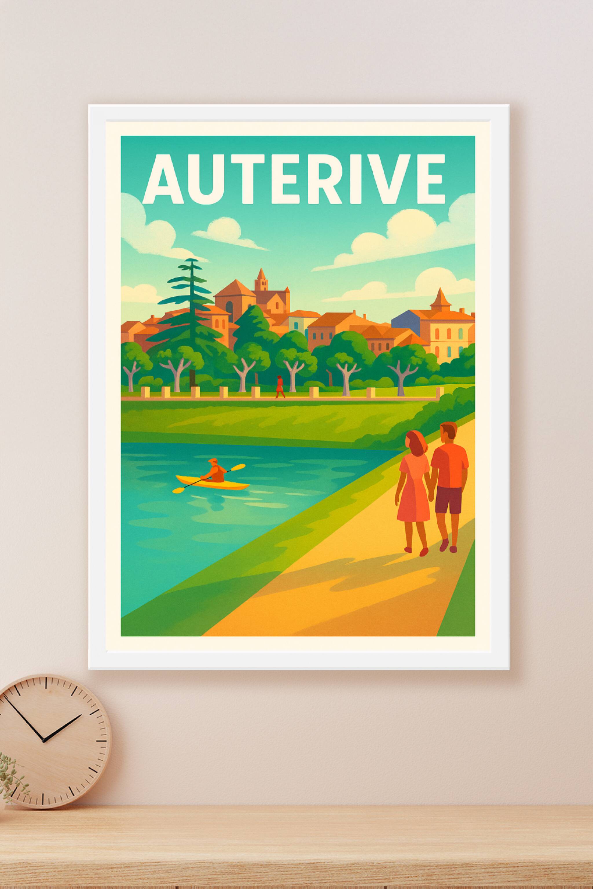 Découvrez la douceur de vivre d'Auterive avec ce poster illustré mettant en scène un couple en promenade le long d'un cours d'eau paisible, entouré...