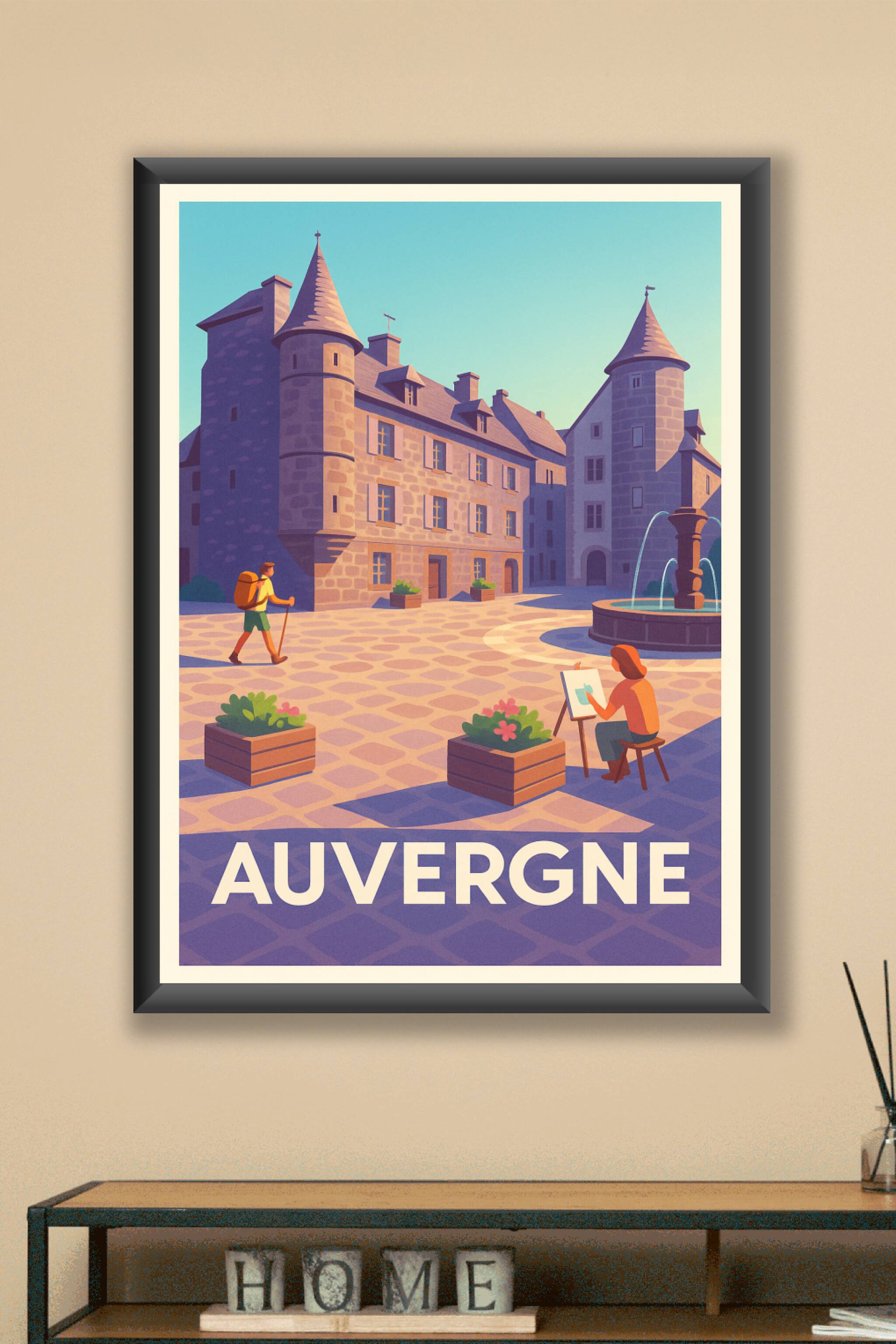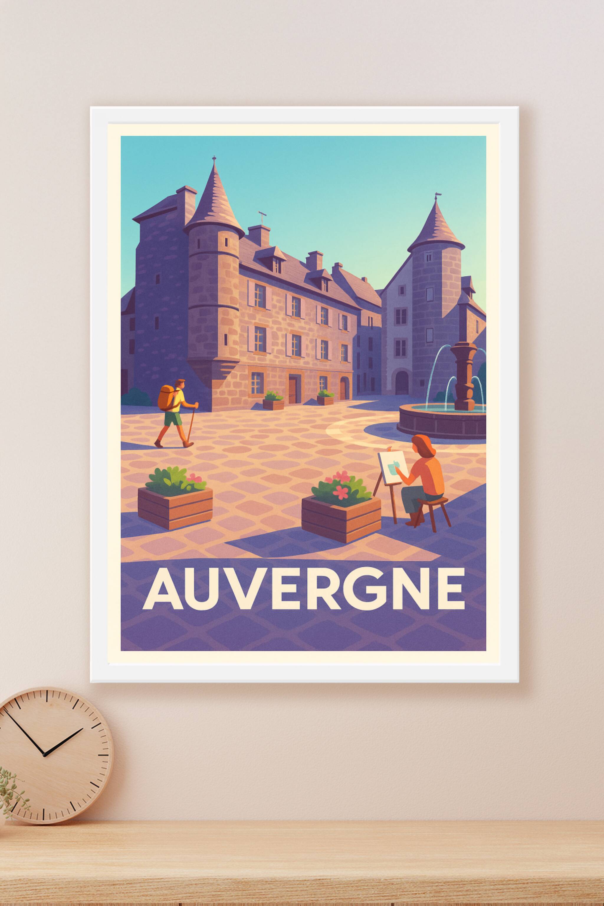 Découvrez l'atmosphère paisible et pittoresque de l'Auvergne avec cette affiche illustrée mettant en scène une place médiévale baignée par une lumi...