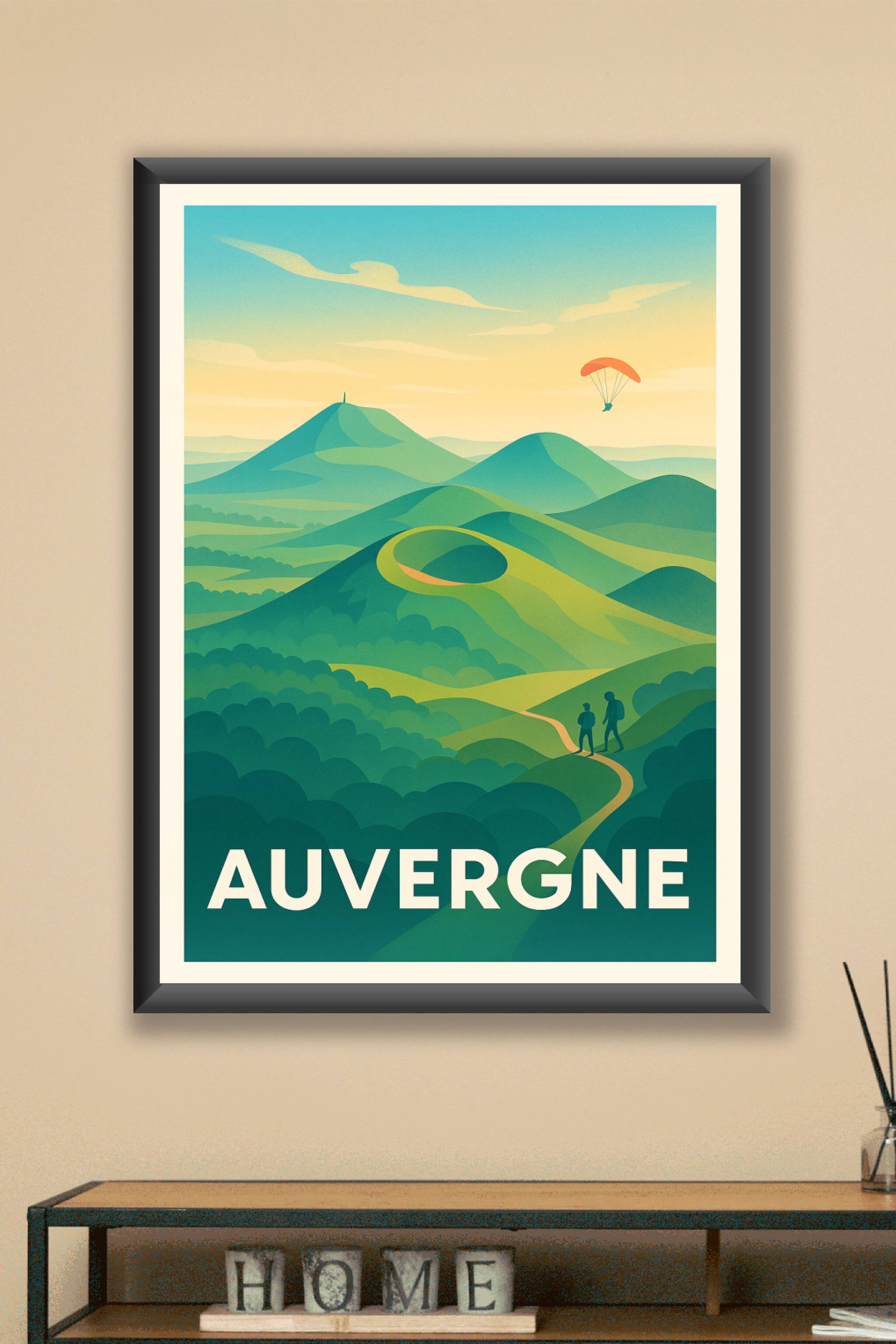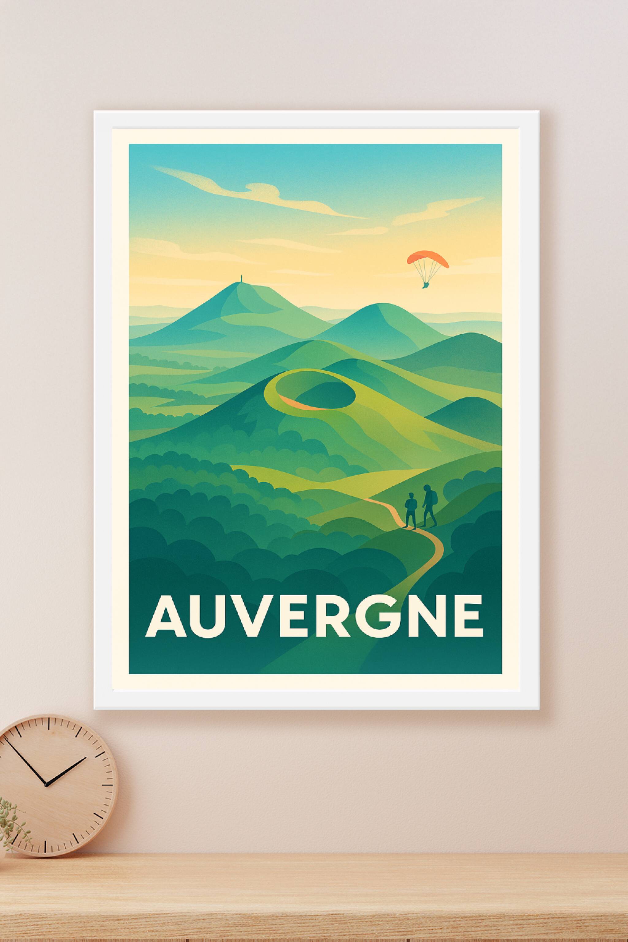 Découvrez la beauté unique des paysages volcaniques d'Auvergne avec cette affiche au design épuré et moderne. Ce poster évoque les vastes étendues verdoyantes, les célèbres puys et une atmosphère d'aventure avec des promeneurs et un parachutiste dans le ciel. Imprimée en tirage Fine Art sur un papier 305g coton, cette affiche garantit une qualité d'impression et une longévité exceptionnelles. Disponible en formats A1 à A4, avec ou sans cadre, elle est idéale pour apporter une touche naturelle et chaleureuse à votre décoration intérieure. Sublimez votre espace ou offrez un souvenir authentique de la splendide région d'Auvergne.
