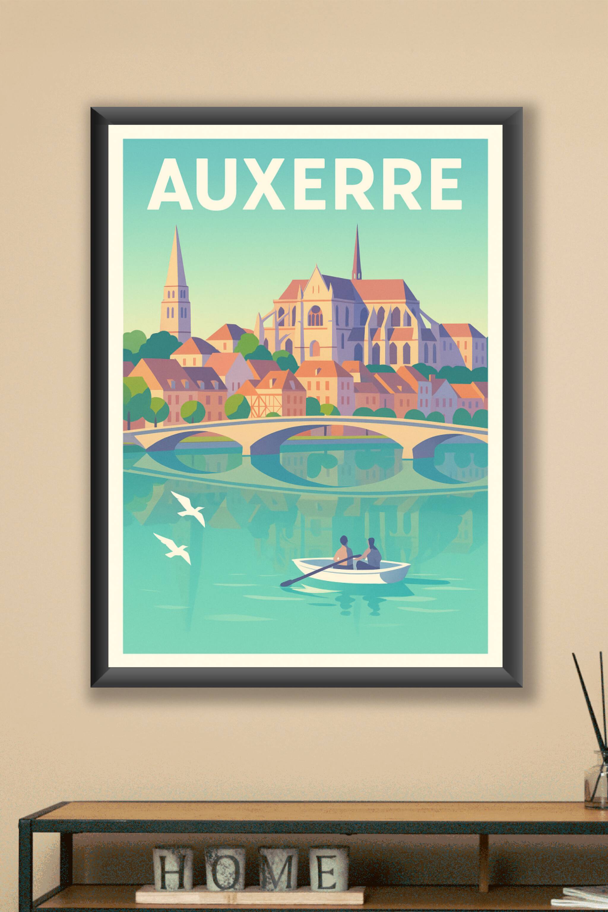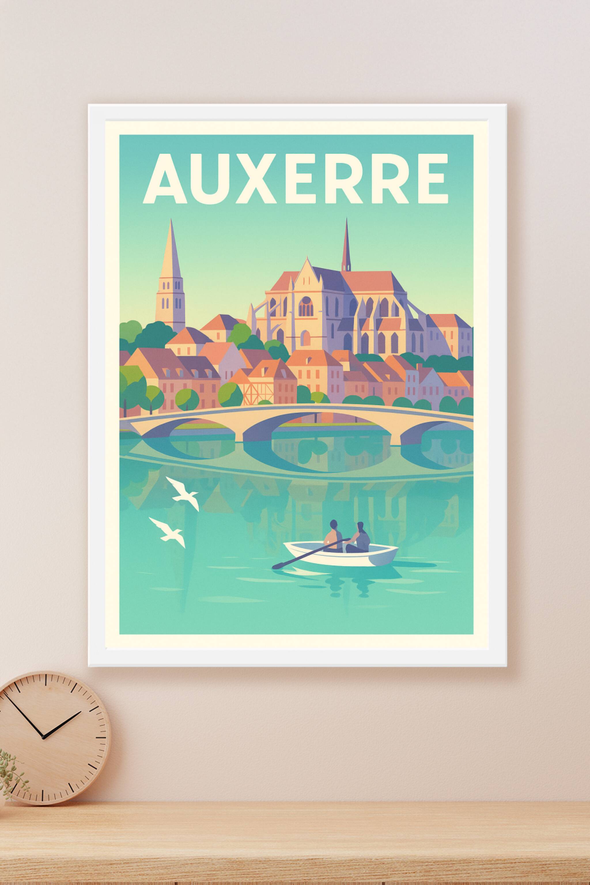 Découvrez le charme paisible d'Auxerre avec cette affiche illustrée mettant en valeur son architecture emblématique et son cadre riverside. La douc...