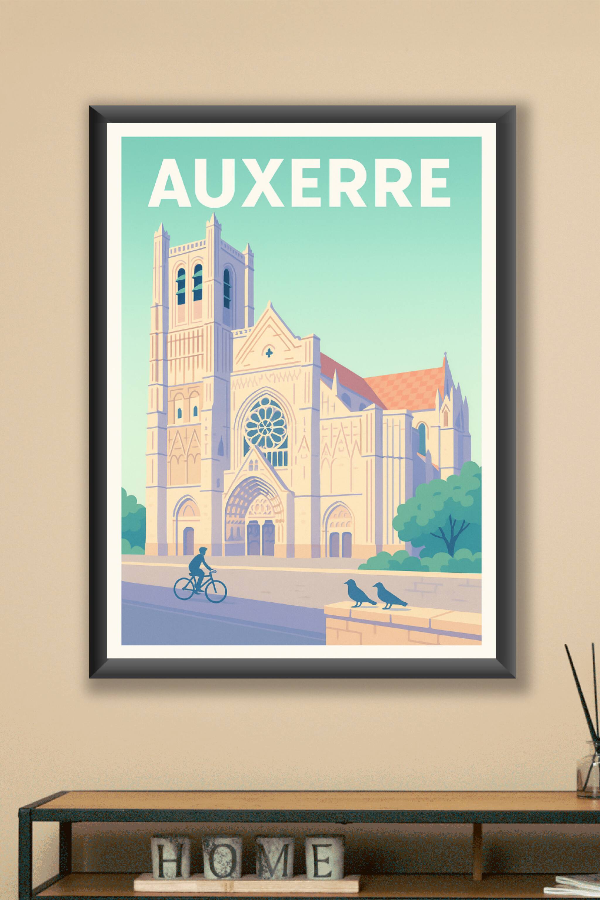 Découvrez la majesté de la cathédrale d'Auxerre capturée dans ce poster au design épuré et lumineux. Cette affiche met en avant l'architecture goth...