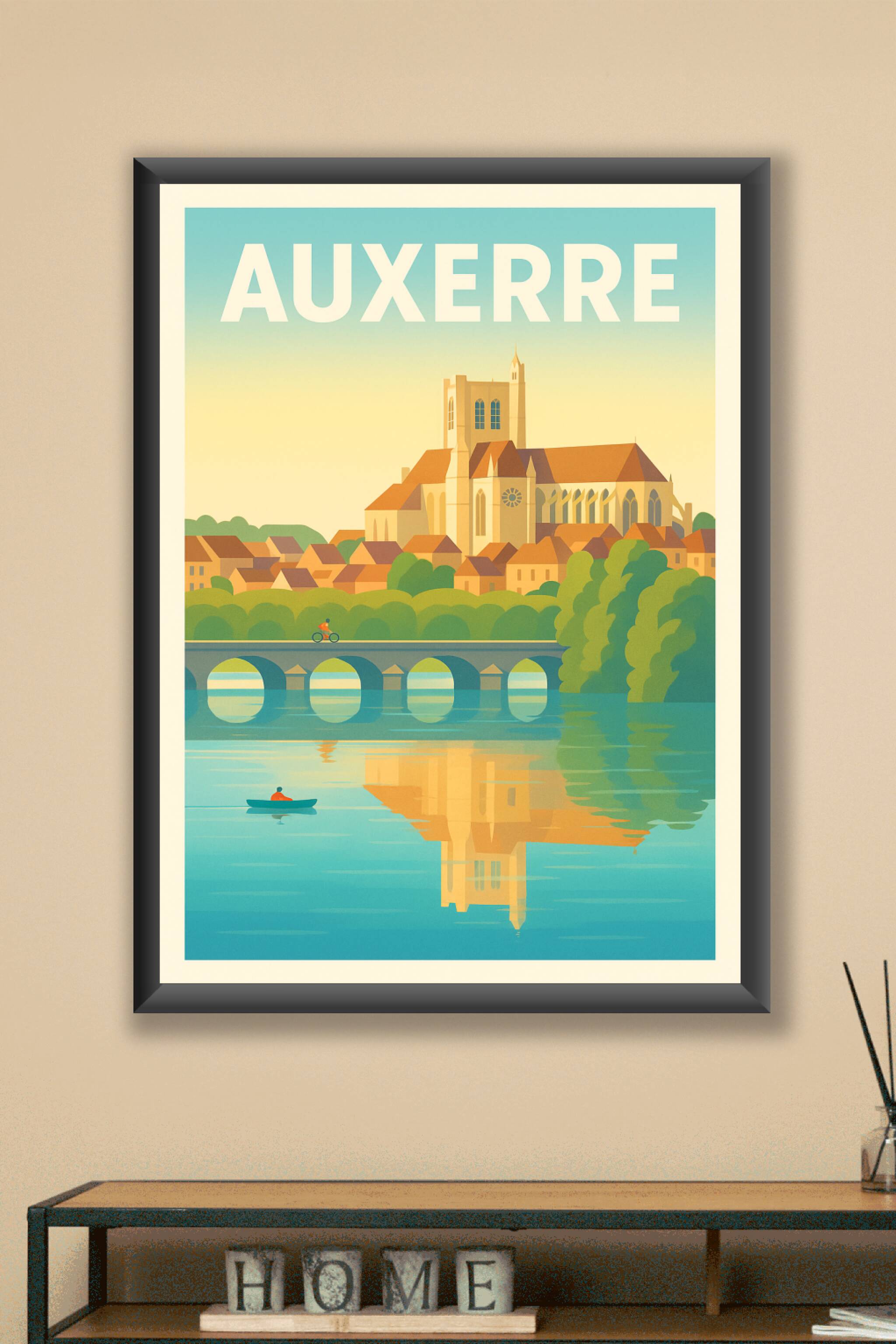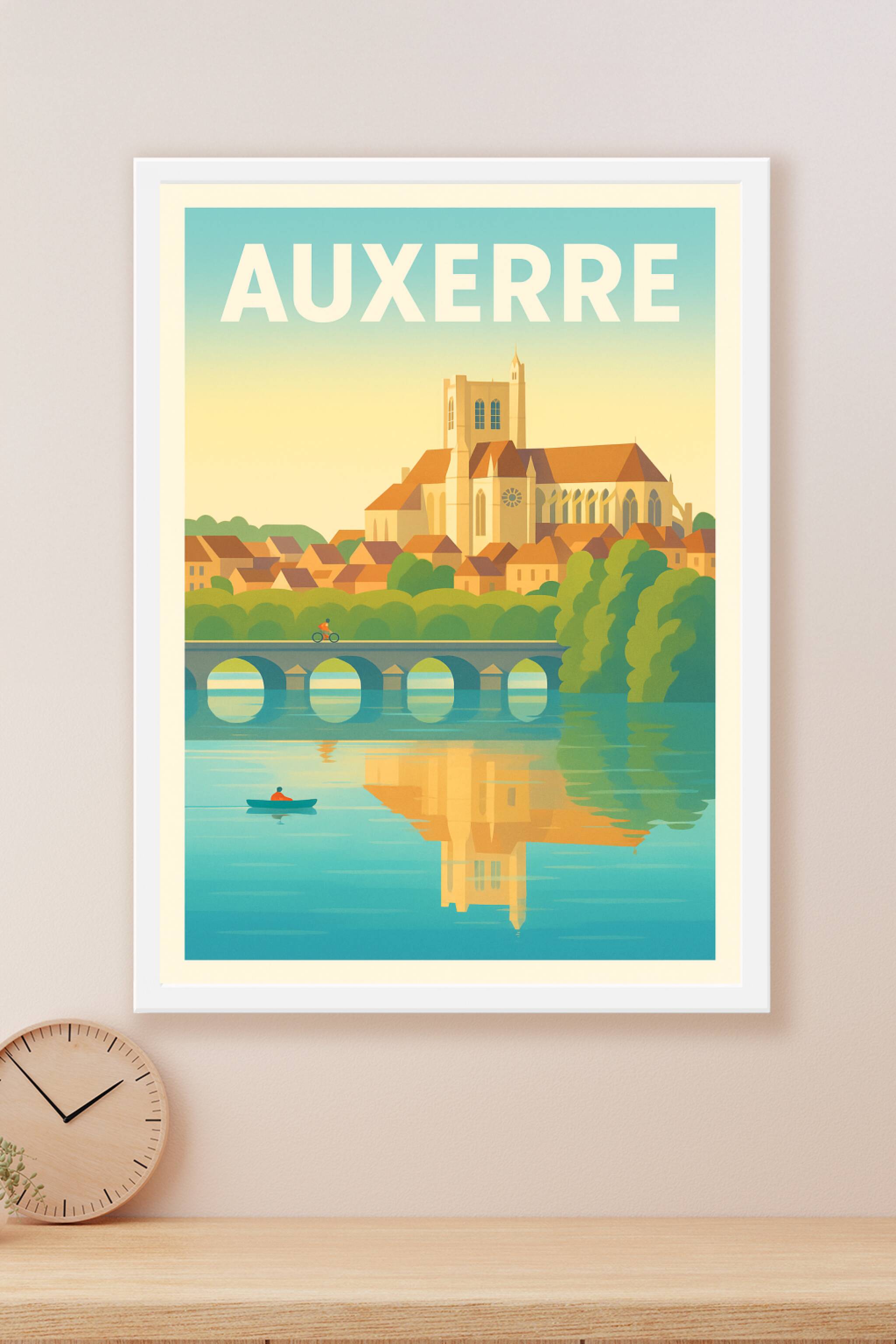 Découvrez la douceur et le charme paisible d'Auxerre avec cette affiche illustrée qui met en lumière son patrimoine emblématique au bord de l'Yonne...