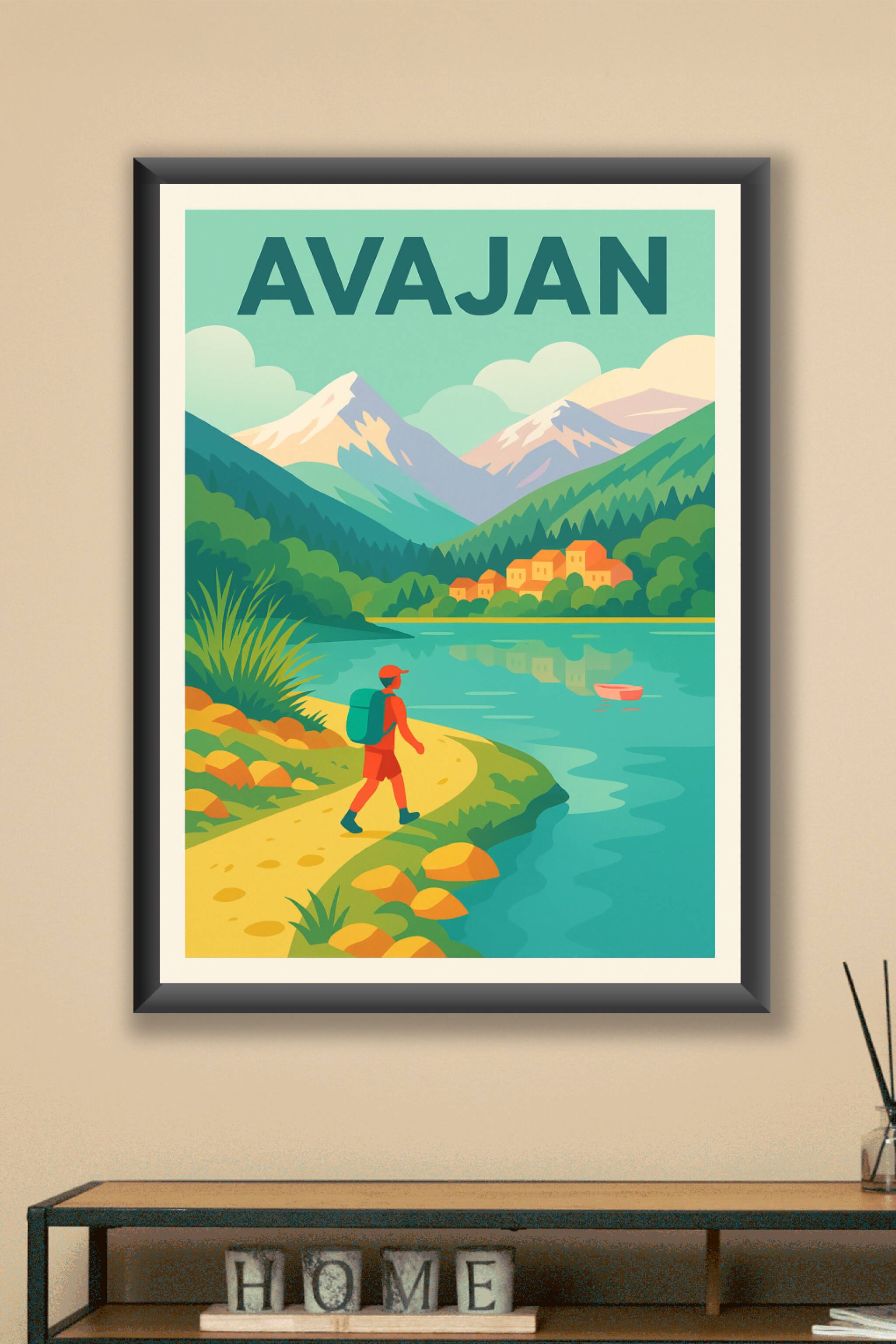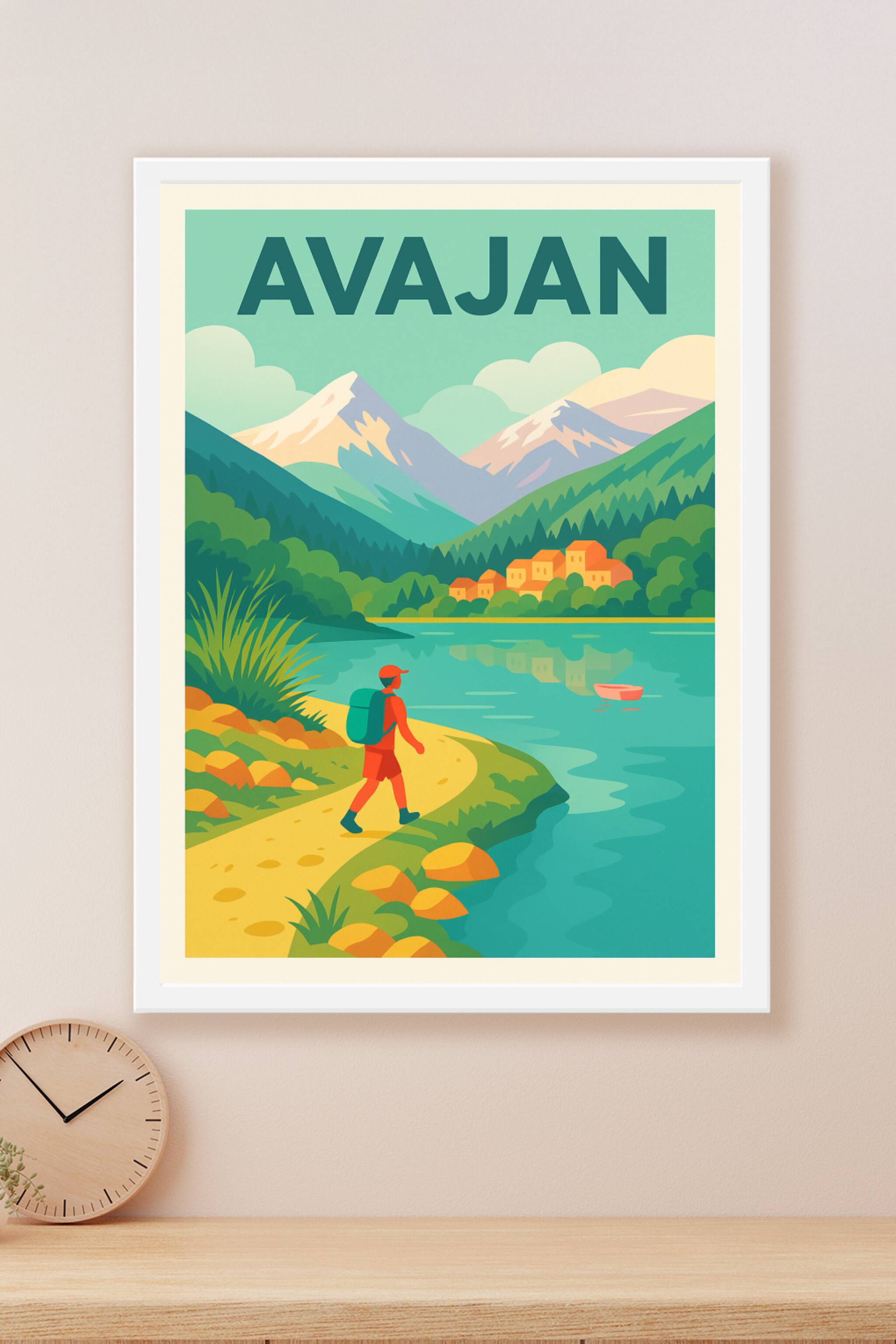 Découvrez la charmante commune d'Avajan à travers cette affiche poétique mettant en scène un randonneur au bord d'un lac paisible entouré de montag...