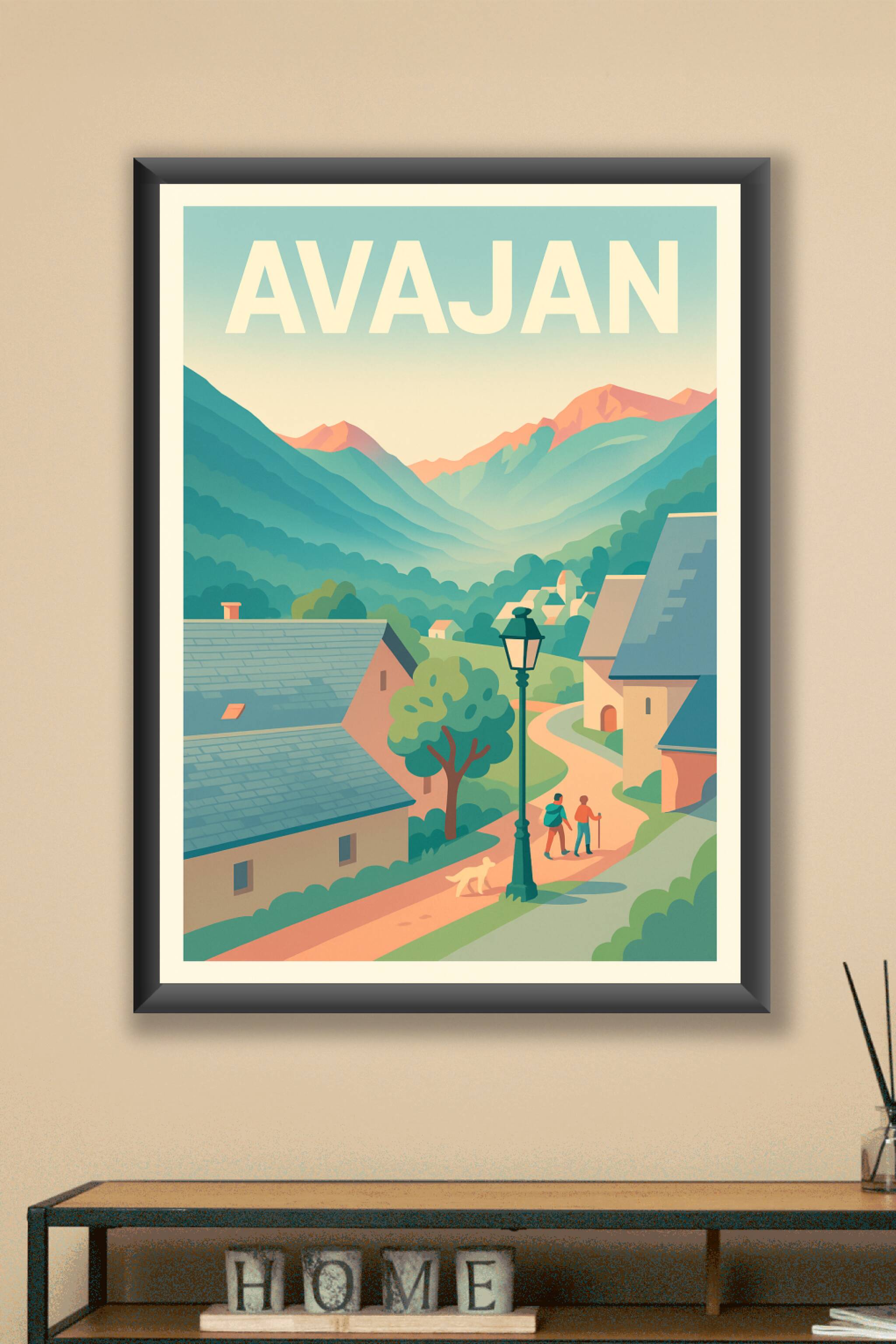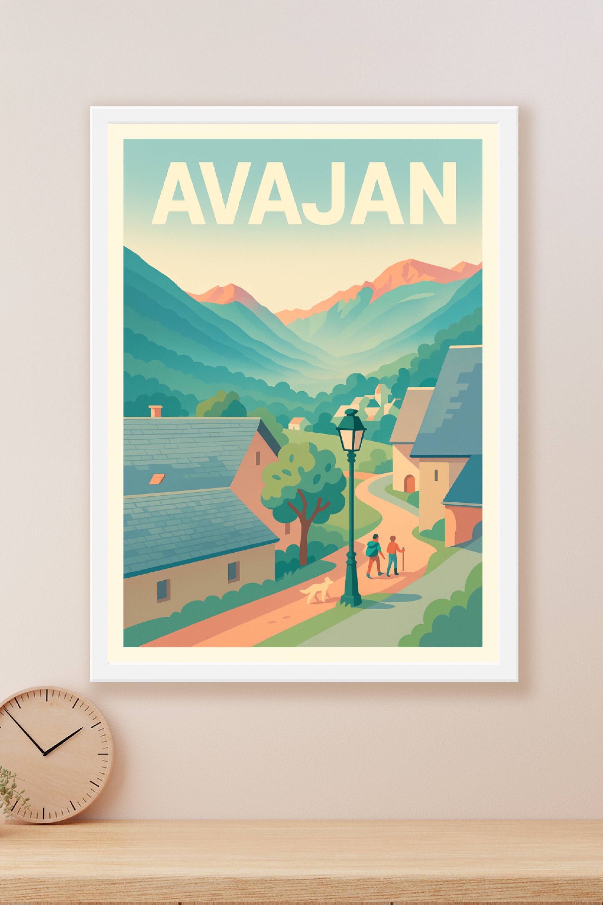 Découvrez la sérénité d'Avajan avec cette affiche illustrée qui capture la douceur de ce village niché au cœur des montagnes pyrénéennes. Ce poster...