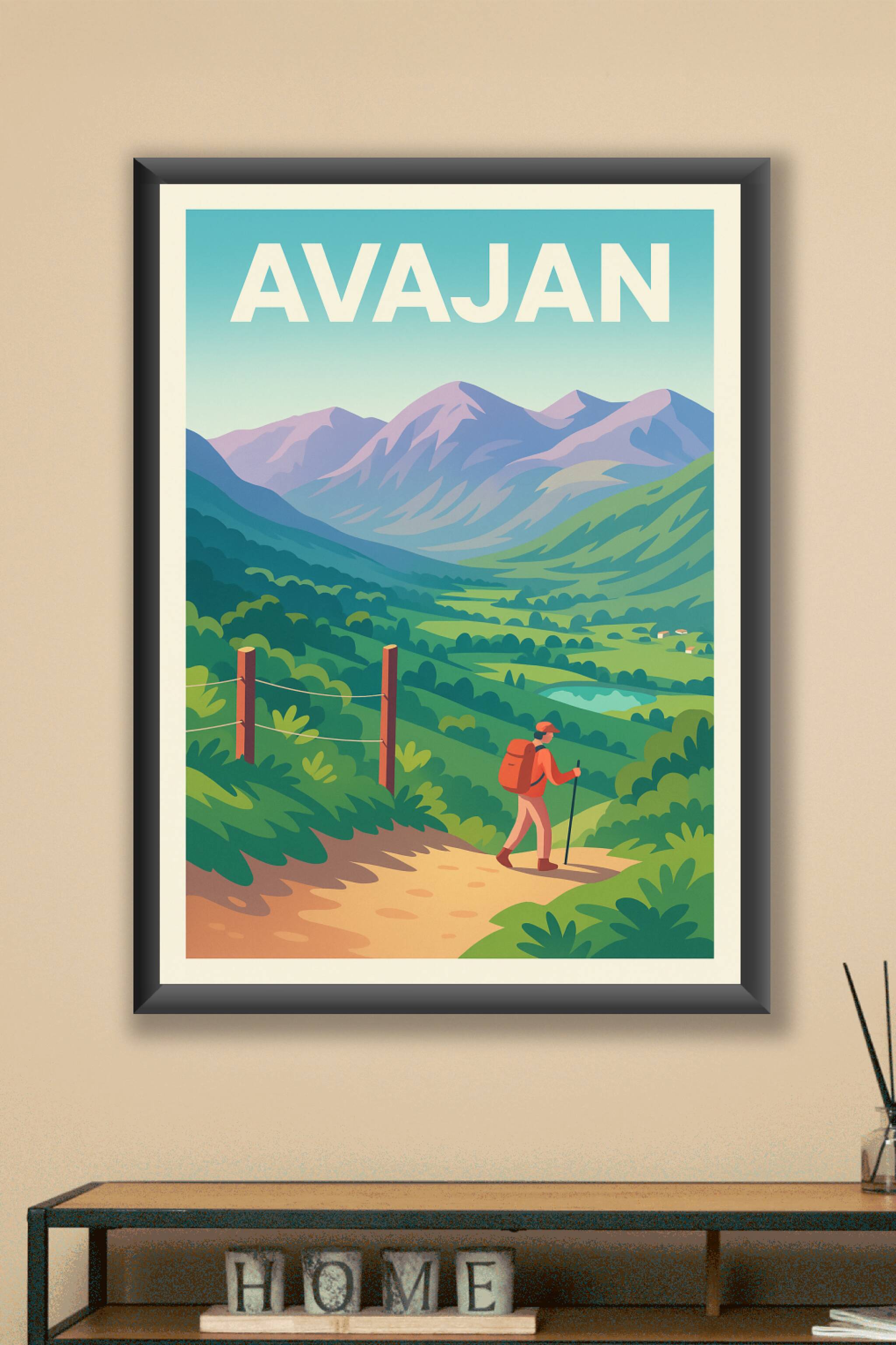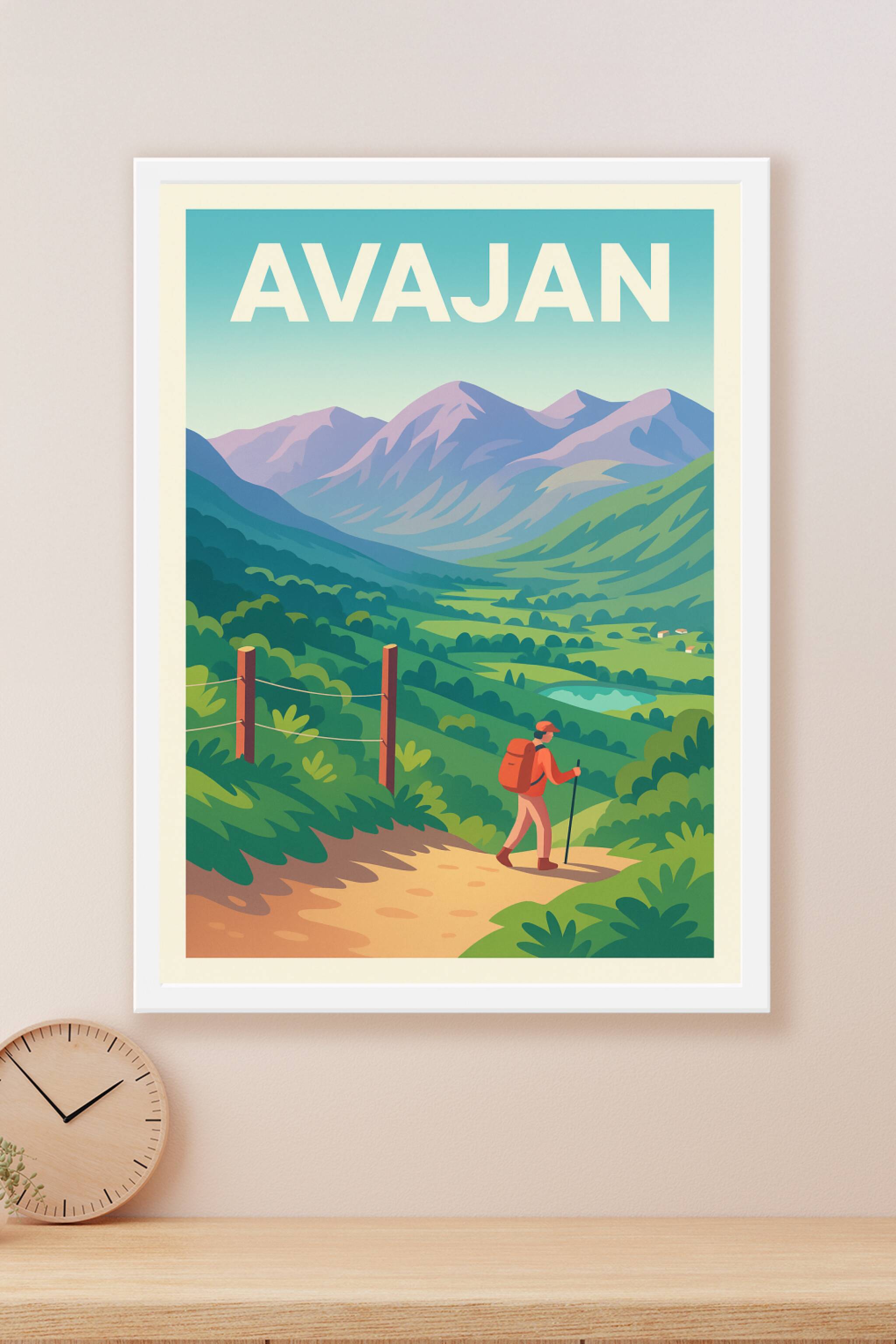 Découvrez la beauté sereine des Pyrénées avec ce poster illustré mettant en scène un randonneur explorant les vallées verdoyantes d'Avajan. Cette a...