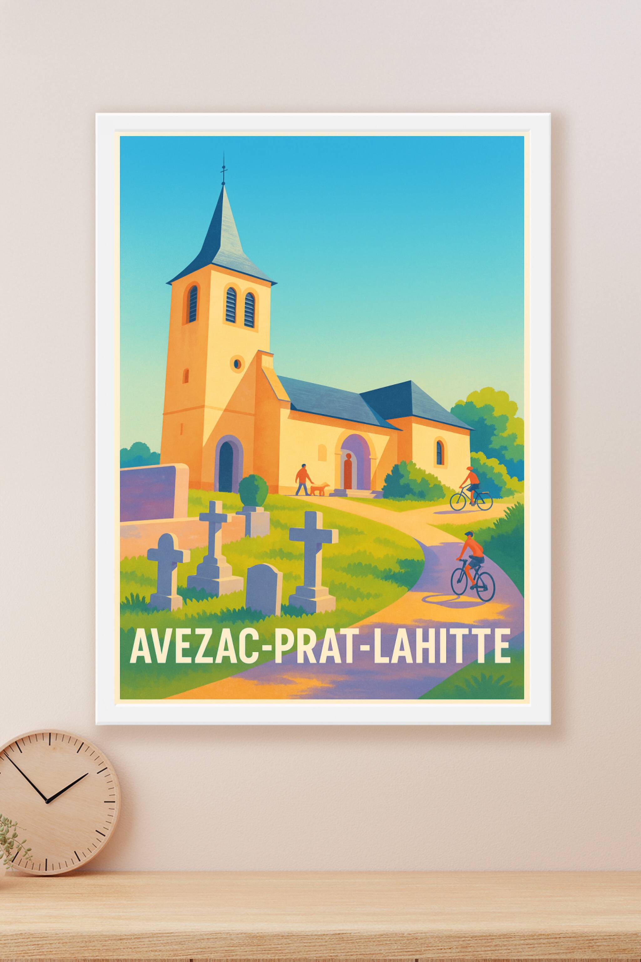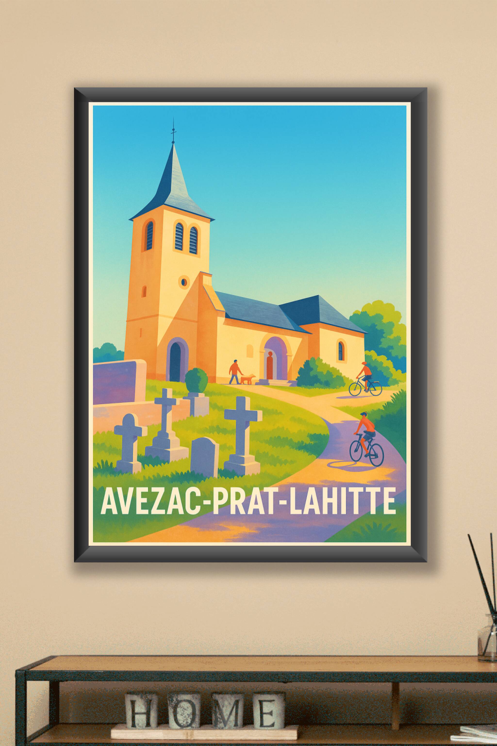 Découvrez l'atmosphère paisible du village d'Avezac-Prat-Lahitte avec cette affiche illustrée mettant en avant son église emblématique baignée d'un...