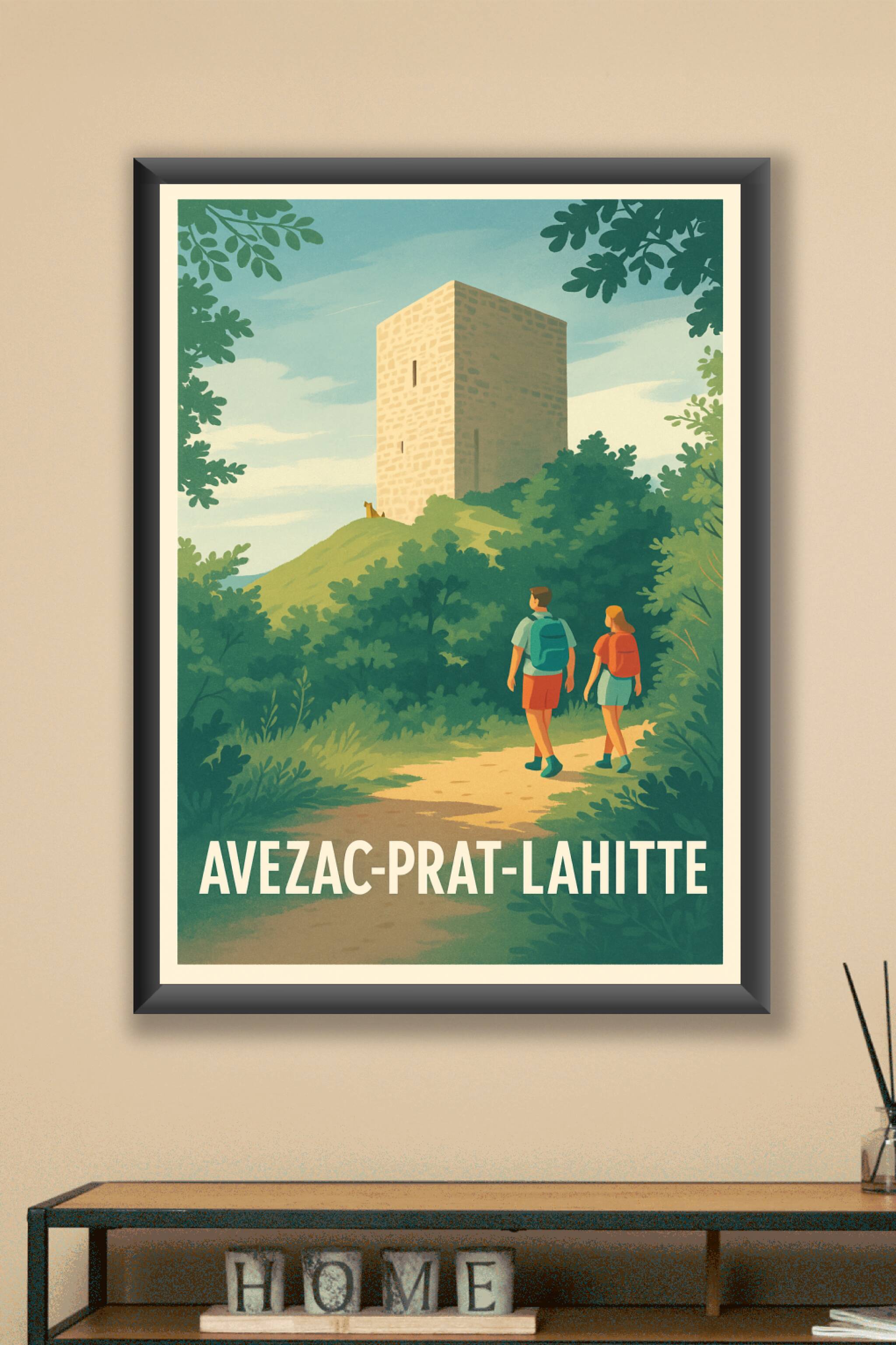 Découvrez l'affiche qui capture l'essence d'Avezac-Prat-Lahitte, avec ses paysages verdoyants et la majestueuse tour perchée au sommet d'une collin...