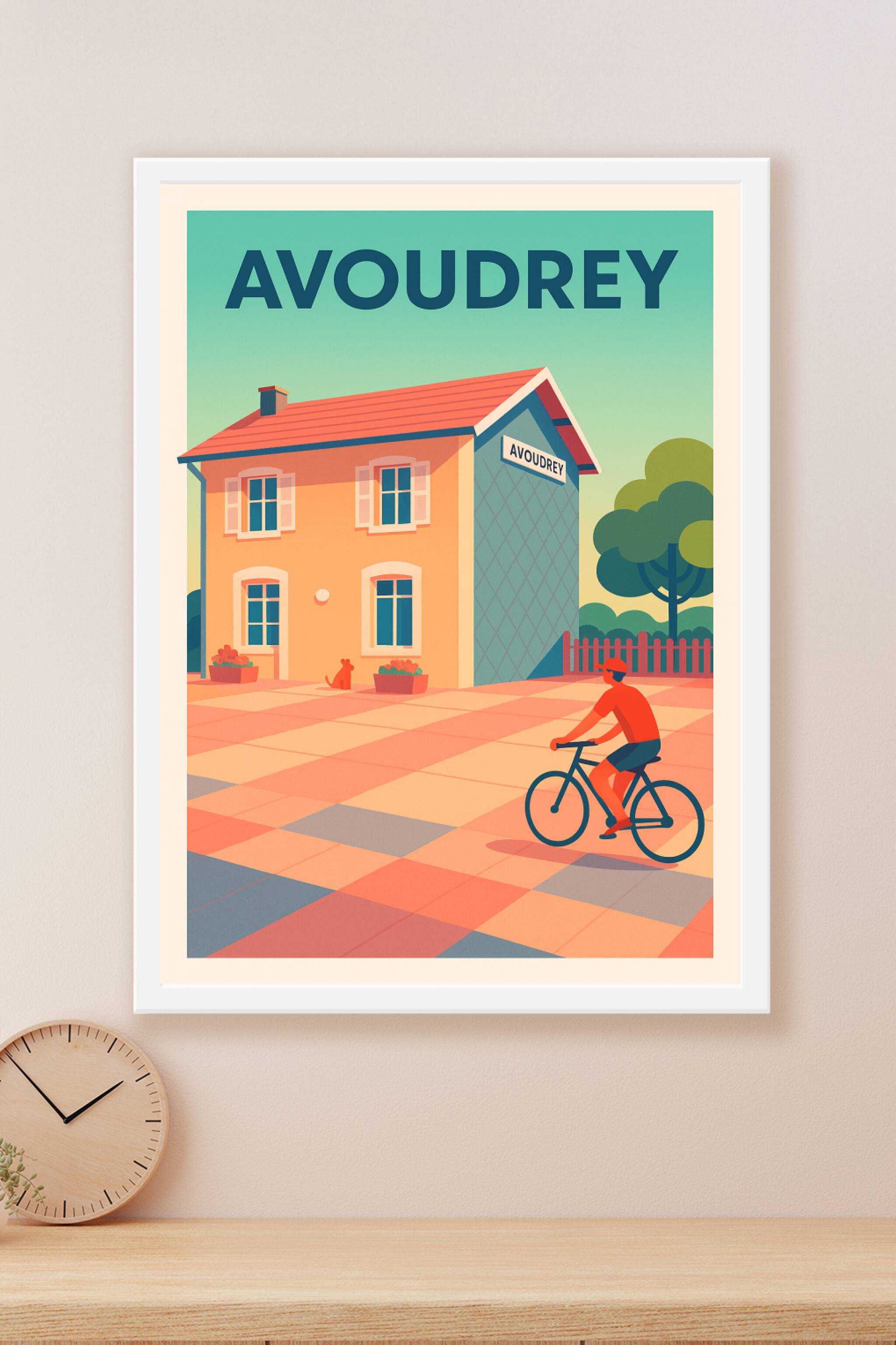 Découvrez l'atmosphère tranquille d'Avoudrey avec cette affiche illustrée où se mêlent douceur des couleurs pastel et ambiance de village paisible. Un cycliste flâne devant une maison typique, symbole d'une vie simple et harmonieuse.Ce poster est imprimé en tirage "Fine Art" sur papier 305g coton, garantissant une qualité d'impression et une finesse des couleurs exceptionnelles. Disponible en formats A1 à A4, avec ou sans cadre, cette affiche apportera une touche d'authenticité et de sérénité à votre décoration intérieure. Offrez-vous un souvenir raffiné d'Avoudrey ou un cadeau unique pour les amateurs de lieux empreints de calme et de charme.