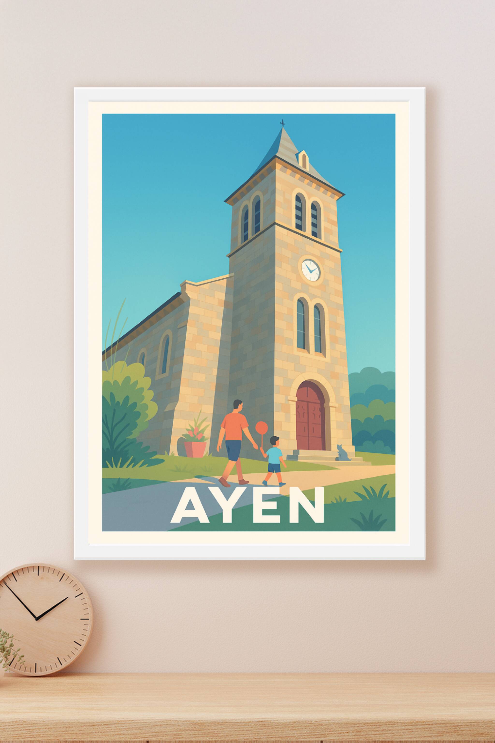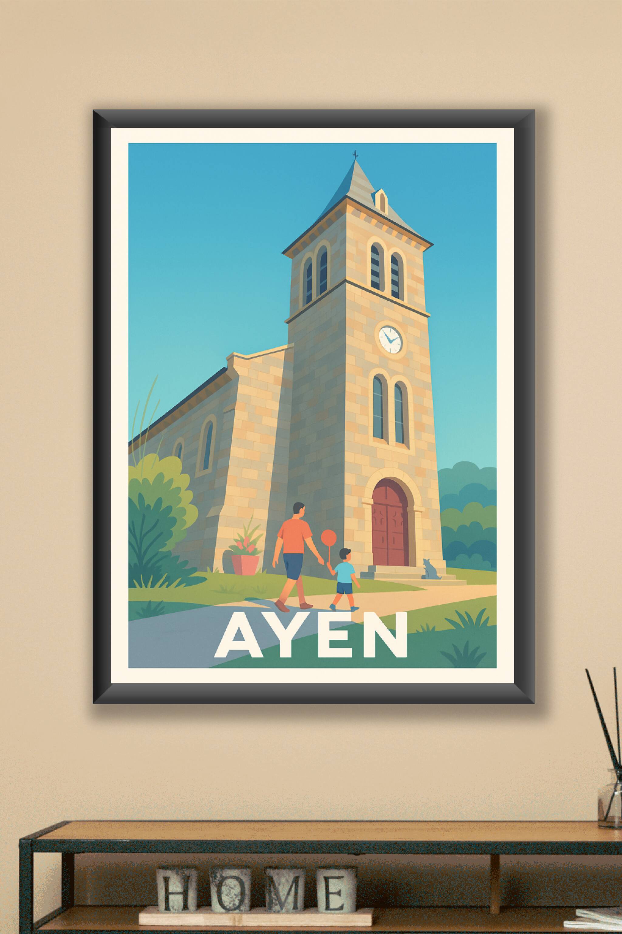 Découvrez le calme et la simplicité d'Ayén avec cette affiche illustrée mettant en avant son clocher emblématique baigné par une lumière douce. Le ...