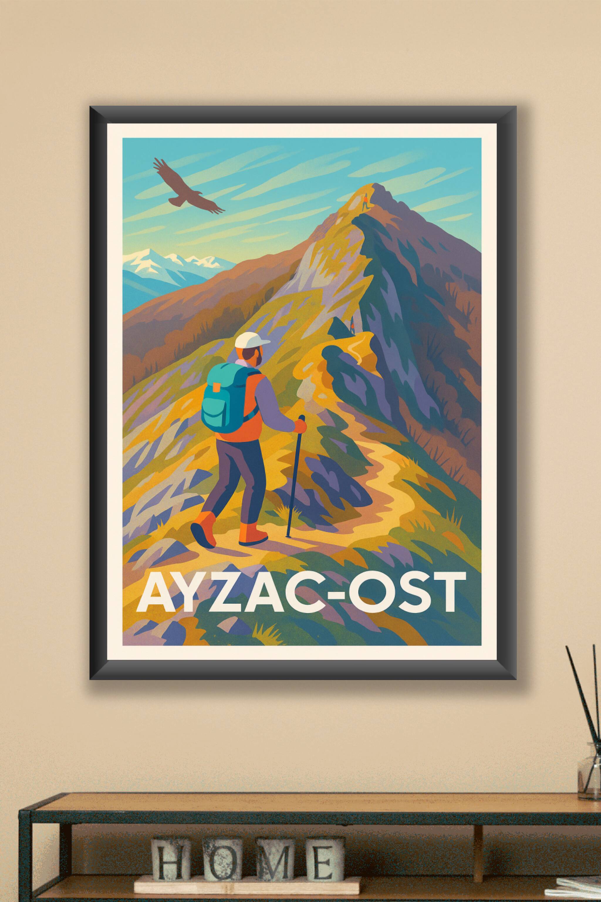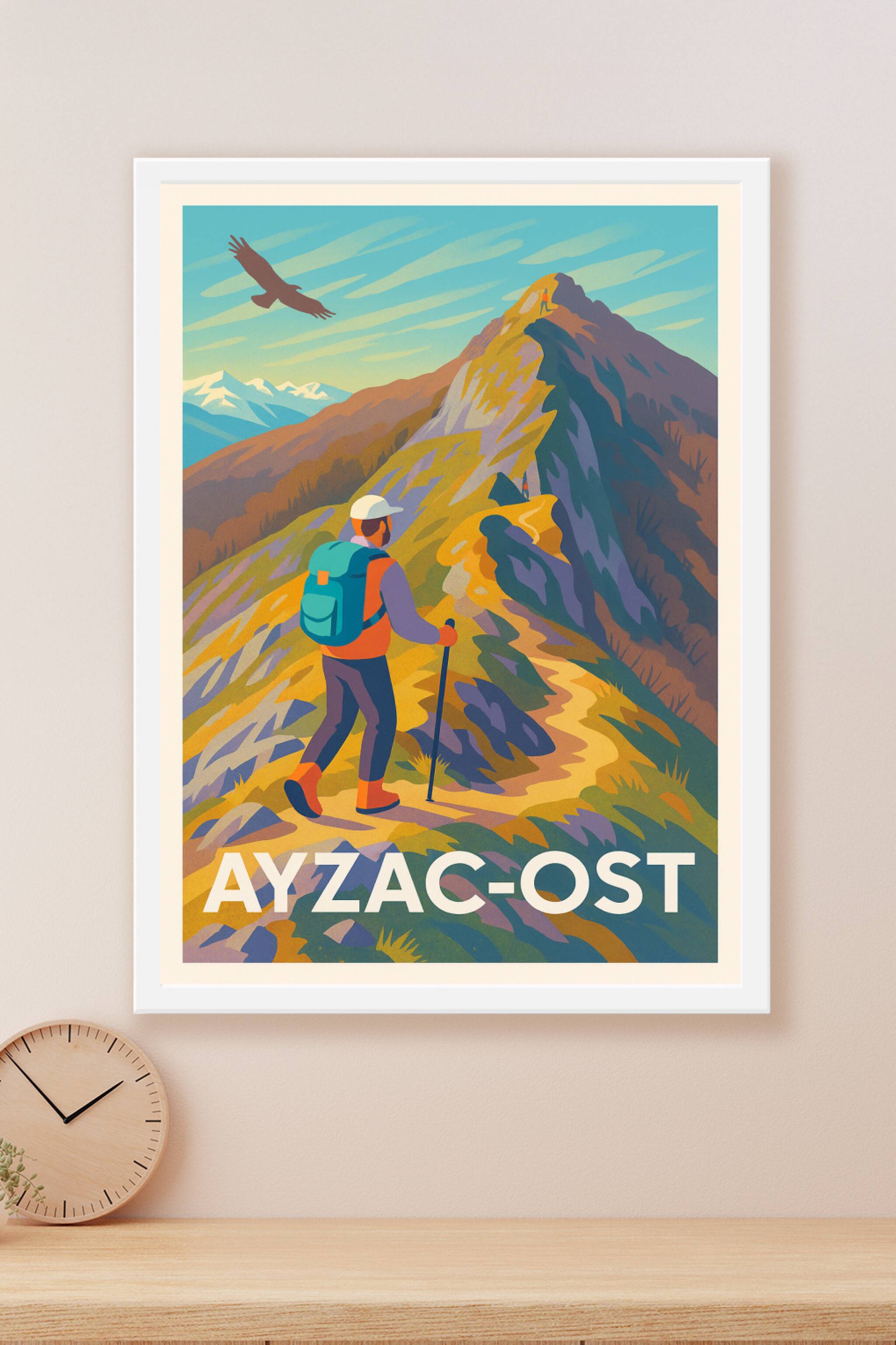 Découvrez la beauté sauvage des paysages montagneux d'Ayzac-Ost avec cette affiche vintage mettant en scène un randonneur contemplant les sommets a...