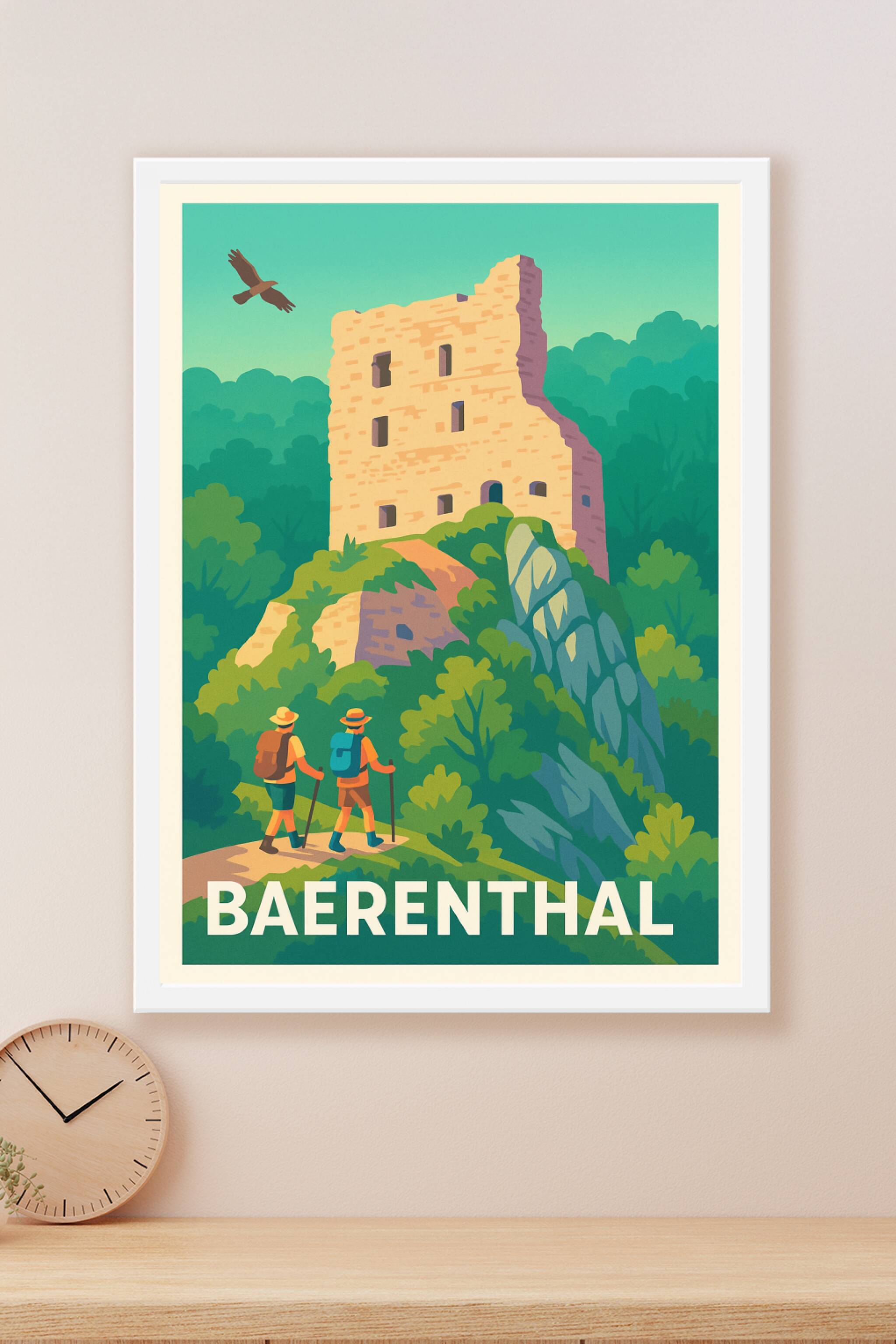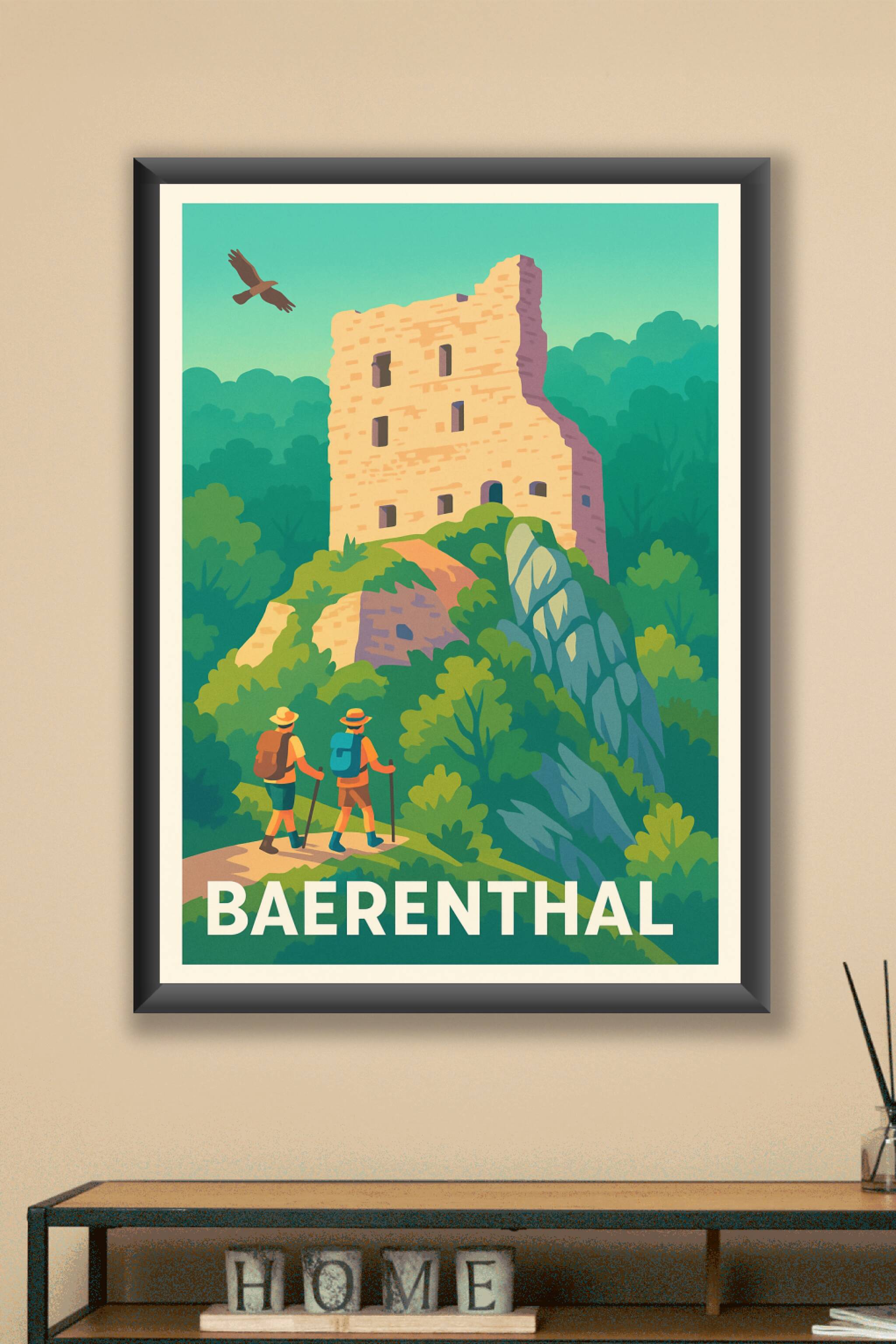 Découvrez la richesse naturelle et historique de Baerenthal avec cette affiche illustrée mettant en scène une ancienne ruine au sommet d'une collin...
