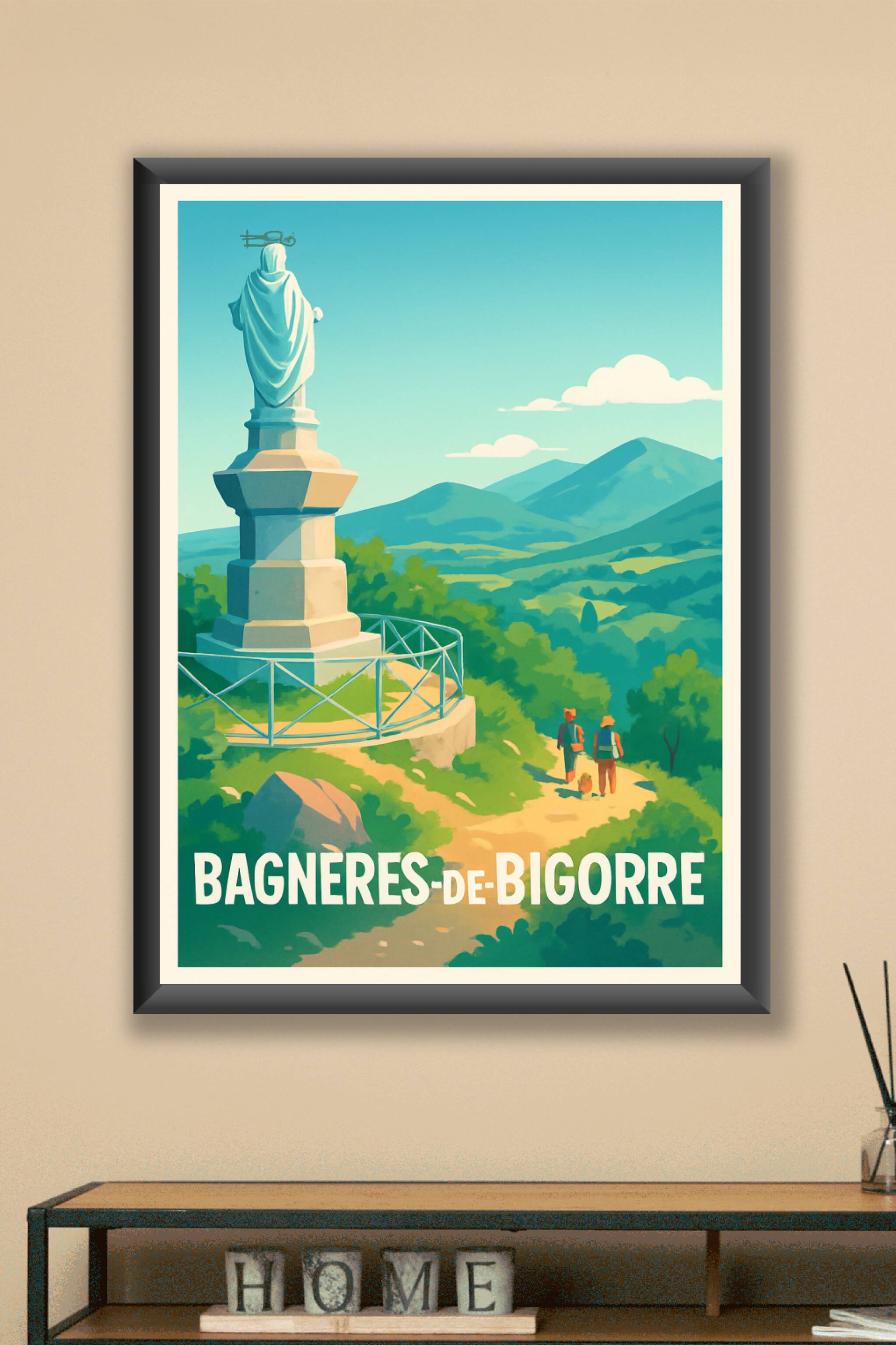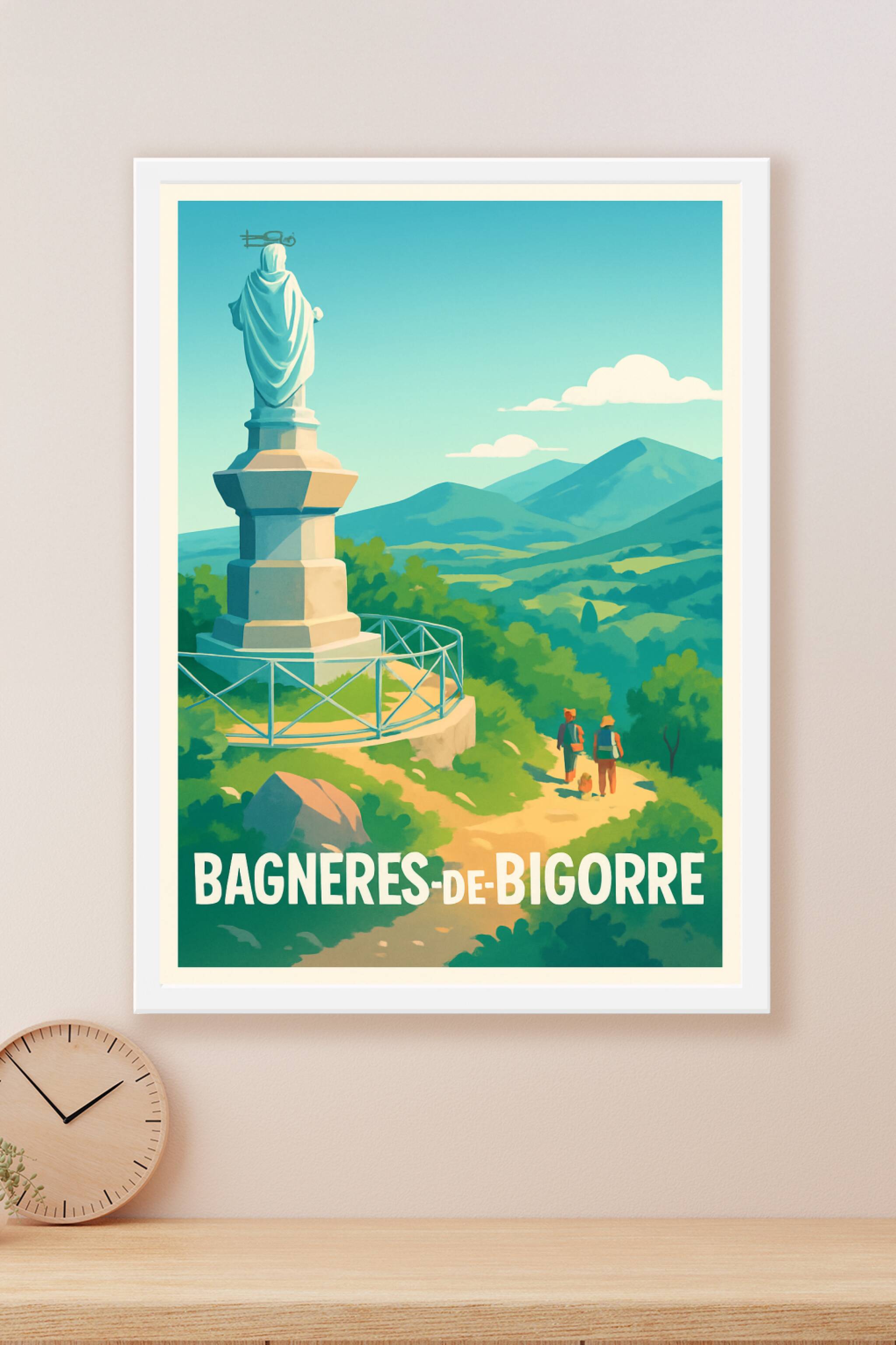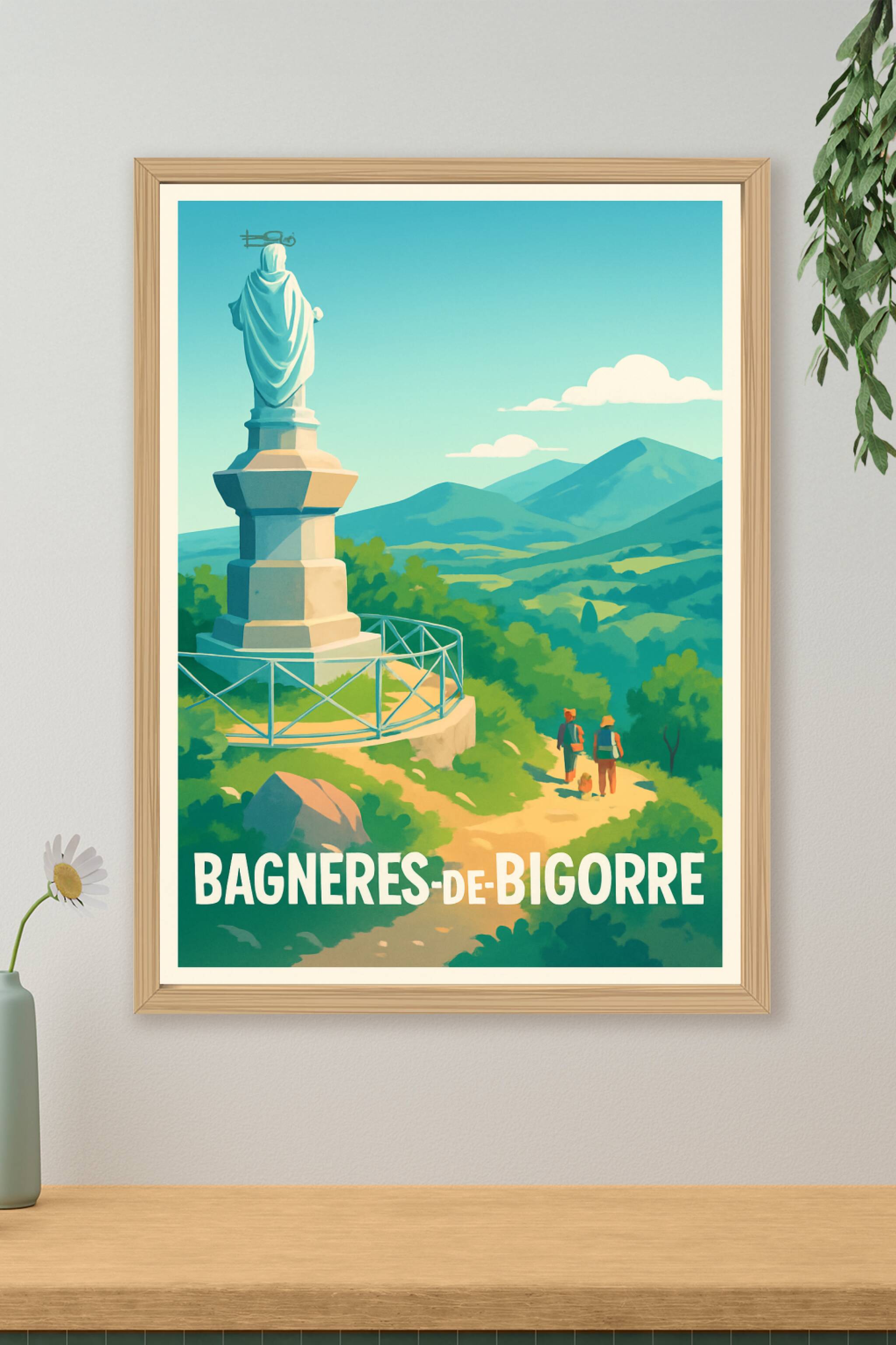 Découvrez la beauté paisible de Bagnères-de-Bigorre avec cette affiche illustrée mettant en scène une statue emblématique surplombant un paysage ve...