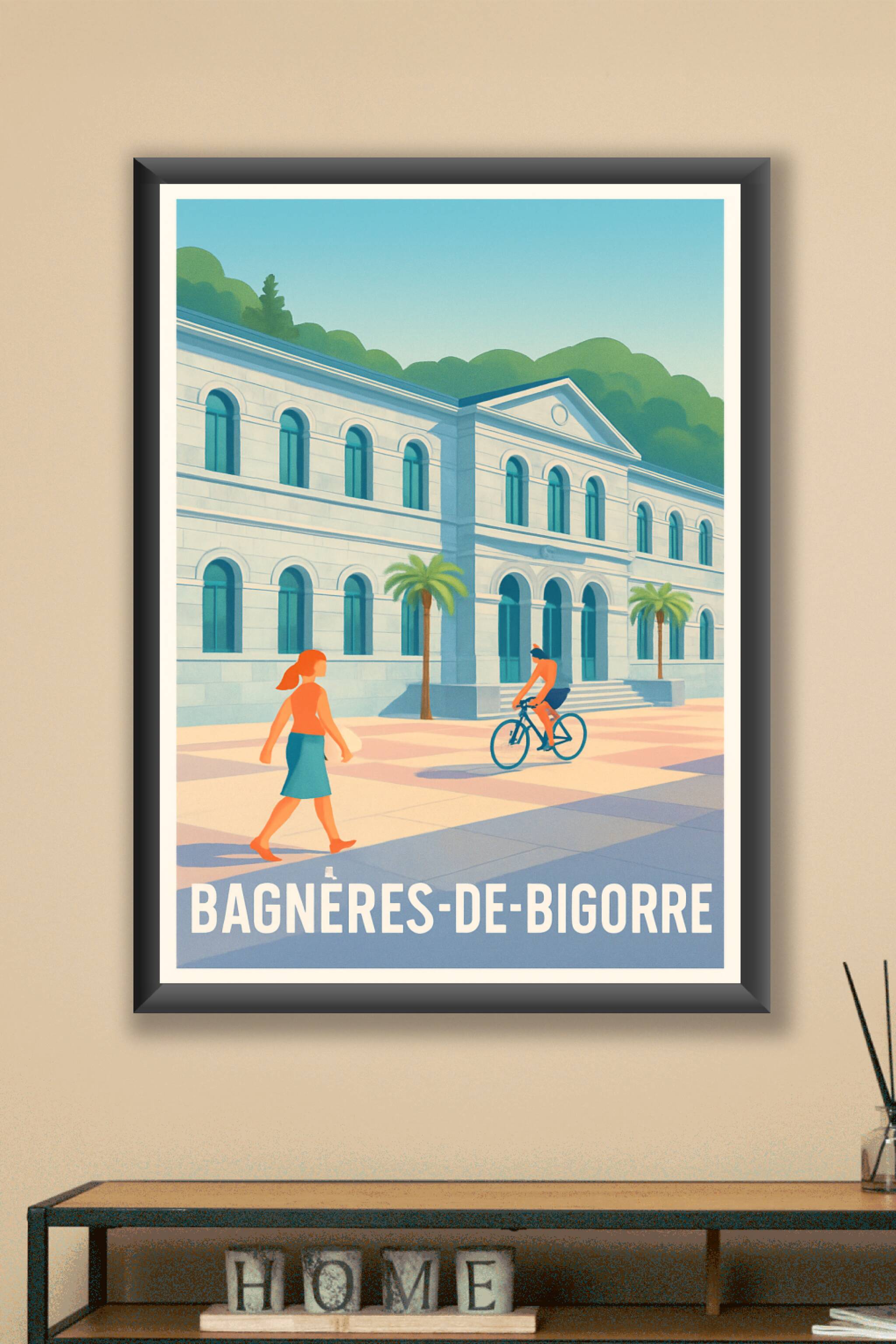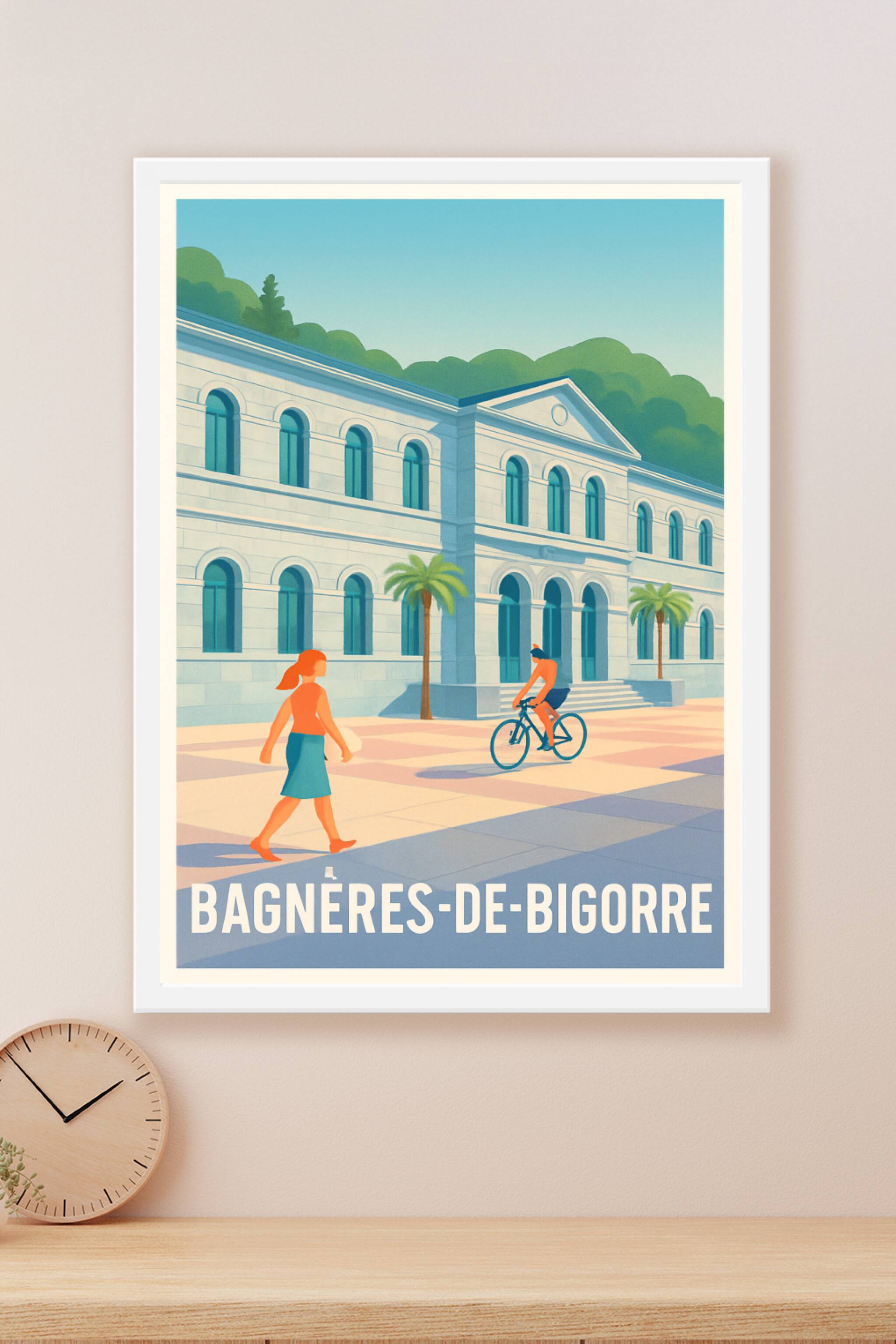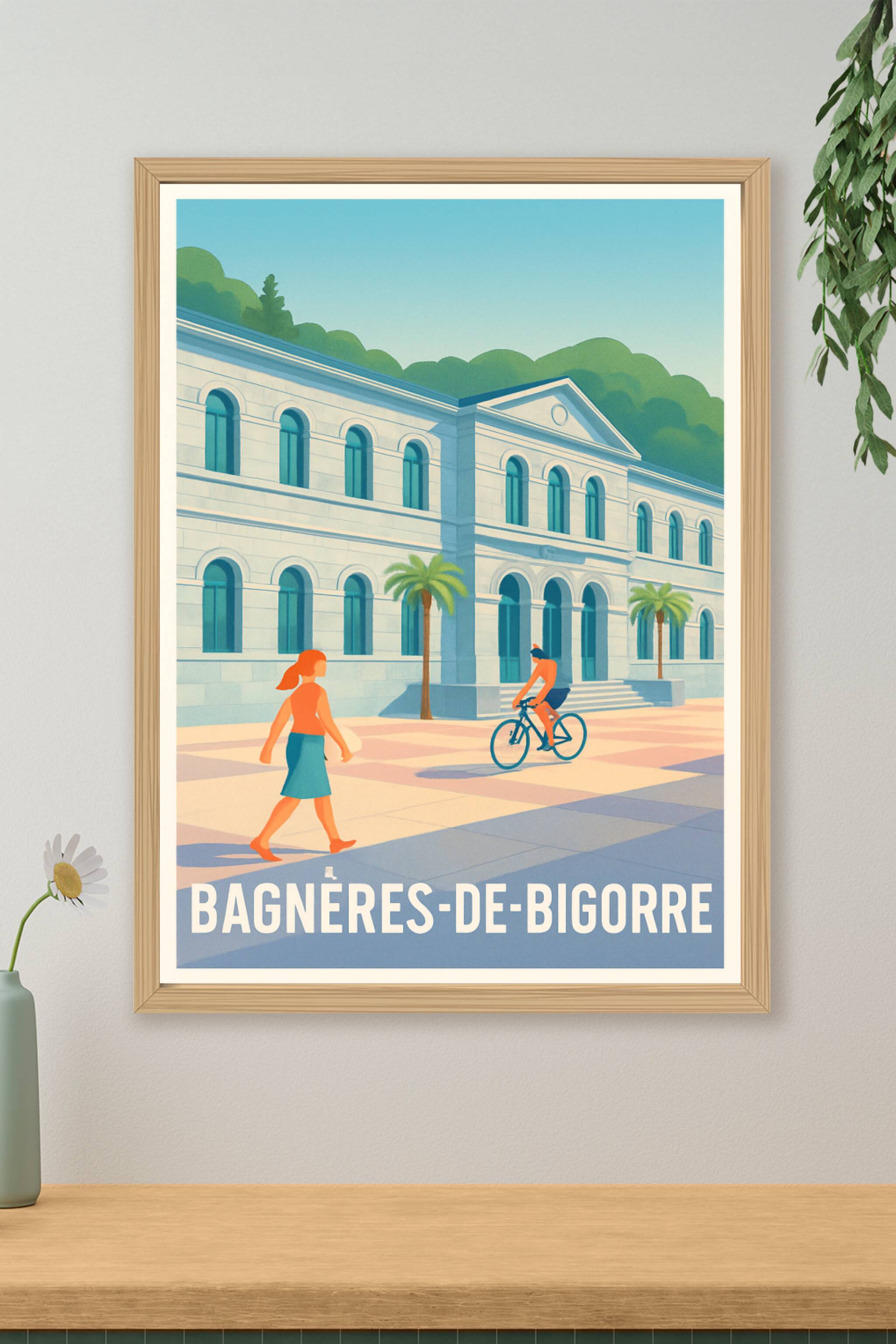Découvrez cette affiche illustrée capturant l'élégance architecturale de Bagnères-de-Bigorre sous un ciel azur lumineux. Ce poster met en scène une...