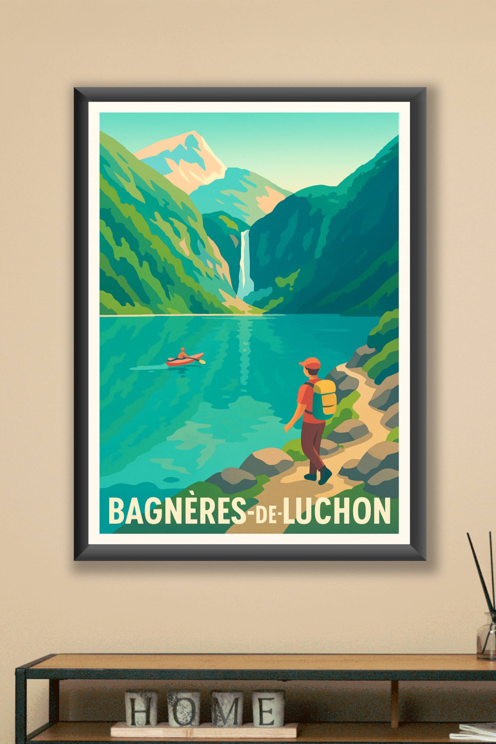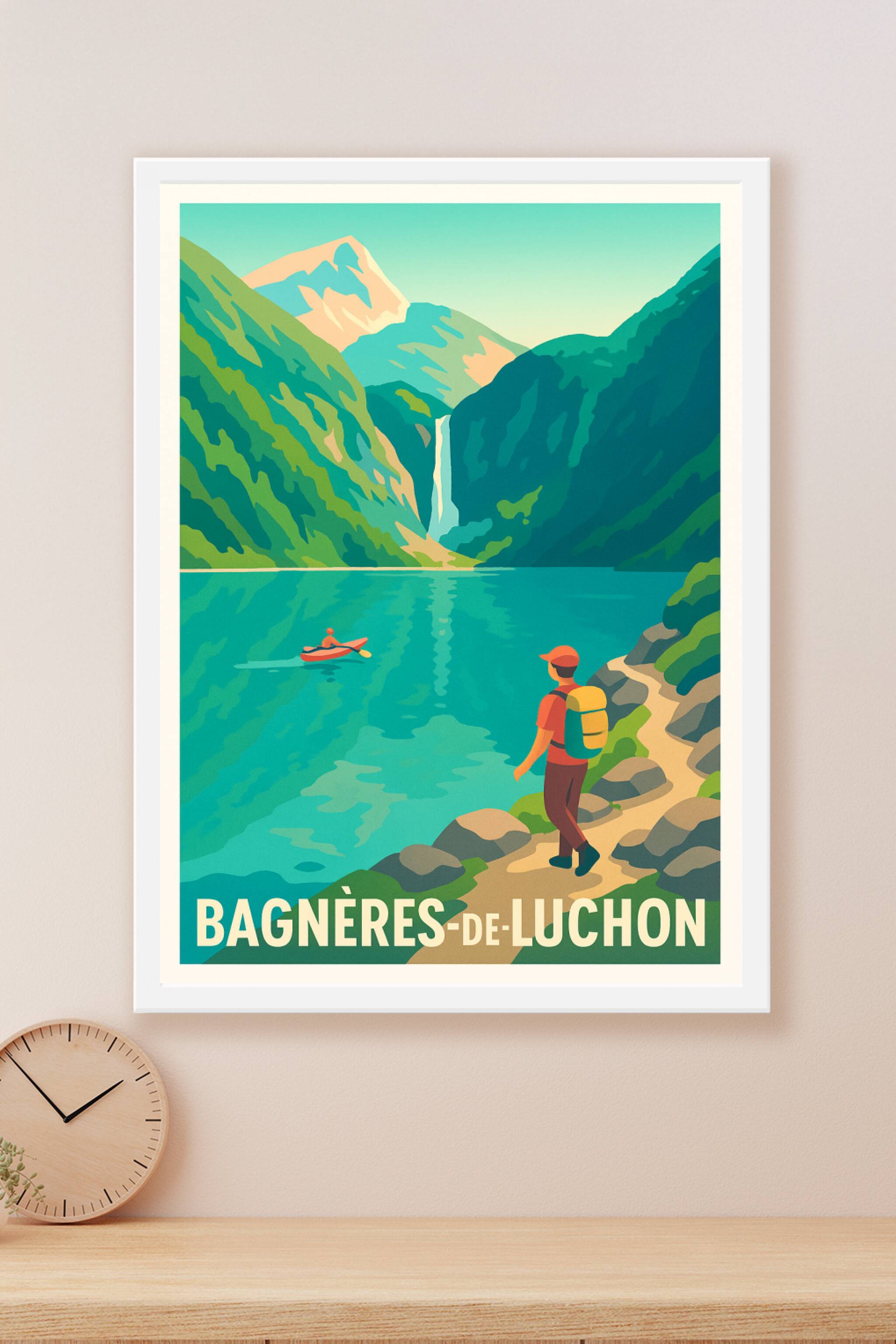 Découvrez la beauté épurée et apaisante de Bagnères-de-Luchon avec cette affiche illustrée aux couleurs vives et au style rétro. Représentant un paysage de montagnes majestueuses, une cascade et un lac tranquille où une personne en kayak s'aventure, ce poster invite à l'évasion et à la détente en pleine nature. Imprimé en qualité "Fine Art" sur papier 305g coton, ce tirage vous garantit une finesse d'impression et une durabilité exceptionnelles. Disponible en plusieurs formats du A1 au A4, avec ou sans cadre, cette affiche s'intègre parfaitement dans tout type d'intérieur pour apporter une touche de fraîcheur et d'aventure pyrénéenne. Fabriquée en France, elle constitue également un cadeau idéal pour les amoureux de la montagne et des grands espaces.