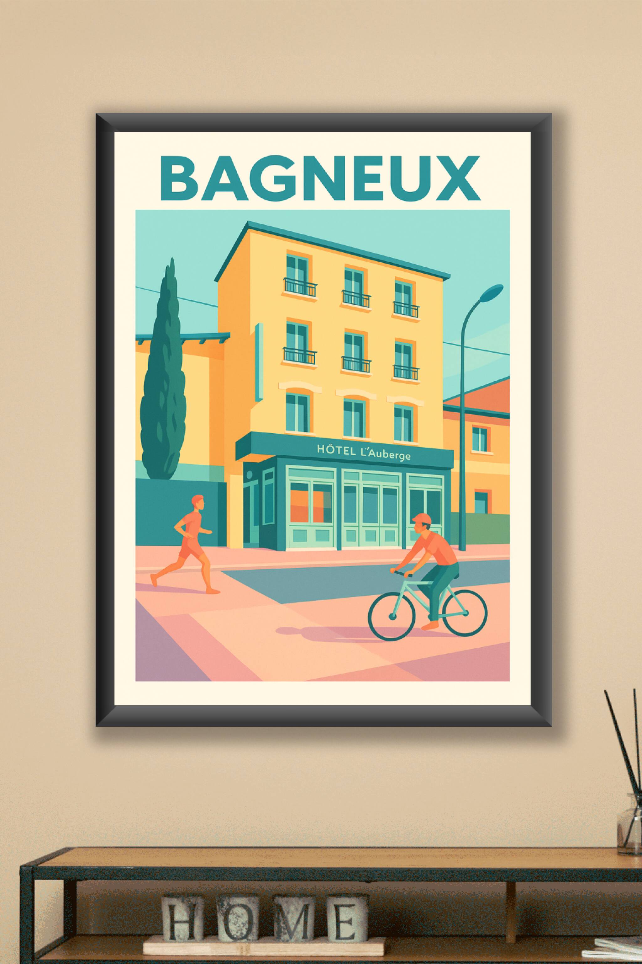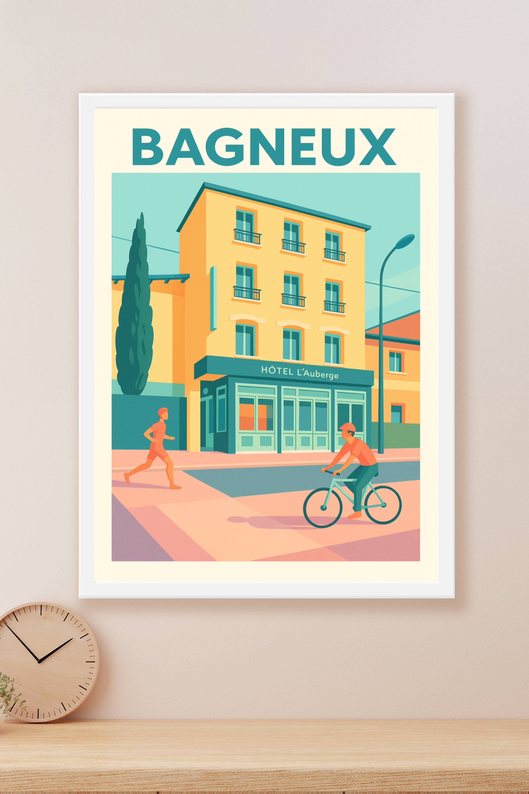 Découvrez une scène paisible et chaleureuse de Bagneux avec cette affiche illustrée au style moderne et épuré. L'image met en avant l'hôtel L'Auberge, un bâtiment emblématique baigné de couleurs douces, avec un joggeur et un cycliste symbolisant le dynamisme de la ville.Ce poster est imprimé en tirage "Fine Art" sur papier de haute qualité 305g coton, garantissant une texture et une longévité exceptionnelles. Disponible en formats A1 à A4, avec ou sans cadre, il s'adapte parfaitement à votre décoration intérieure.Profitez d'une impression premium 100% fabriquée en France pour apporter une touche élégante et contemporaine à votre intérieur ou pour offrir un cadeau unique aux amateurs de cette charmante ville.