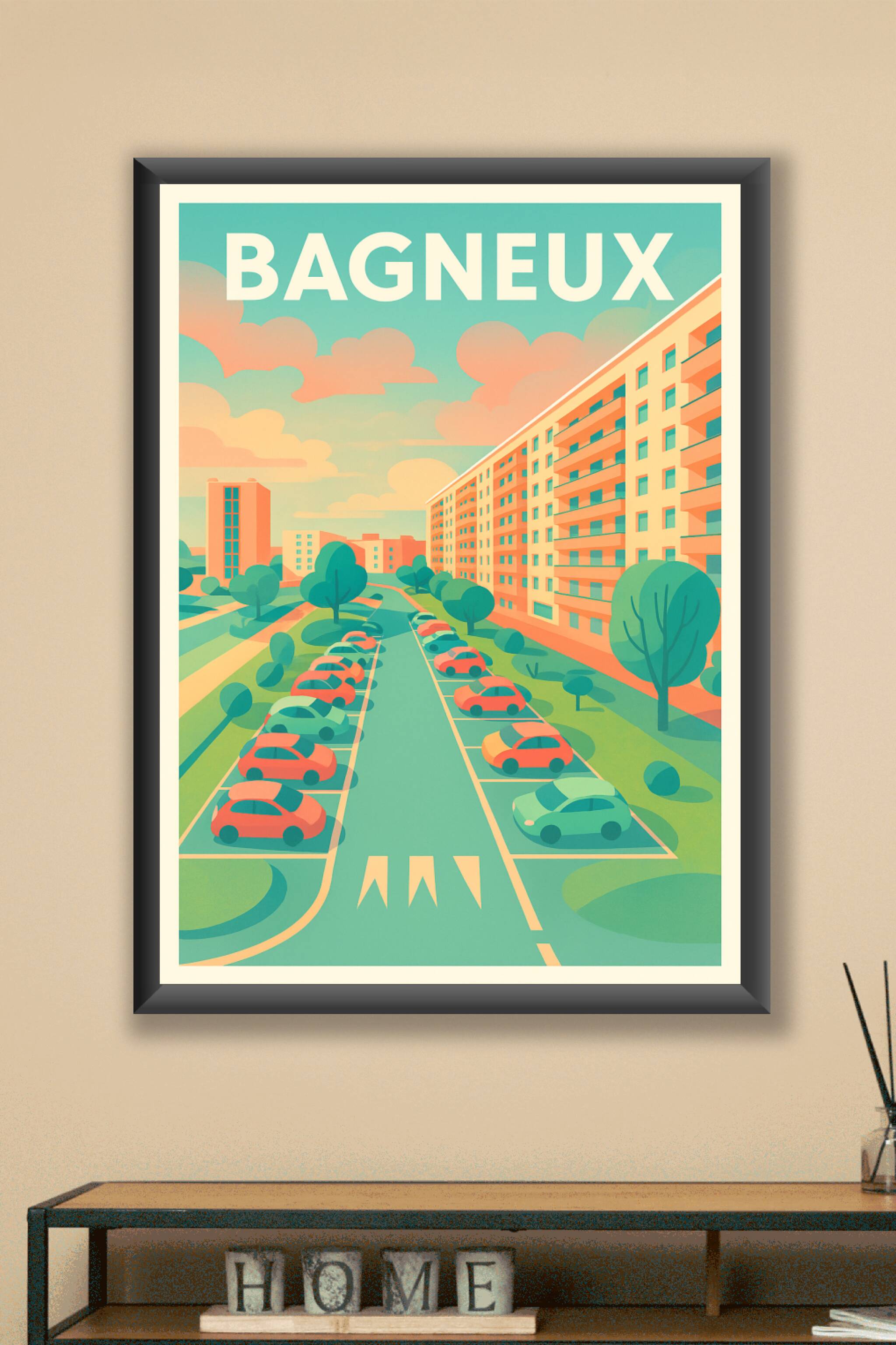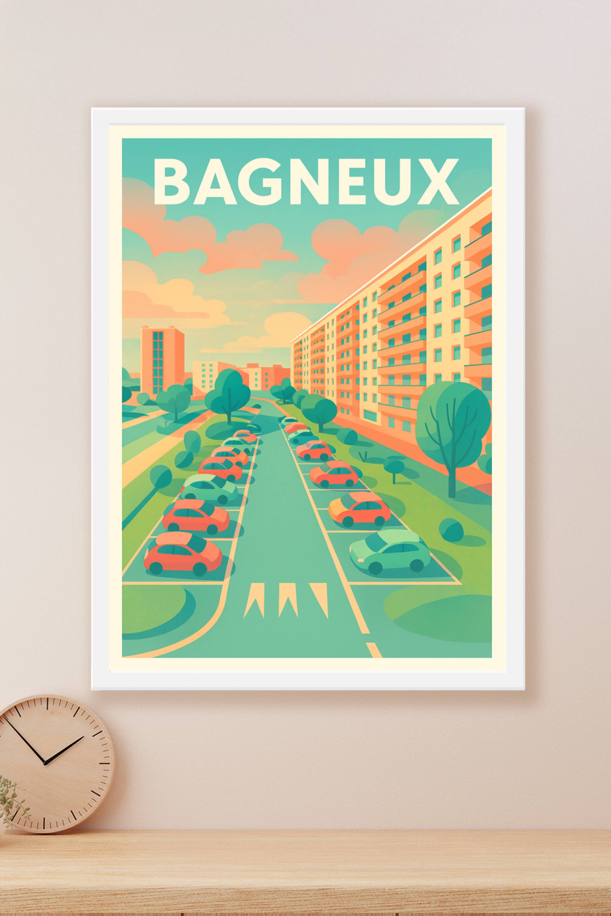 Découvrez cette affiche au design graphique moderne qui met en lumière une vue urbaine de Bagneux, sublimée par des couleurs douces et un style épu...