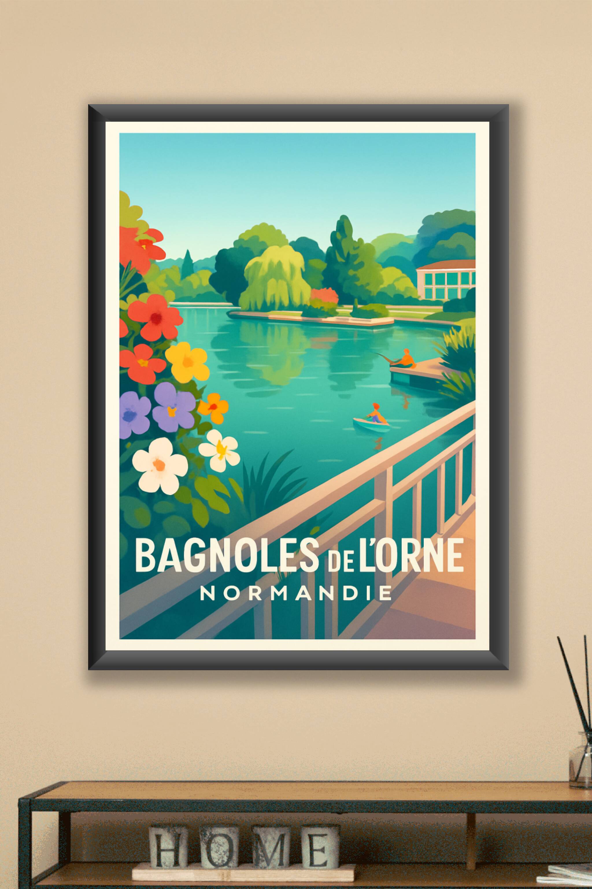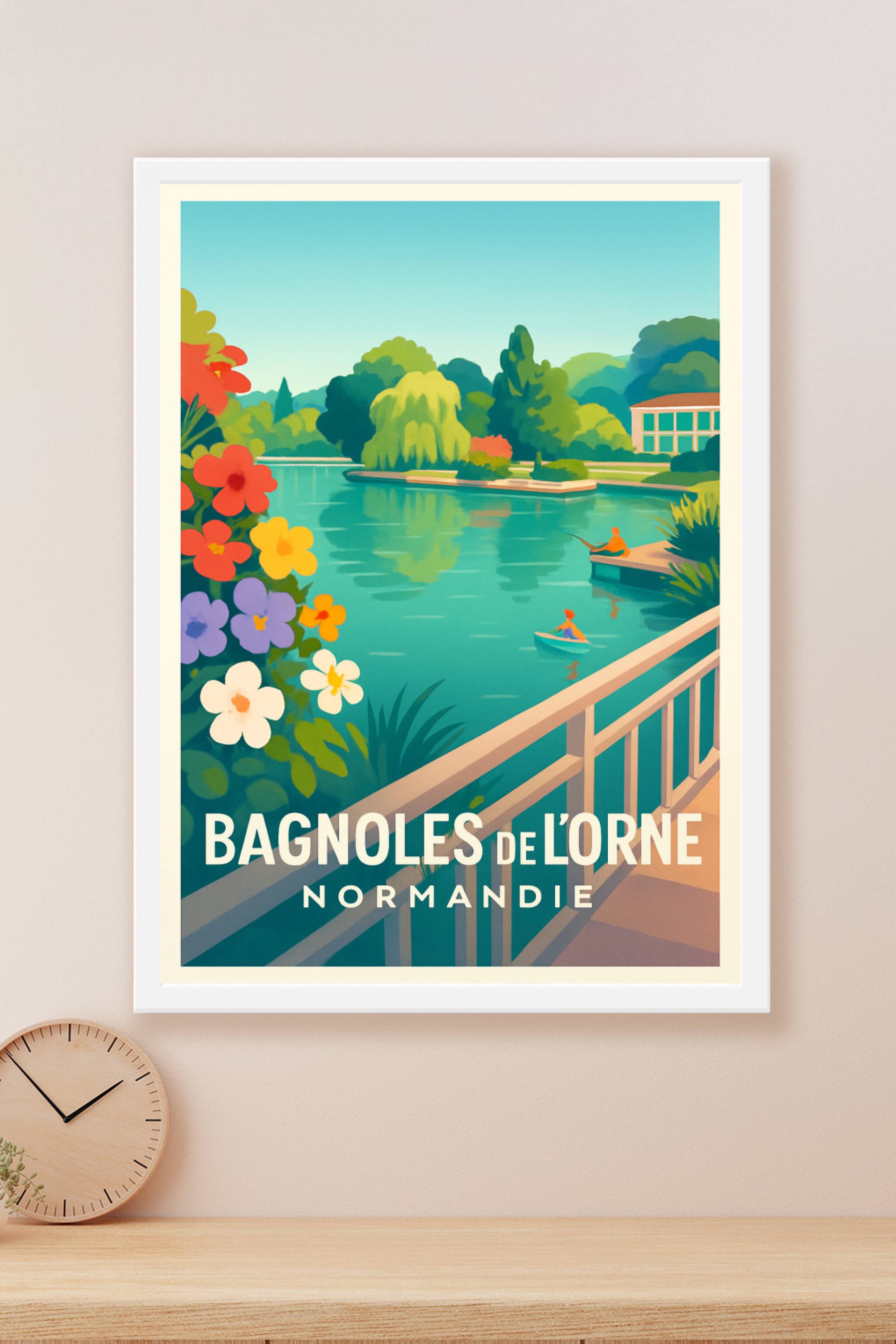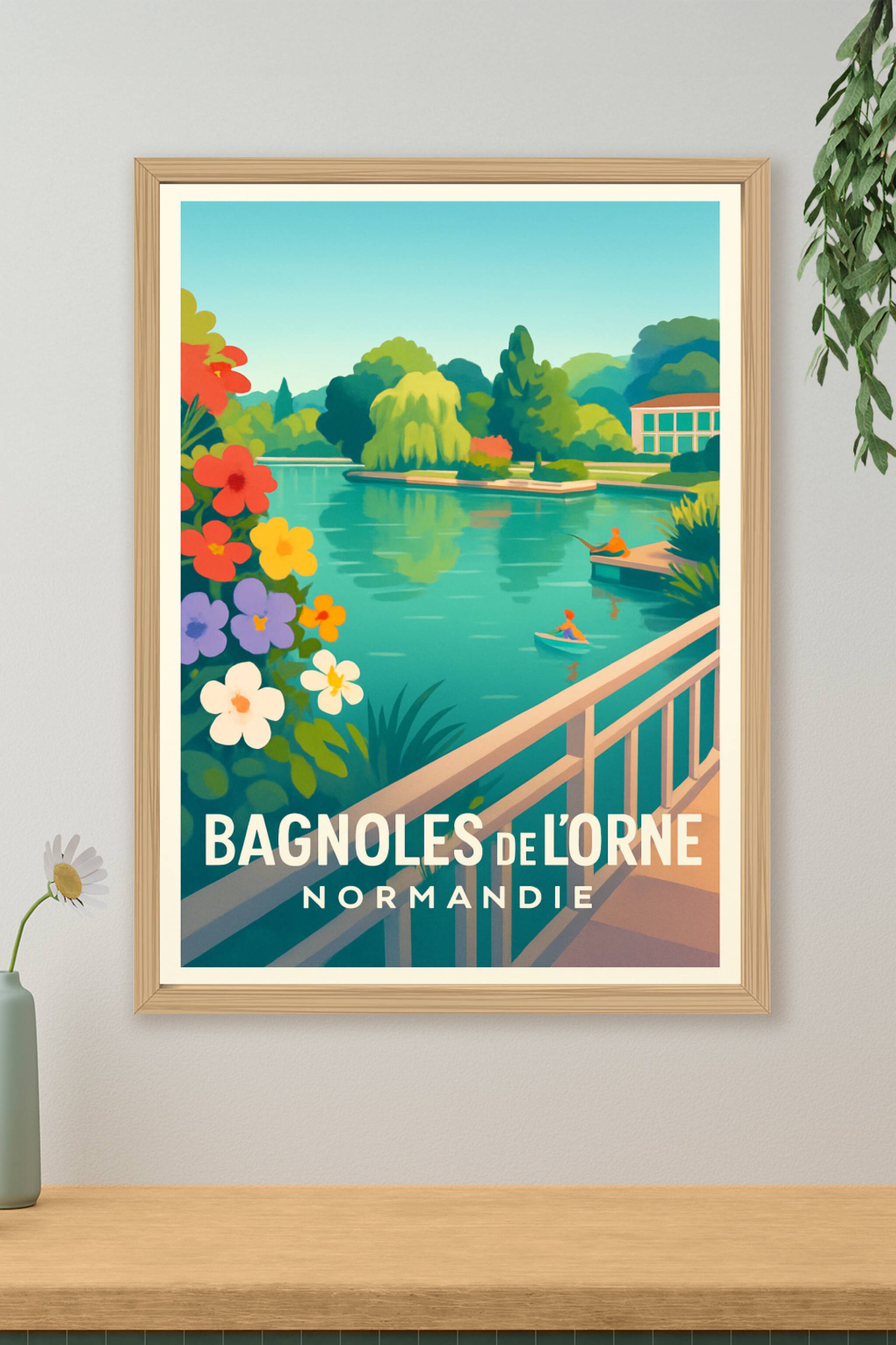 Découvrez la douceur de vivre à Bagnoles-de-l'Orne avec cette affiche au style vintage qui capture la tranquillité de la nature normande. Le lac pa...