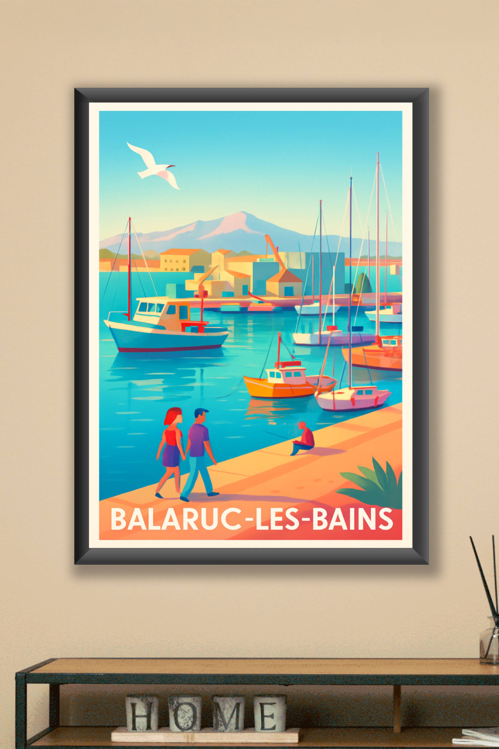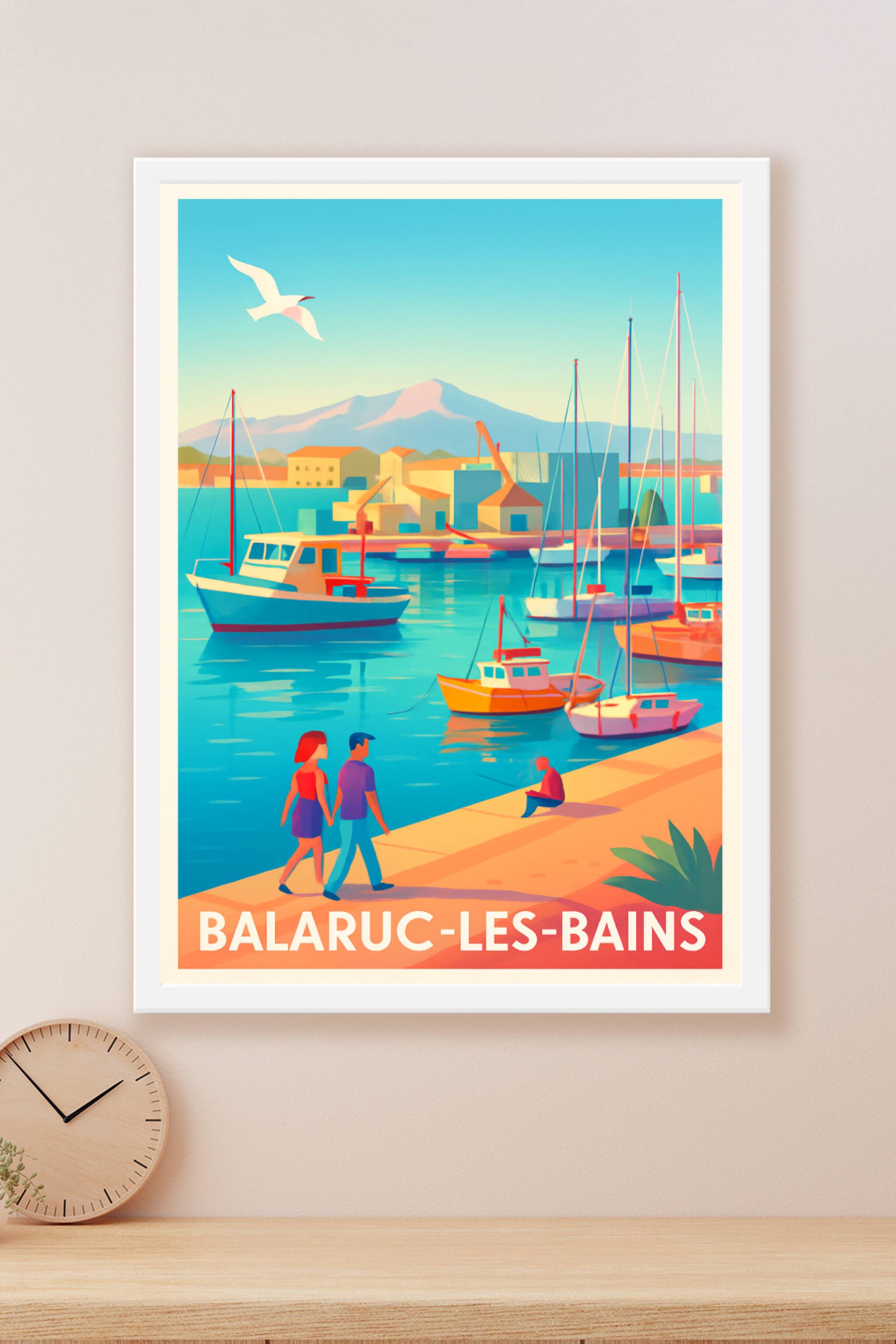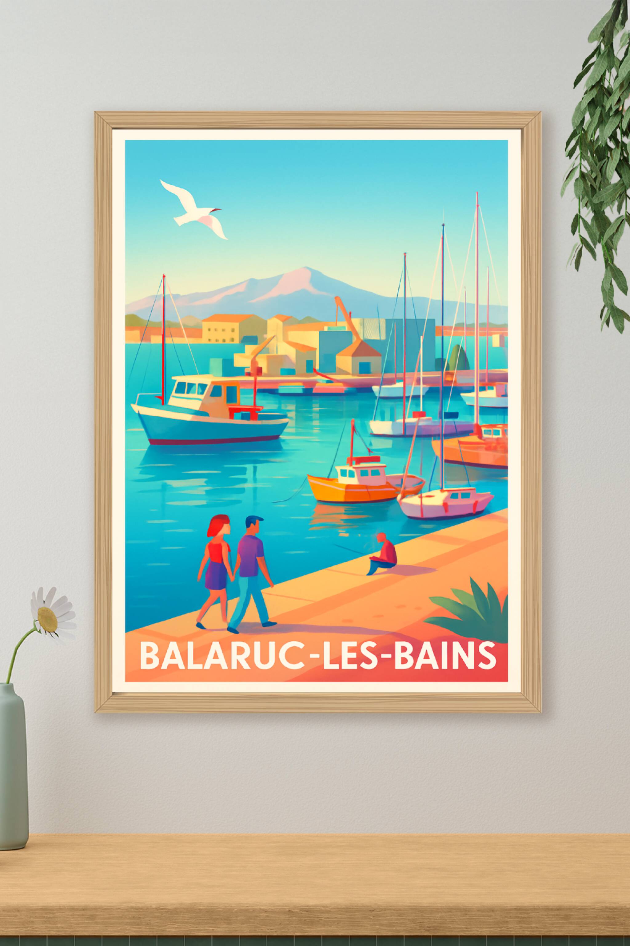 Découvrez la sérénité du port de Balaruc-les-Bains avec cette affiche aux coloris doux et lumineux, représentant un couple se promenant au bord de ...