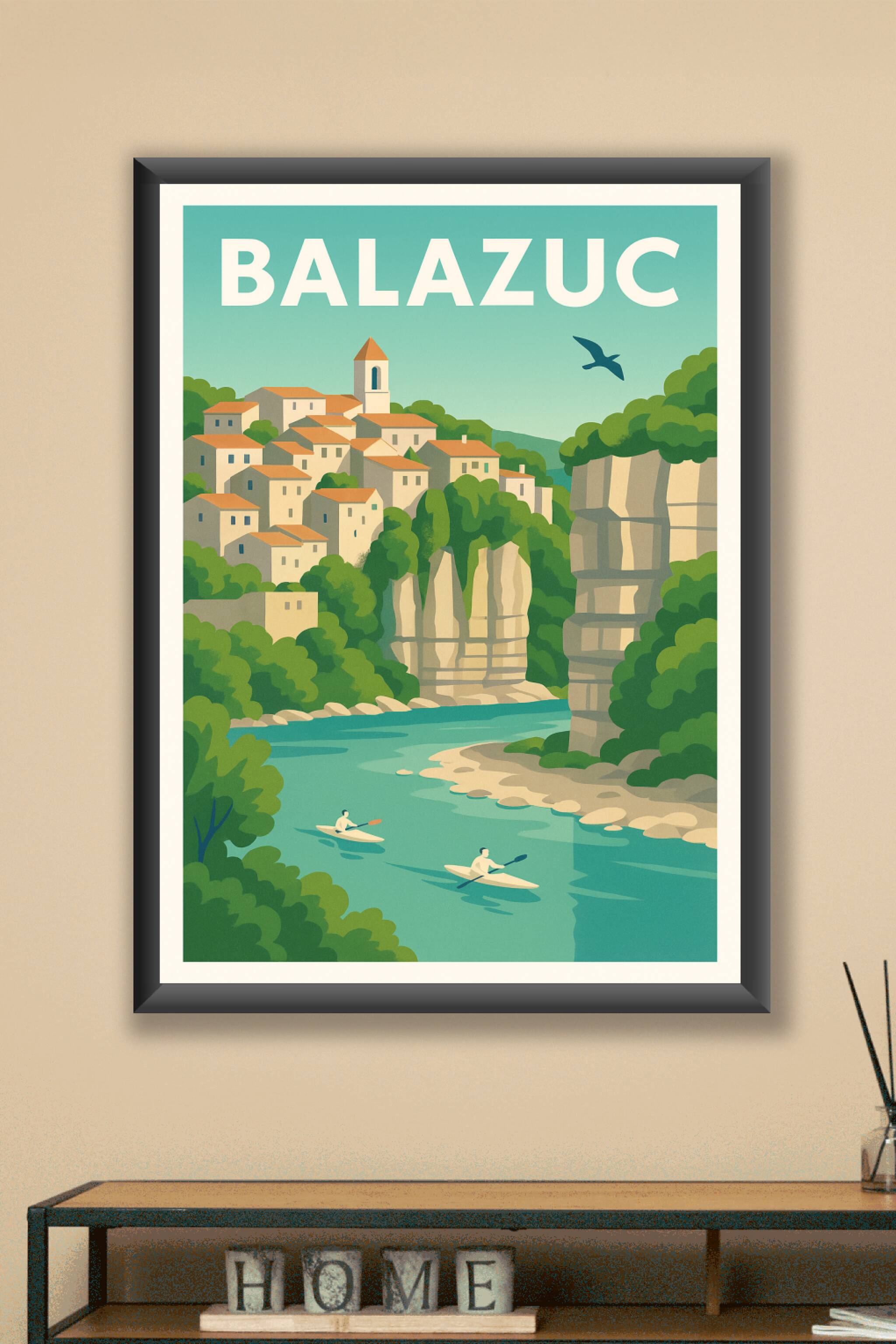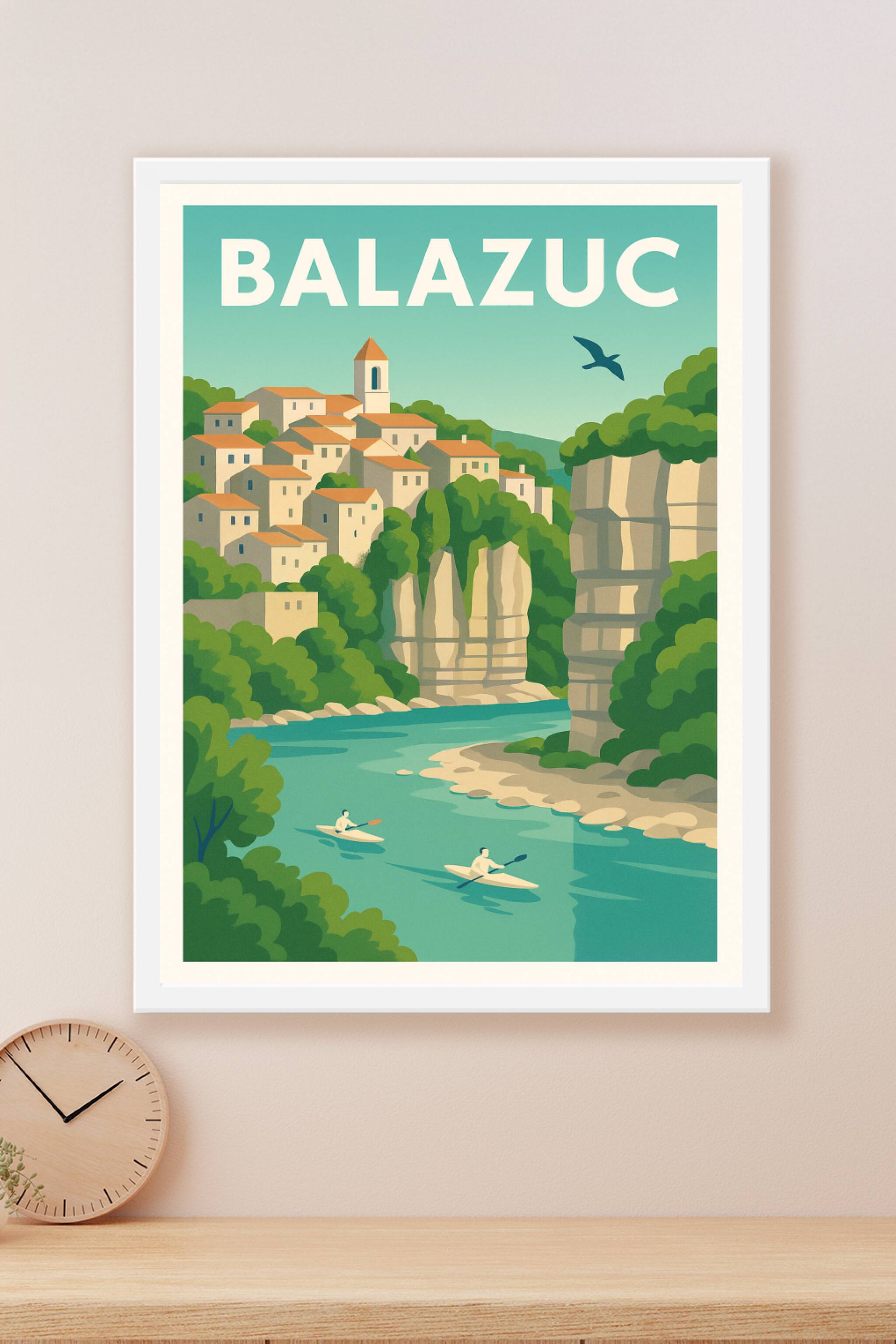 Découvrez la beauté pittoresque de Balazuc avec cette affiche au style vintage, capturant le village médiéval perché entre falaises et rivière. Ce ...