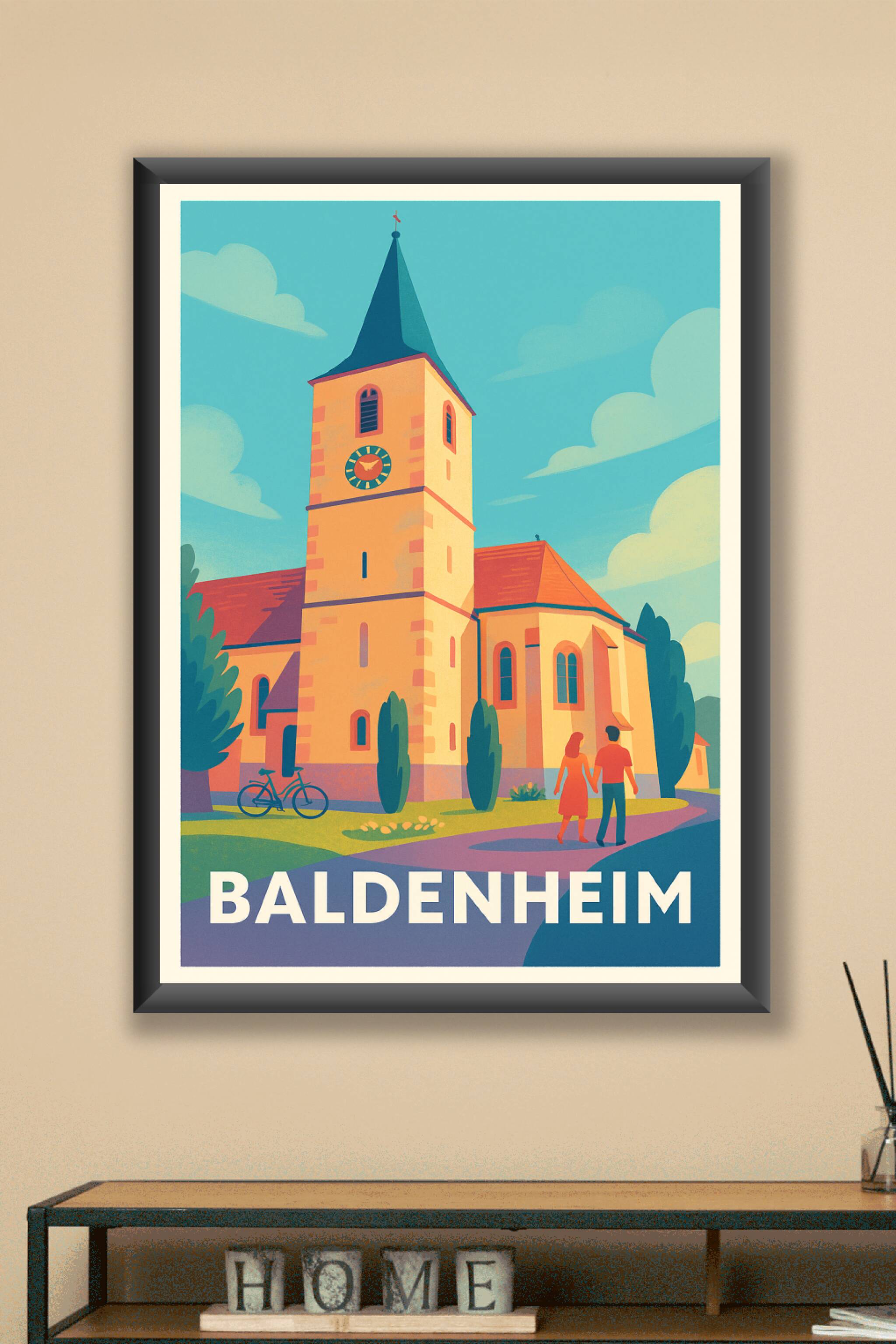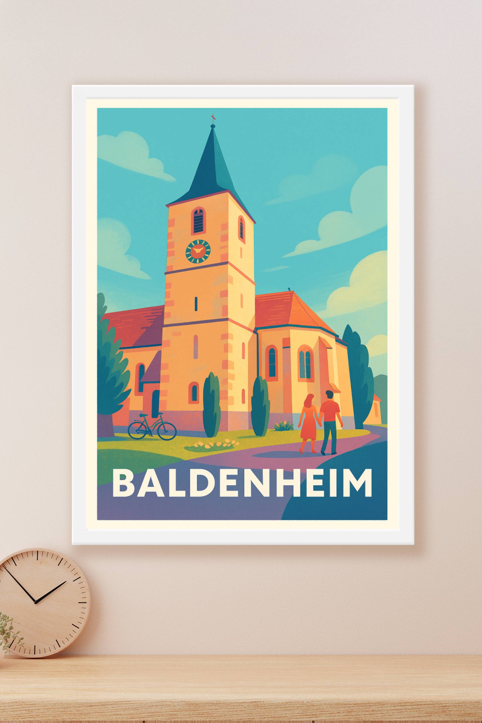 Découvrez l'élégance paisible de Baldenheim avec cette affiche illustrée mettant en scène une église typique de la région, baignée de lumière douce...