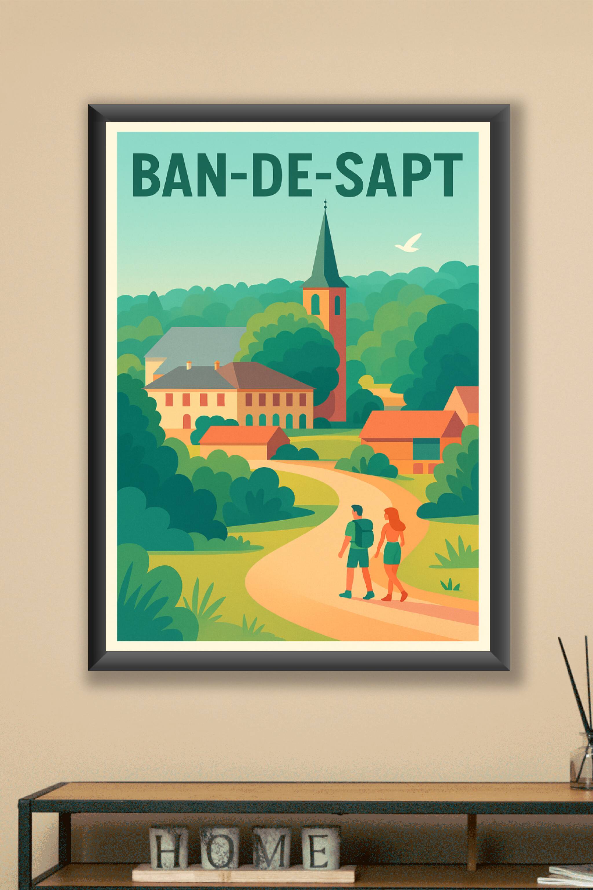 Découvrez l'atmosphère paisible et verdoyante de Ban-de-Sapt à travers cette affiche illustrée au style doux et vintage. Ce poster met en scène le ...