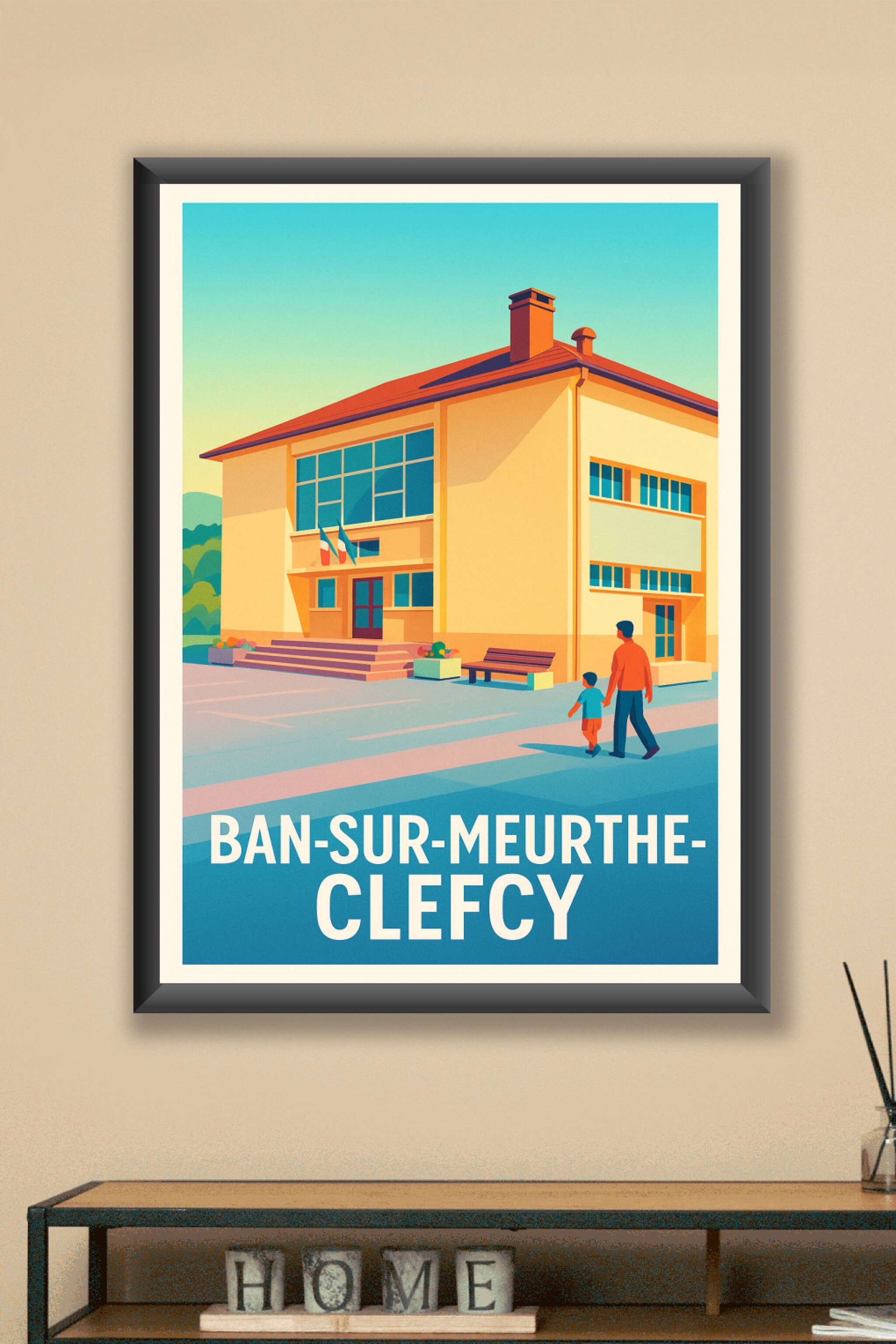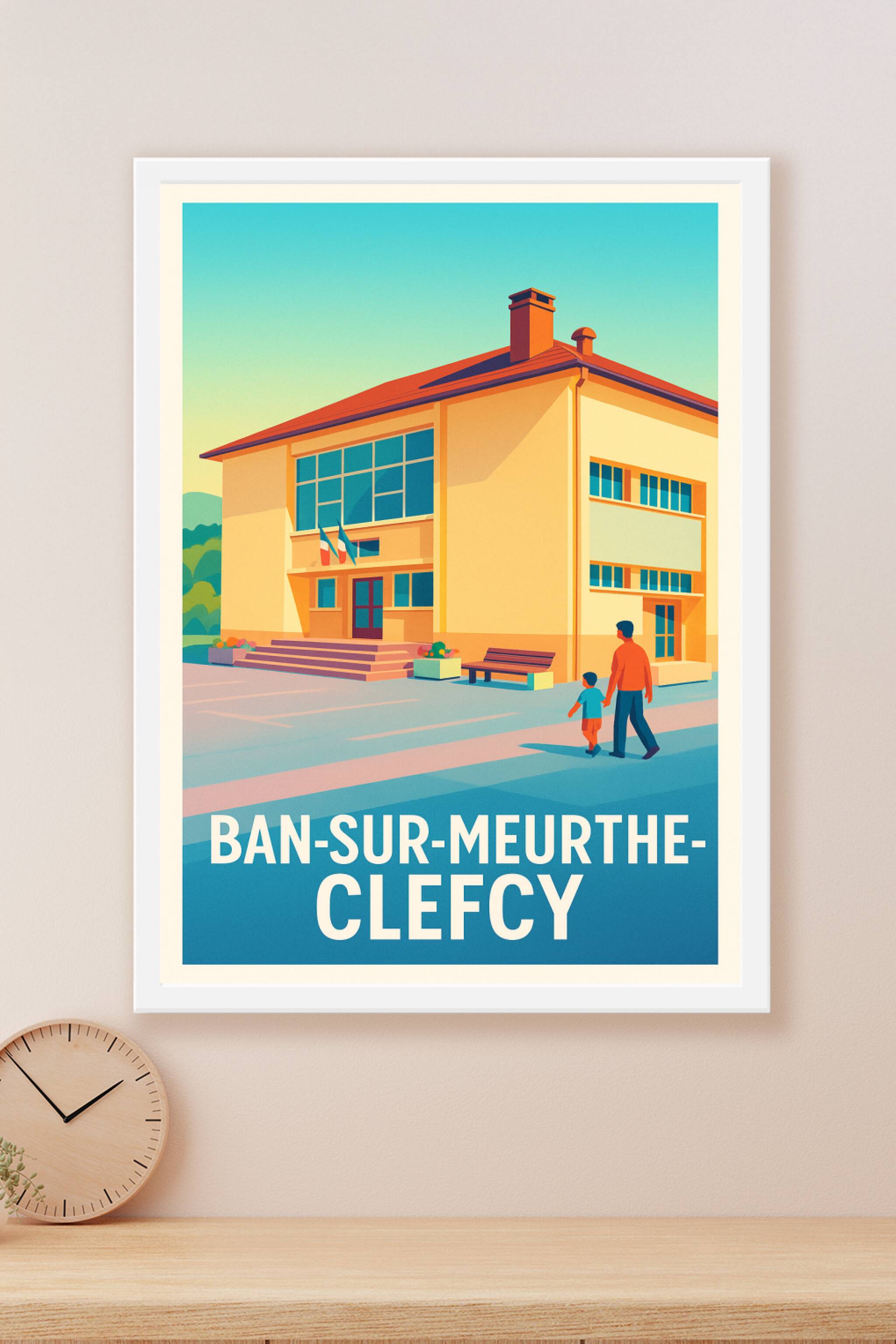 Découvrez l'atmosphère paisible de Ban-sur-Meurthe-Clefcy avec cette affiche illustrée au style rétro modernisé mettant en scène un bâtiment emblém...