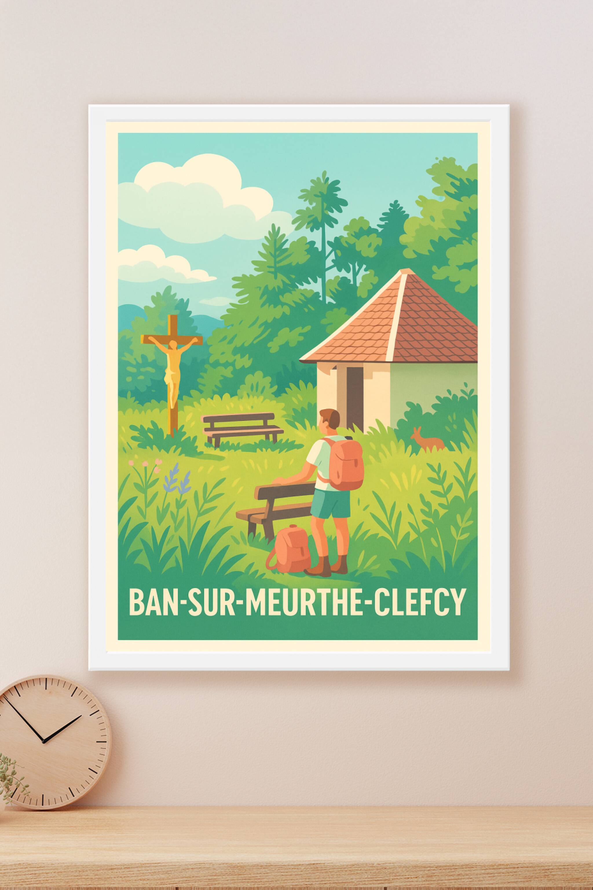 Découvrez l'ambiance paisible et verdoyante de Ban-sur-Meurthe-Clefcy avec cette affiche au style rétro et chaleureux. Ce poster met en avant un pa...