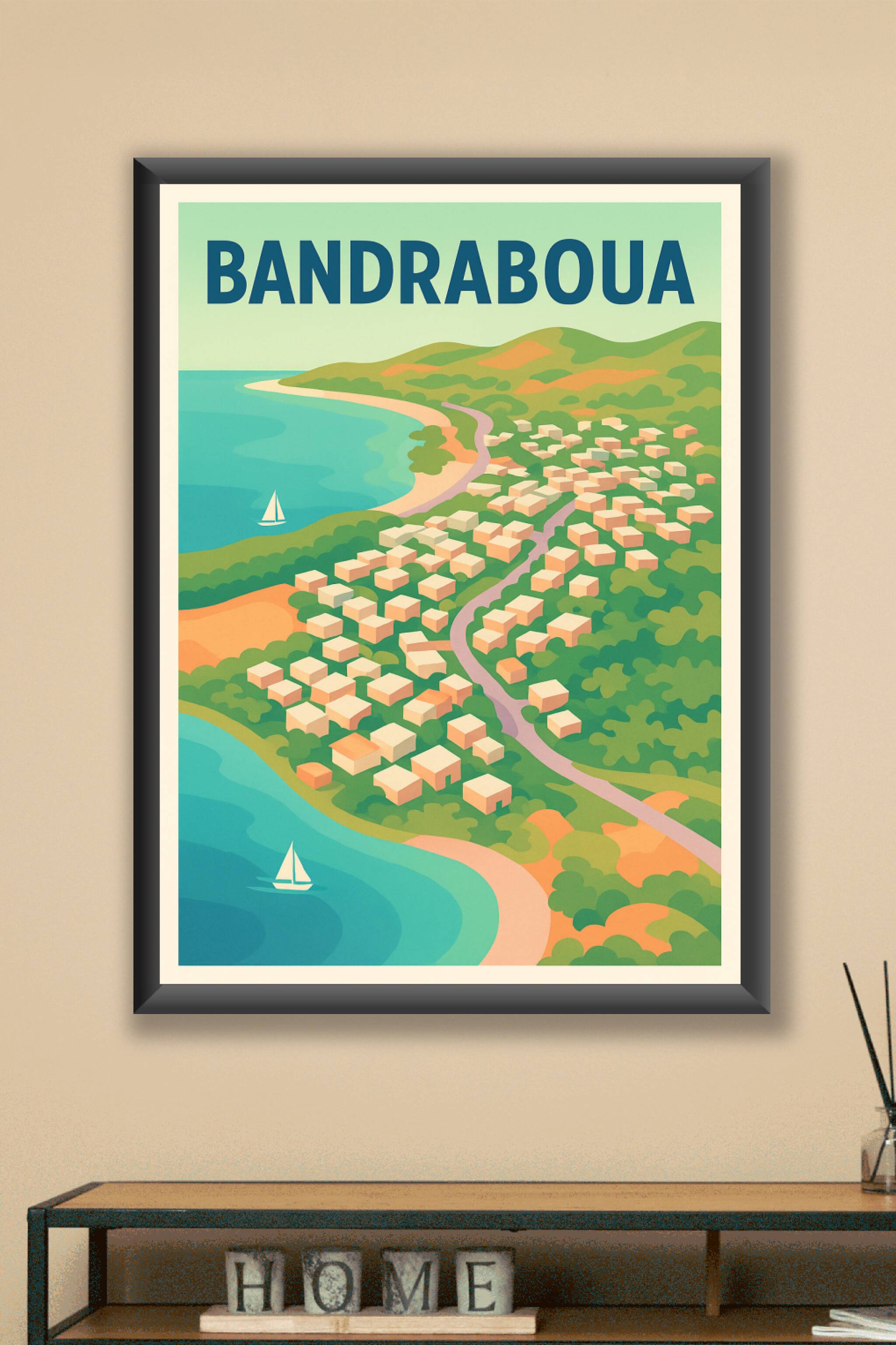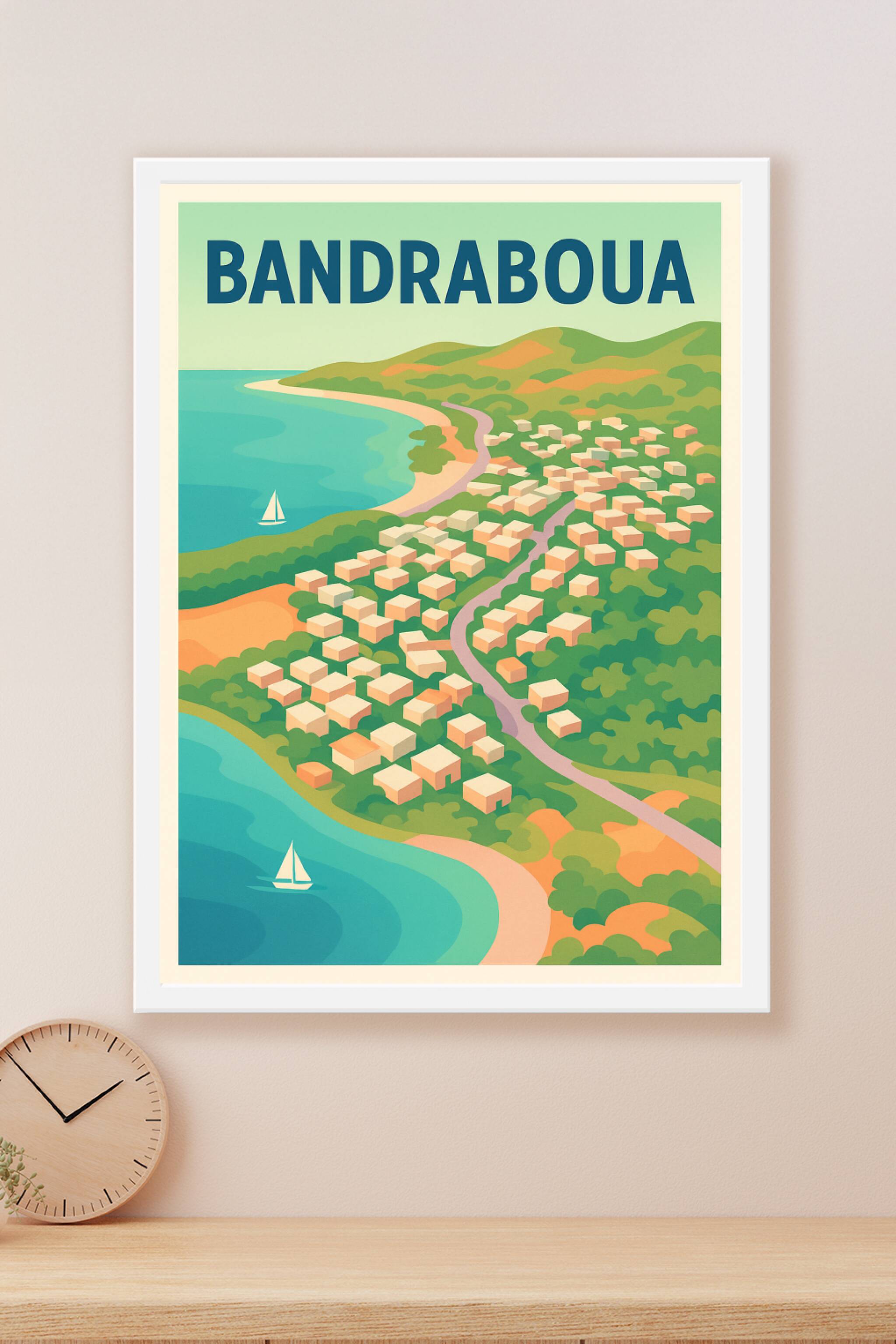 Découvrez la douceur et le charme de Bandraboua à travers cette affiche illustrée aux couleurs douces et apaisantes. Cette représentation stylisée ...