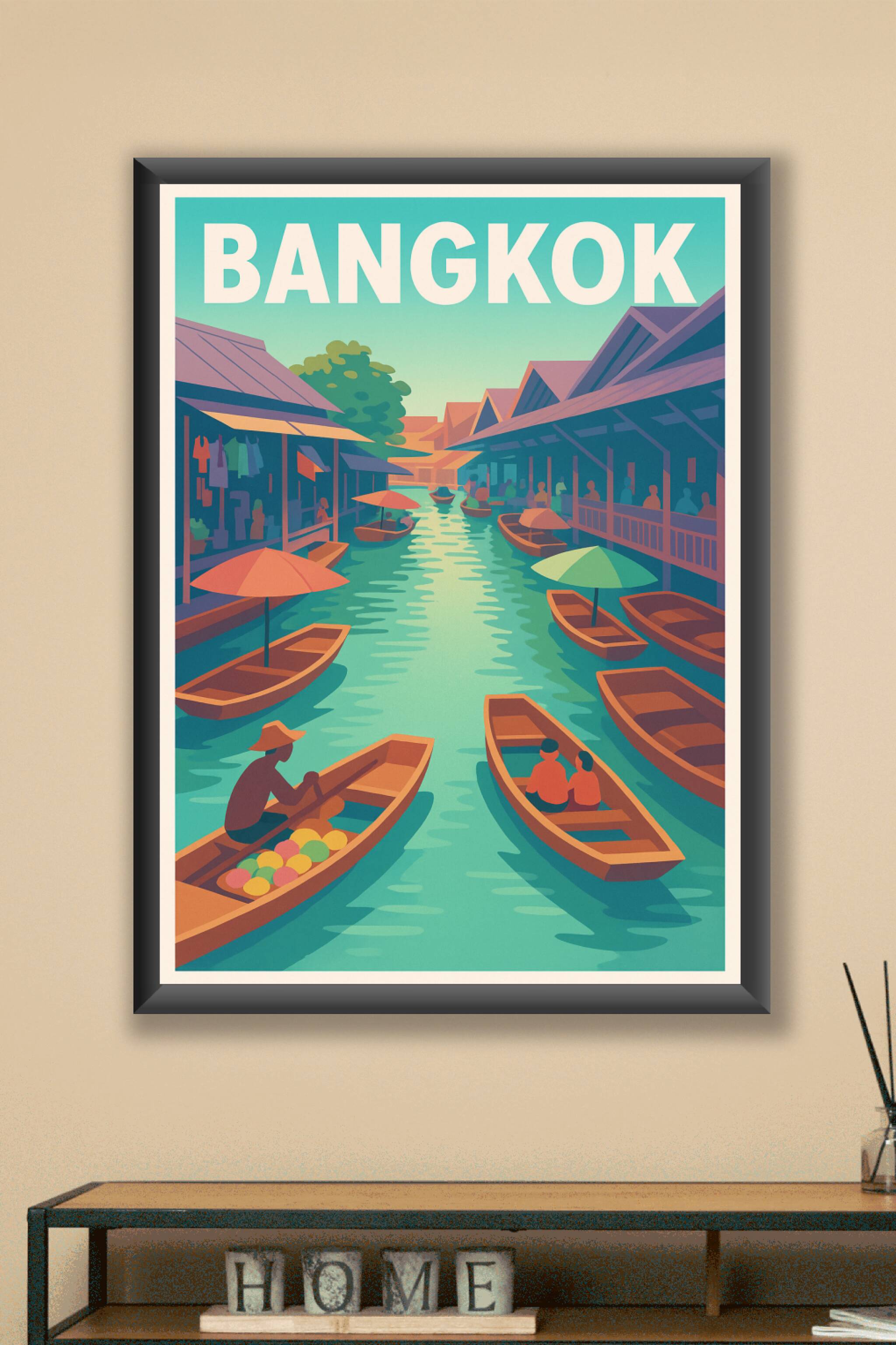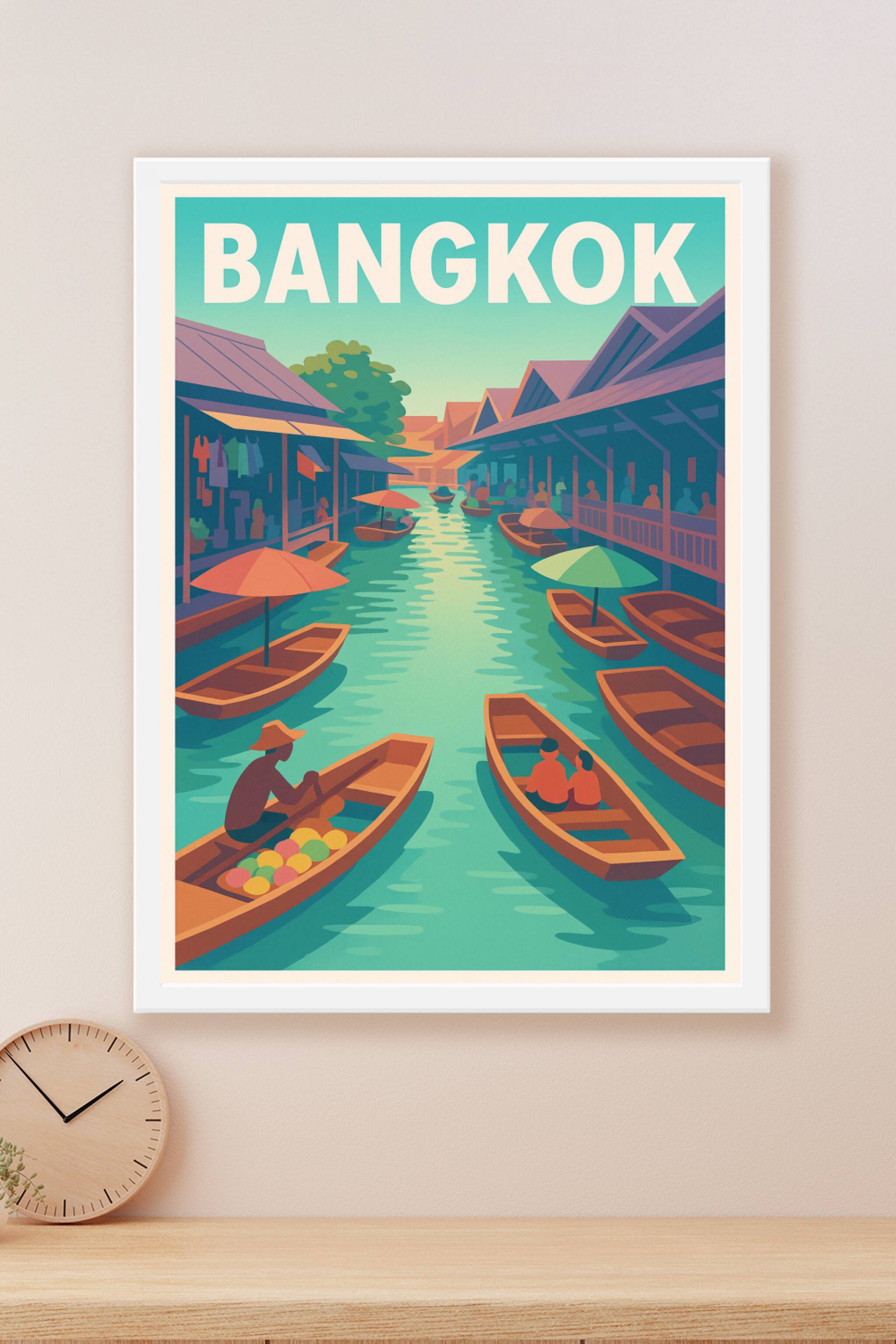 Découvrez l'atmosphère unique des marchés flottants de Bangkok à travers cette affiche illustrée au style vintage chaleureux. Les barques colorées ...