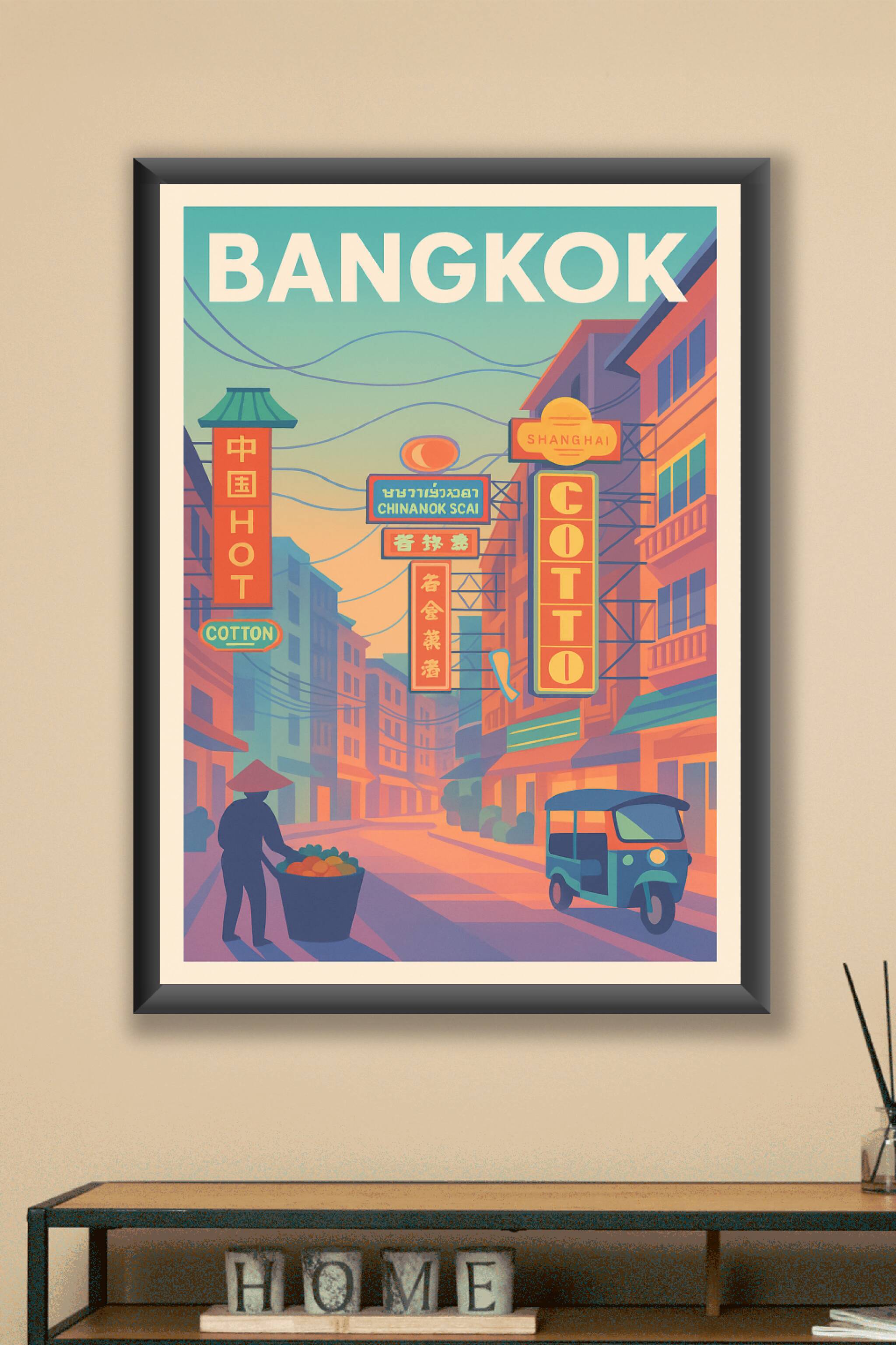 Découvrez l'atmosphère vibrante et pleine de vie de Bangkok à travers cette affiche illustrée aux teintes chaudes et au style rétro moderne. Cette scène urbaine met en avant les enseignes lumineuses, les ruelles animées et les véhicules emblématiques de la capitale thaïlandaise.Ce poster est imprimé en tirage "Fine Art" sur un papier 305g coton de haute qualité, garantissant des couleurs éclatantes et une durabilité exceptionnelle. Disponible en formats A1 à A4, avec ou sans cadre, cette affiche apportera une touche d'exotisme et de dynamisme à votre décoration intérieure.Profitez d'une impression premium, 100% fabriquée en France, pour sublimer votre intérieur ou offrir un cadeau élégant aux passionnés de voyages et de culture asiatique.