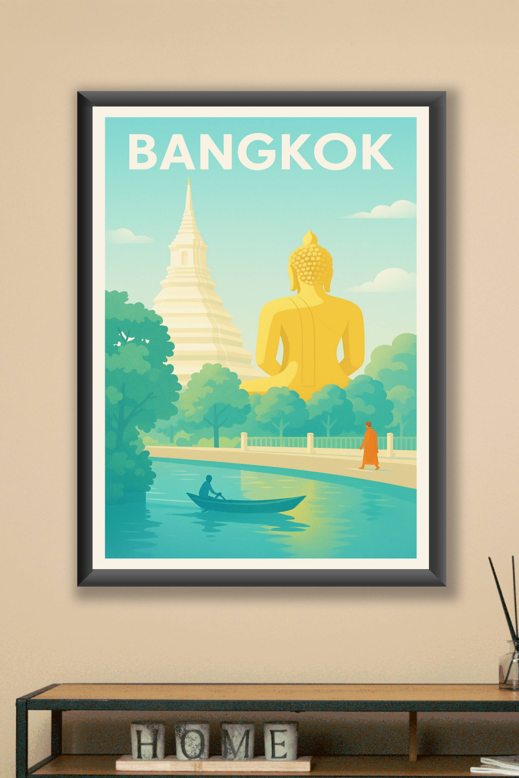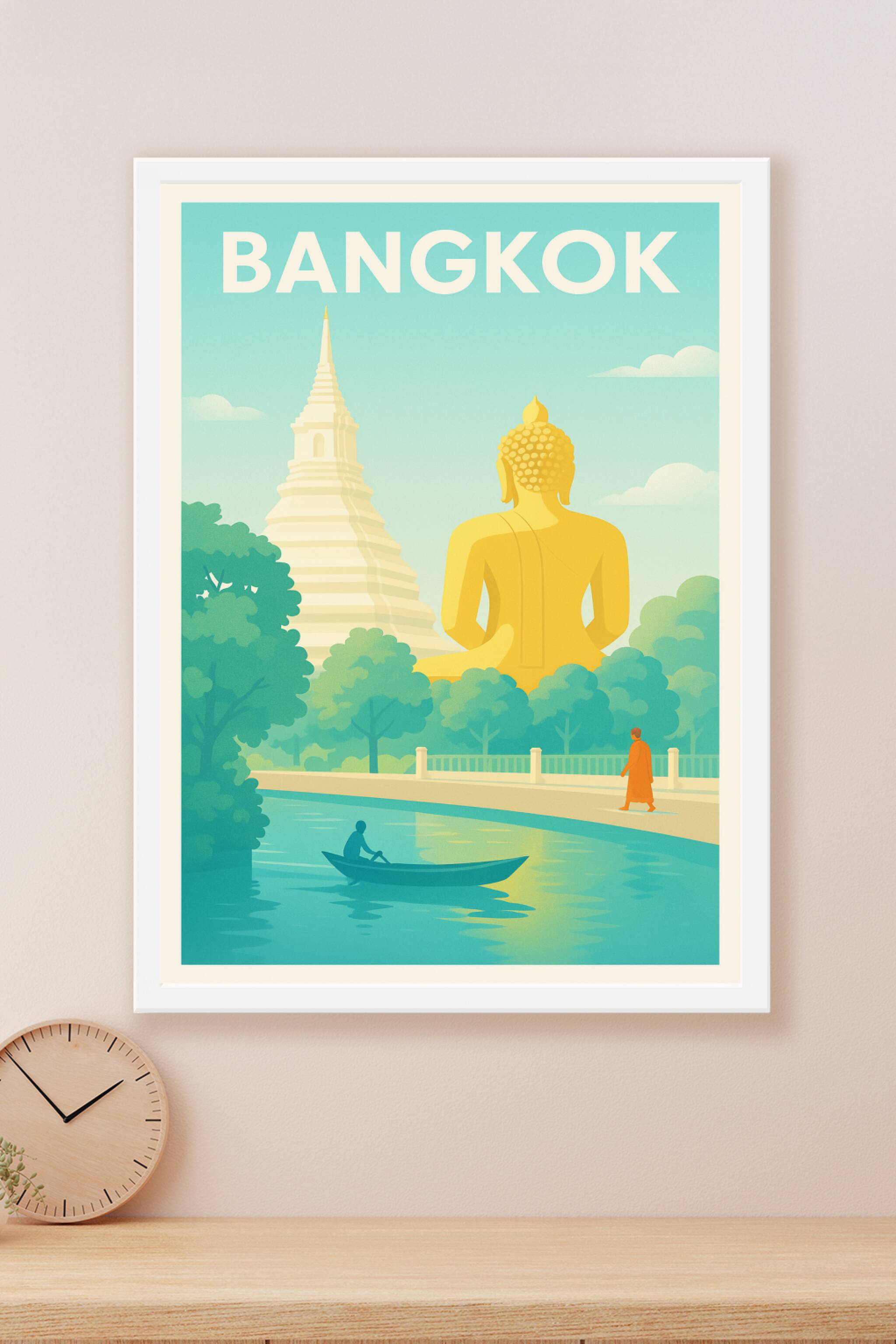 Découvrez la tranquillité et la richesse culturelle de Bangkok à travers cette affiche élégante qui met en avant un Bouddha doré majestueux, un pra...