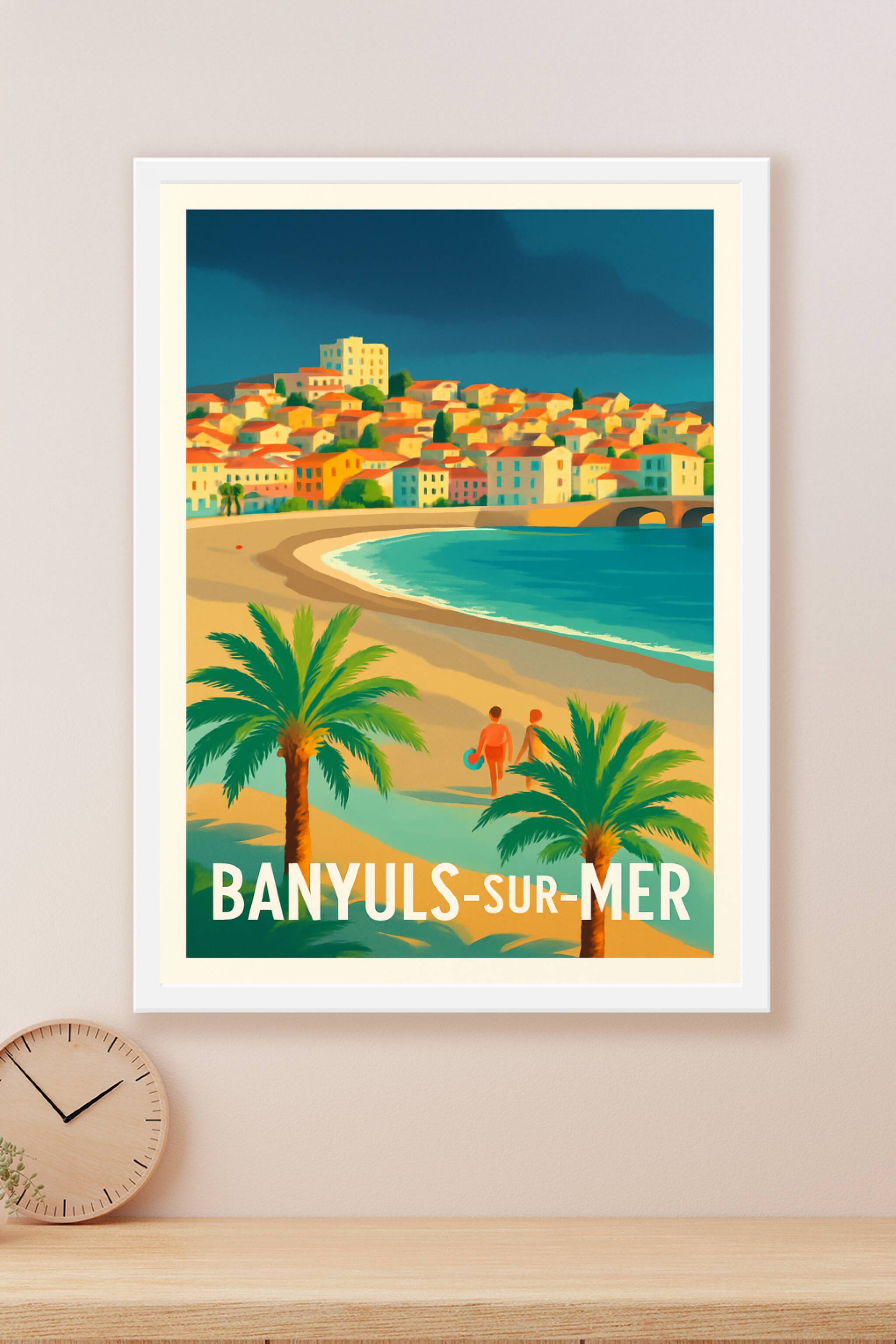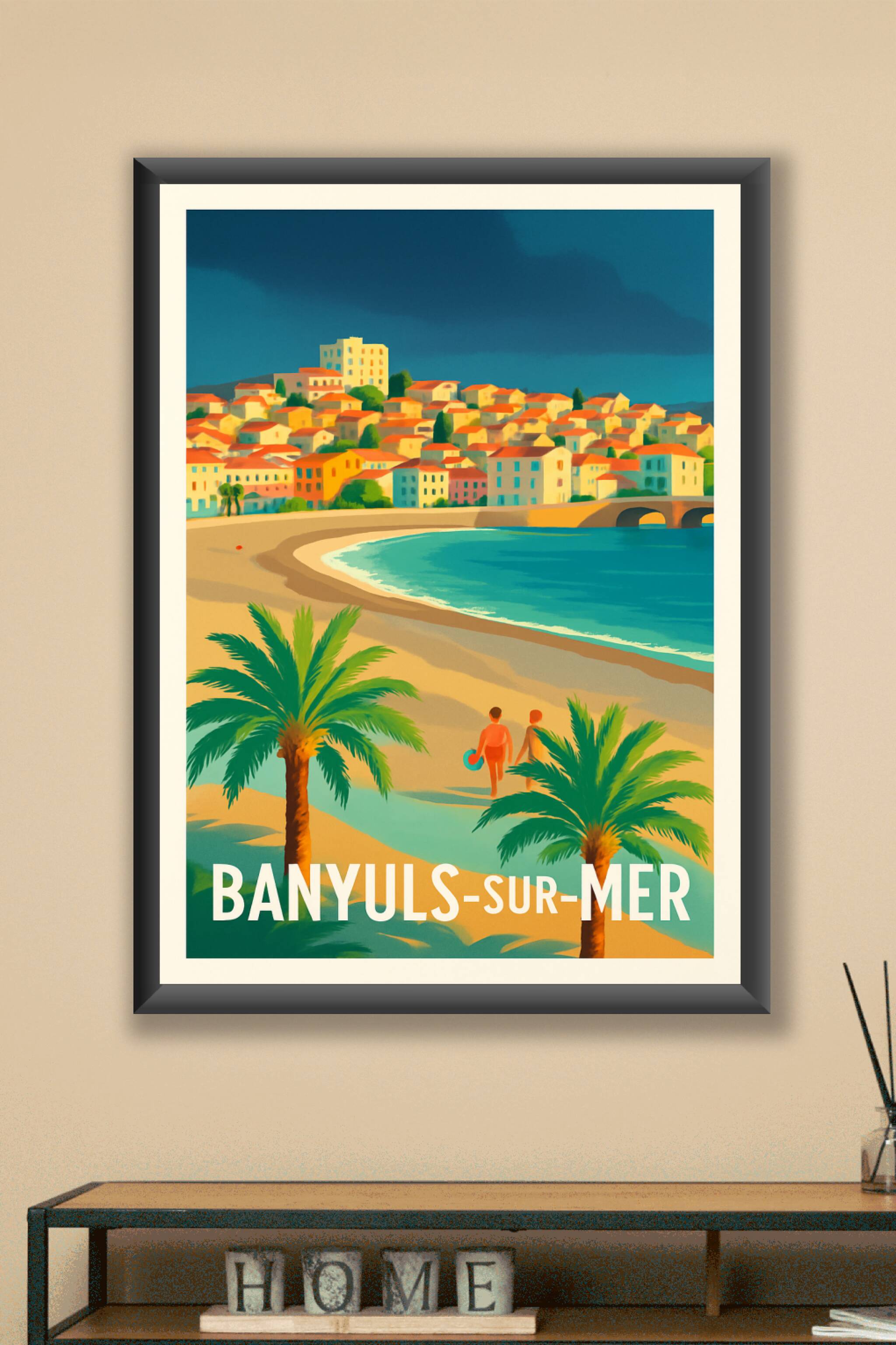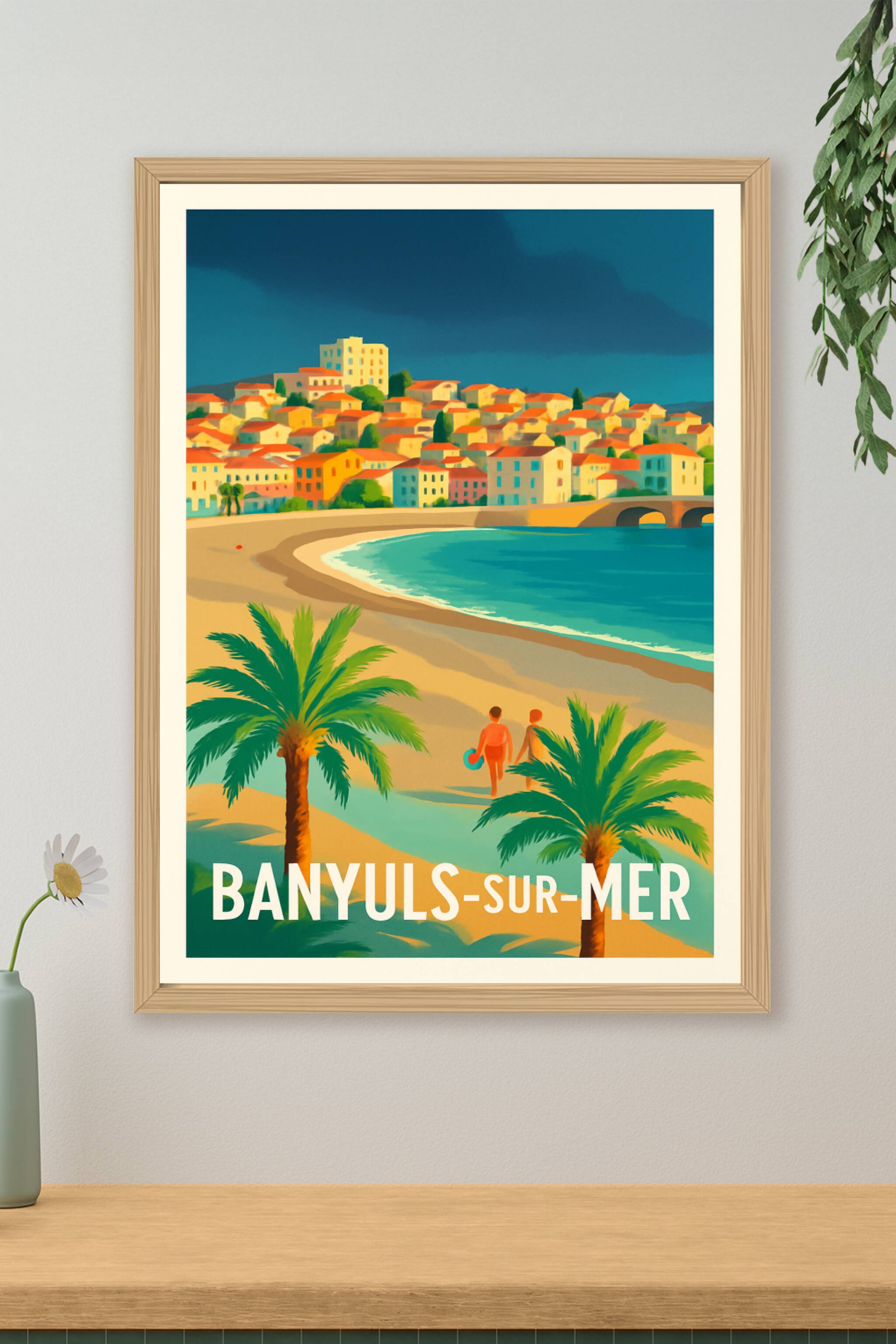Découvrez le charme pittoresque de Banyuls-sur-Mer avec cette affiche vintage qui met en lumière ses plages dorées et ses maisons colorées au bord ...