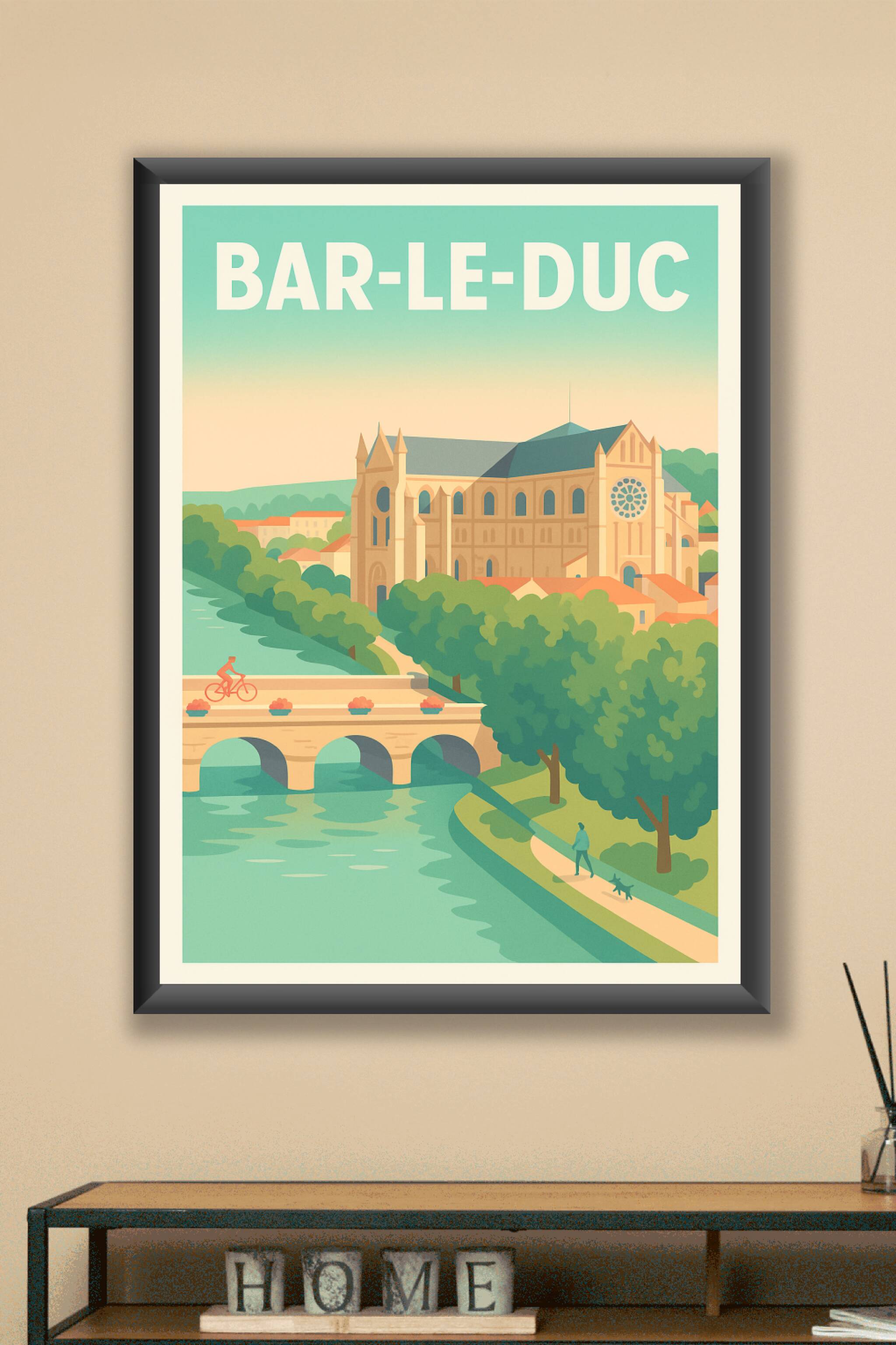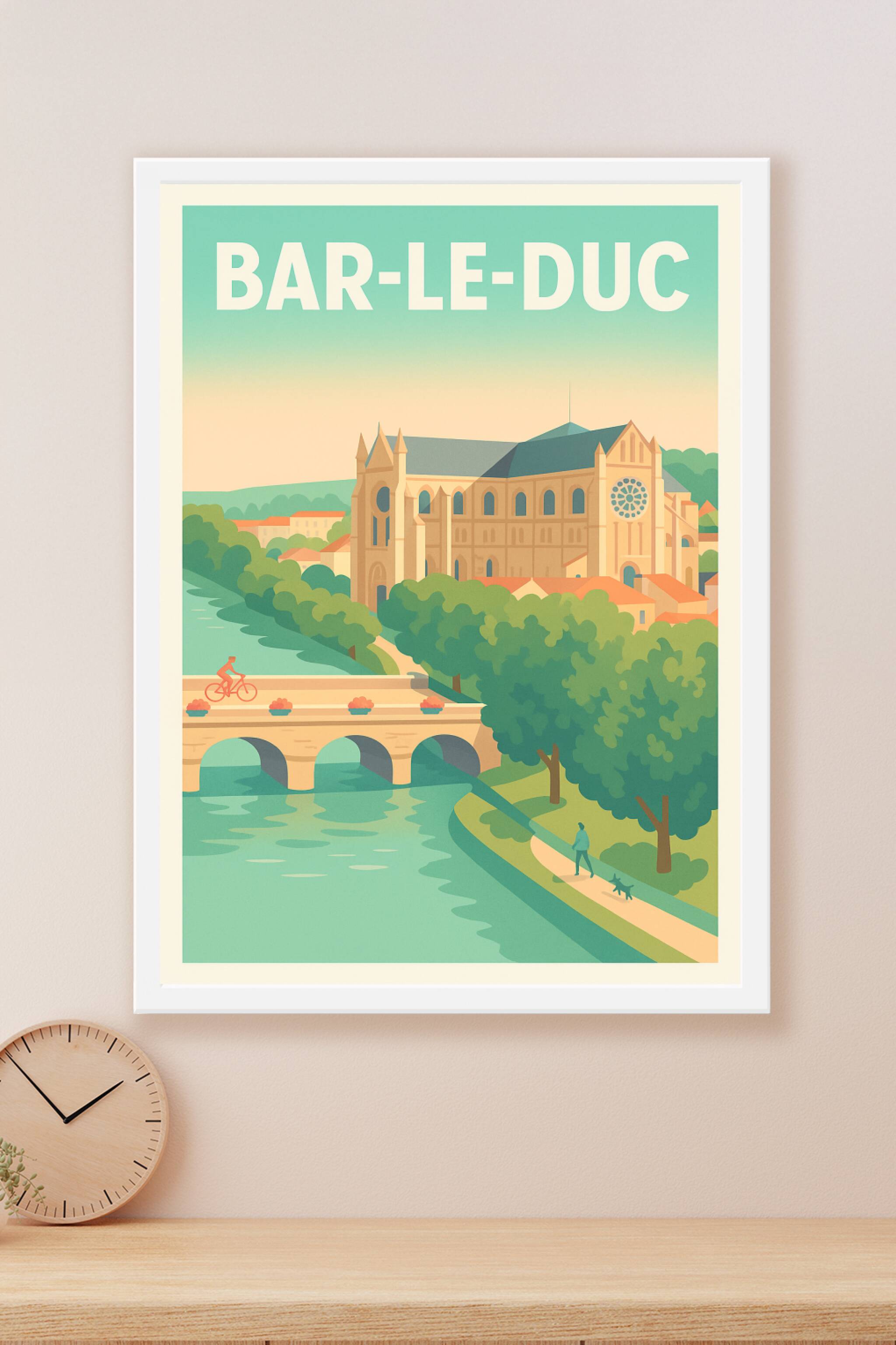 Découvrez l'élégance apaisante de Bar-le-Duc à travers cette affiche illustrée qui met en lumière son patrimoine architectural et ses paysages verdoyants. Le poster capture le pont et la basilique emblématique, ainsi que la douceur de vie au bord de la rivière. Disponible en tirage "Fine Art" sur papier 305g coton, cette affiche garantit une qualité d'impression exceptionnelle et des couleurs éclatantes pour sublimer votre intérieur. Proposée en formats A1 à A4, avec ou sans cadre, elle est idéale pour apporter une touche artistique et authentique à votre décoration ou comme cadeau pour les amoureux de la Lorraine.